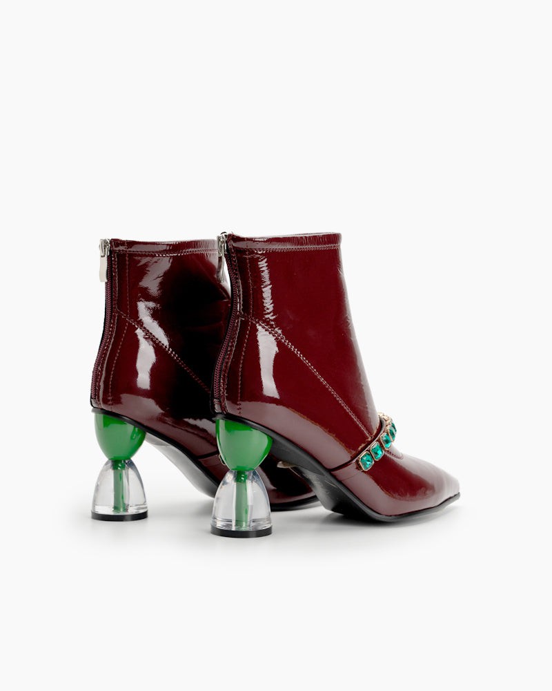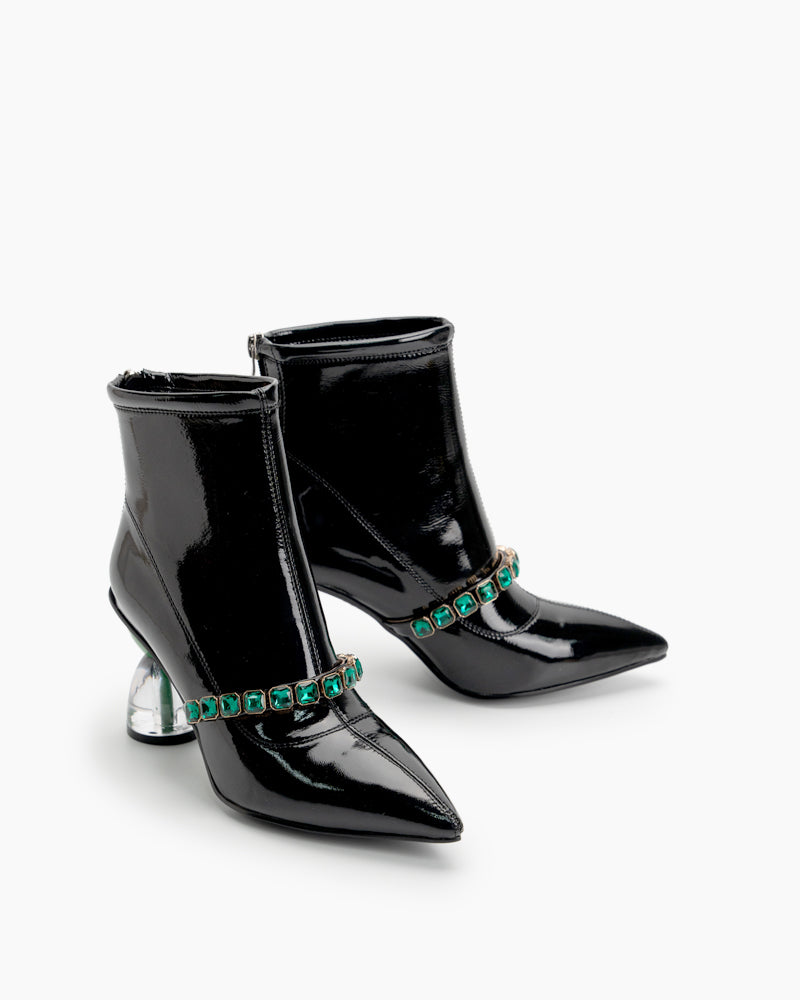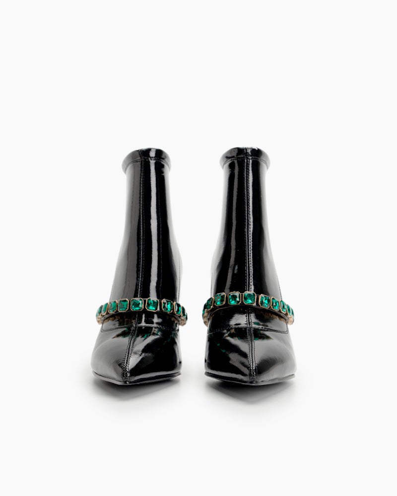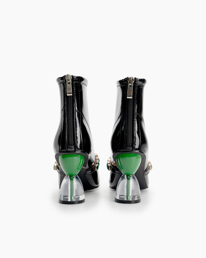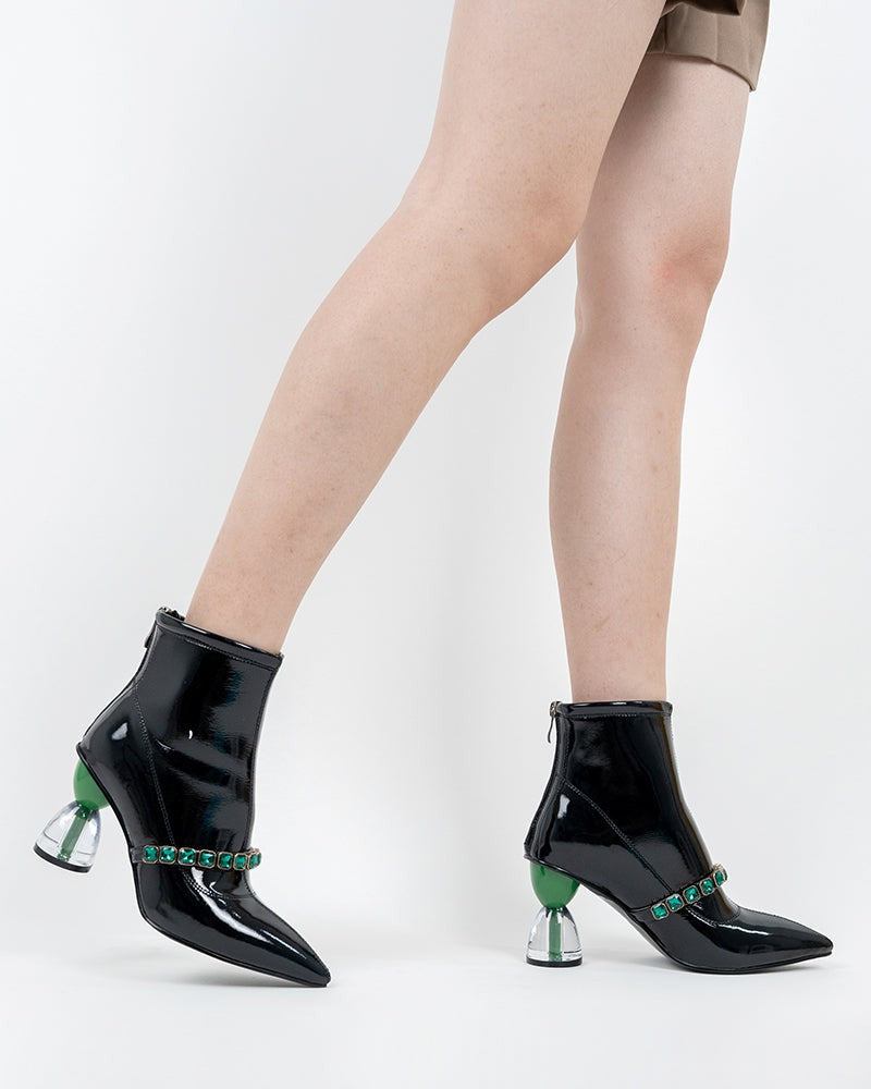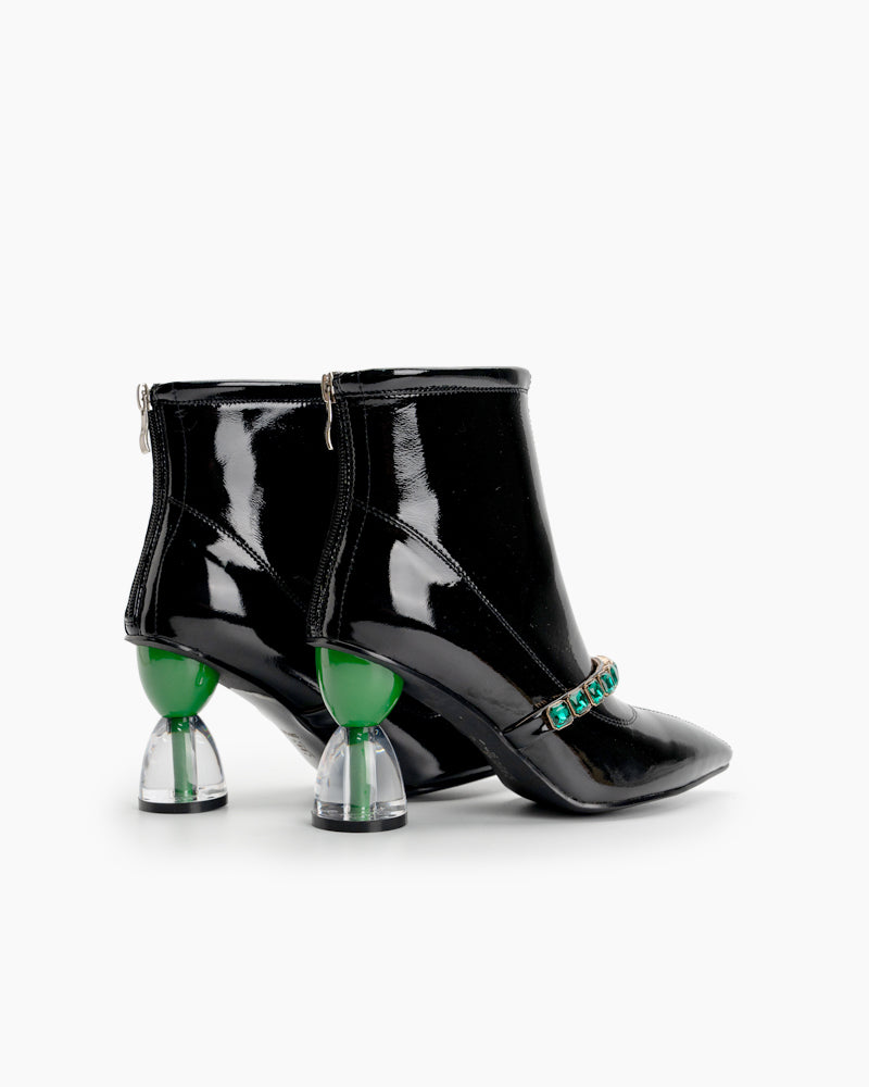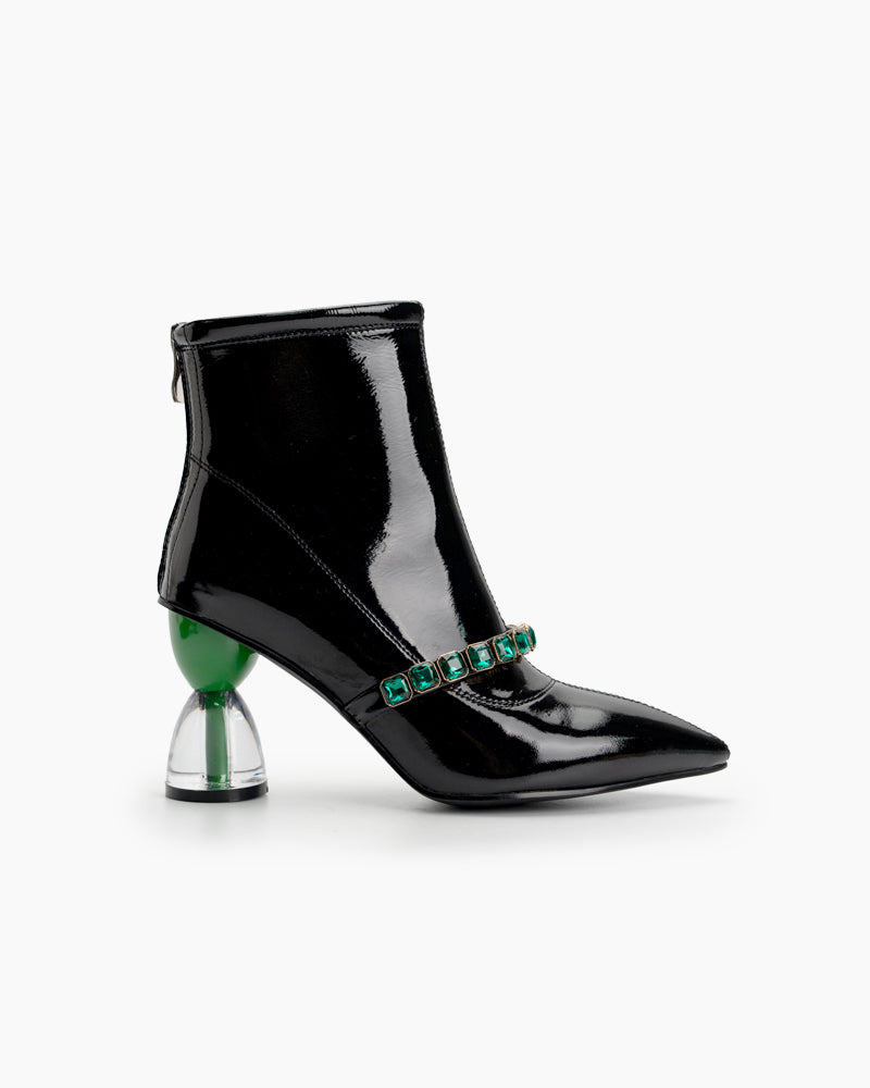 Back Zipper Lacquered Low Boots with Green Rhinestone