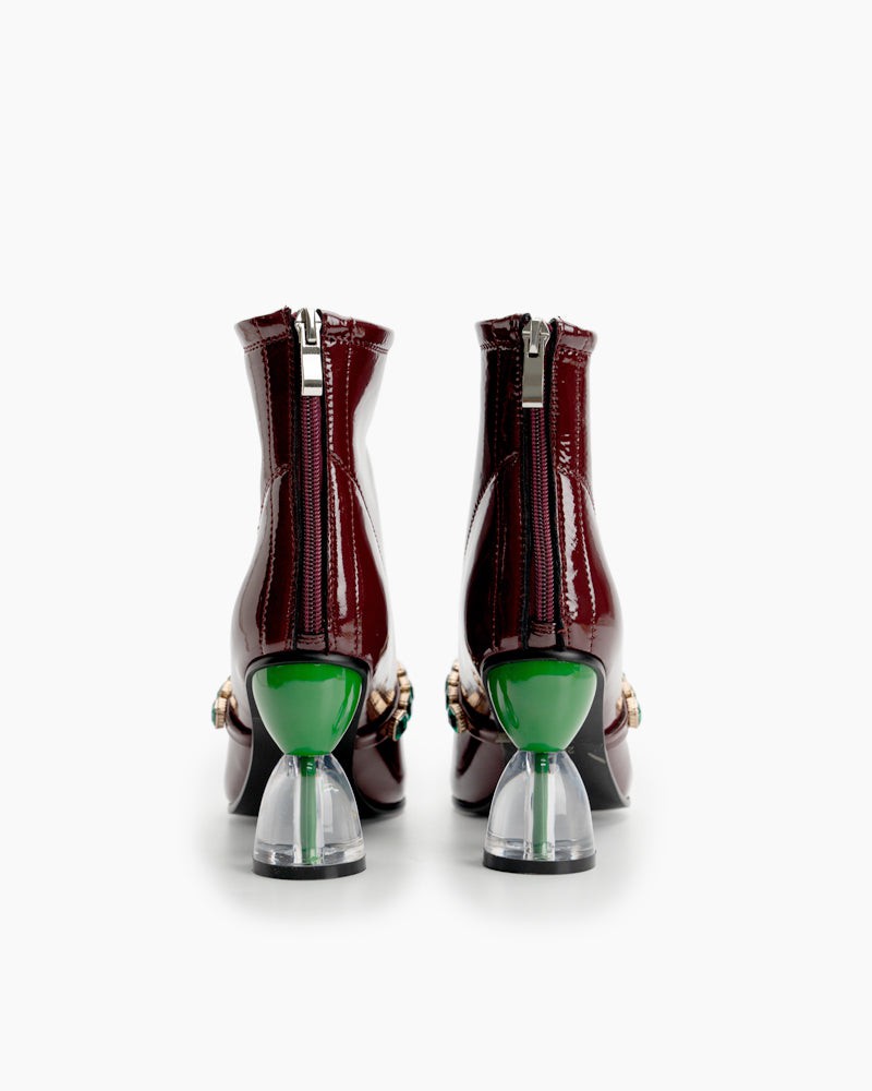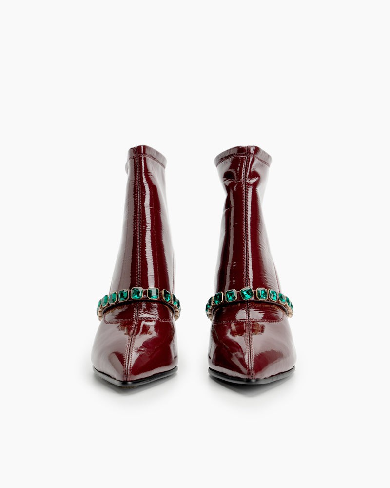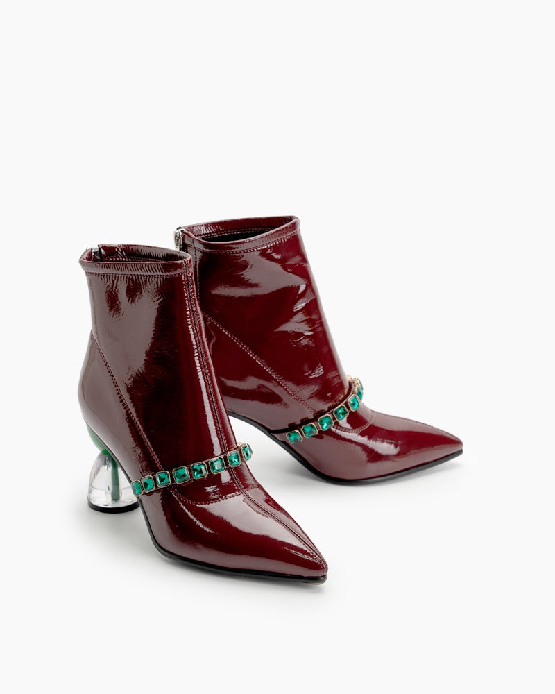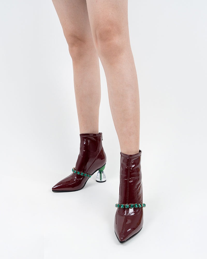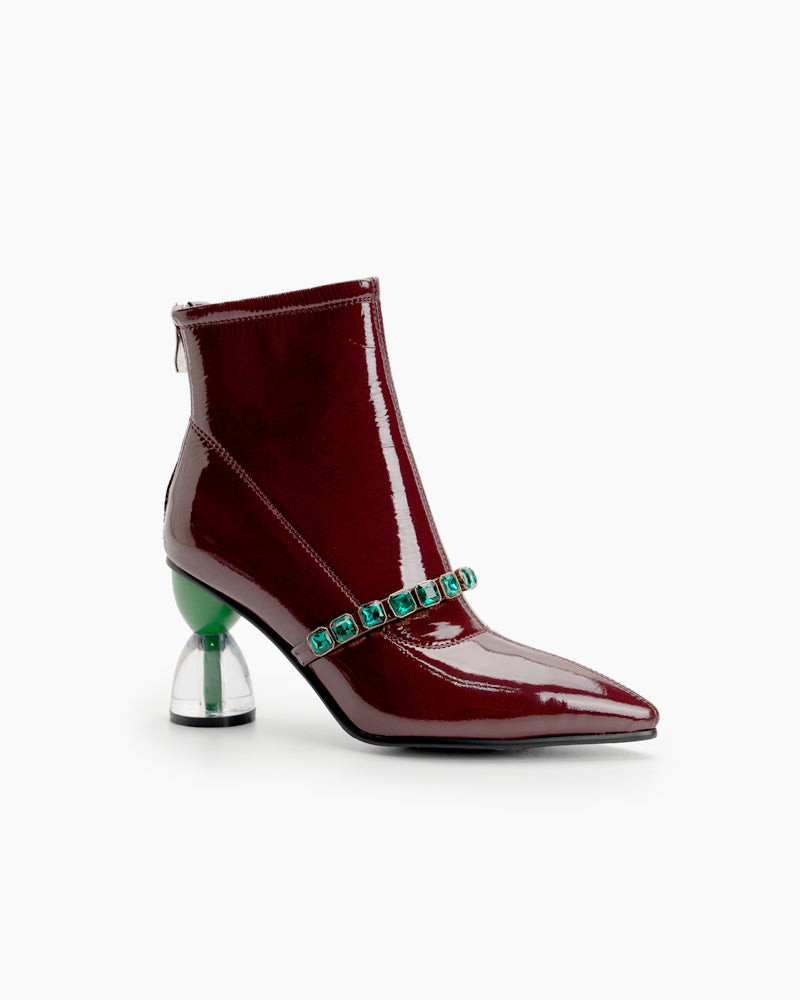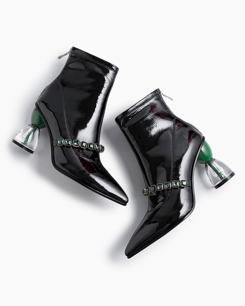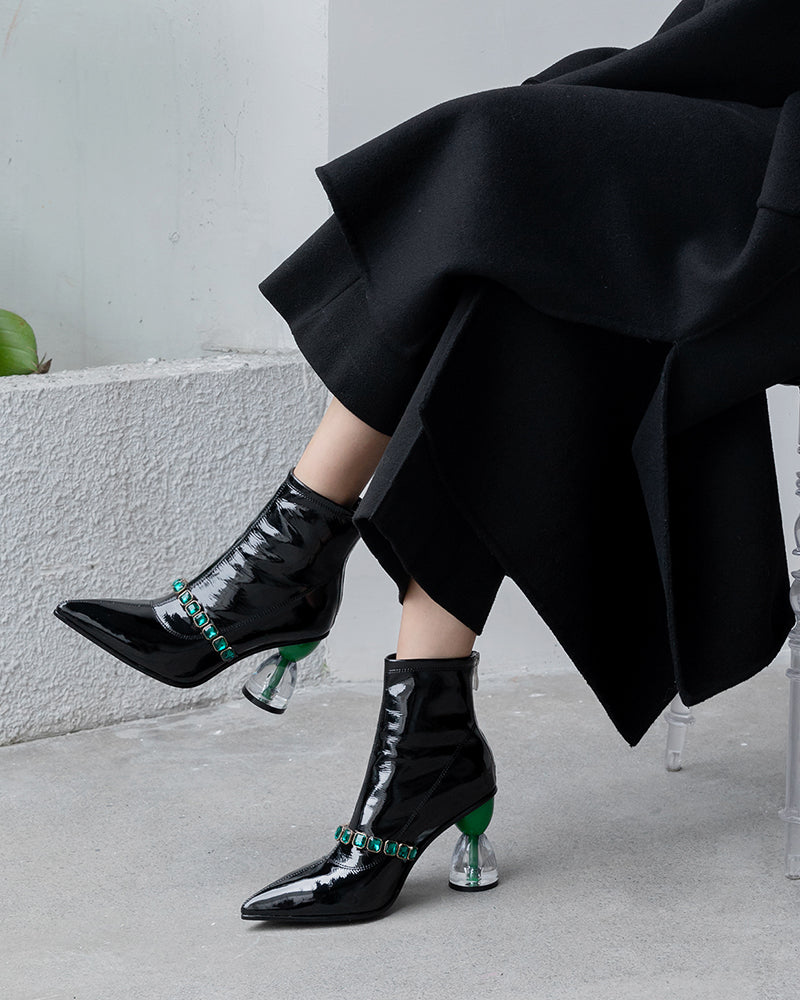 Back Zipper Lacquered Low Boots with Green Rhinestone