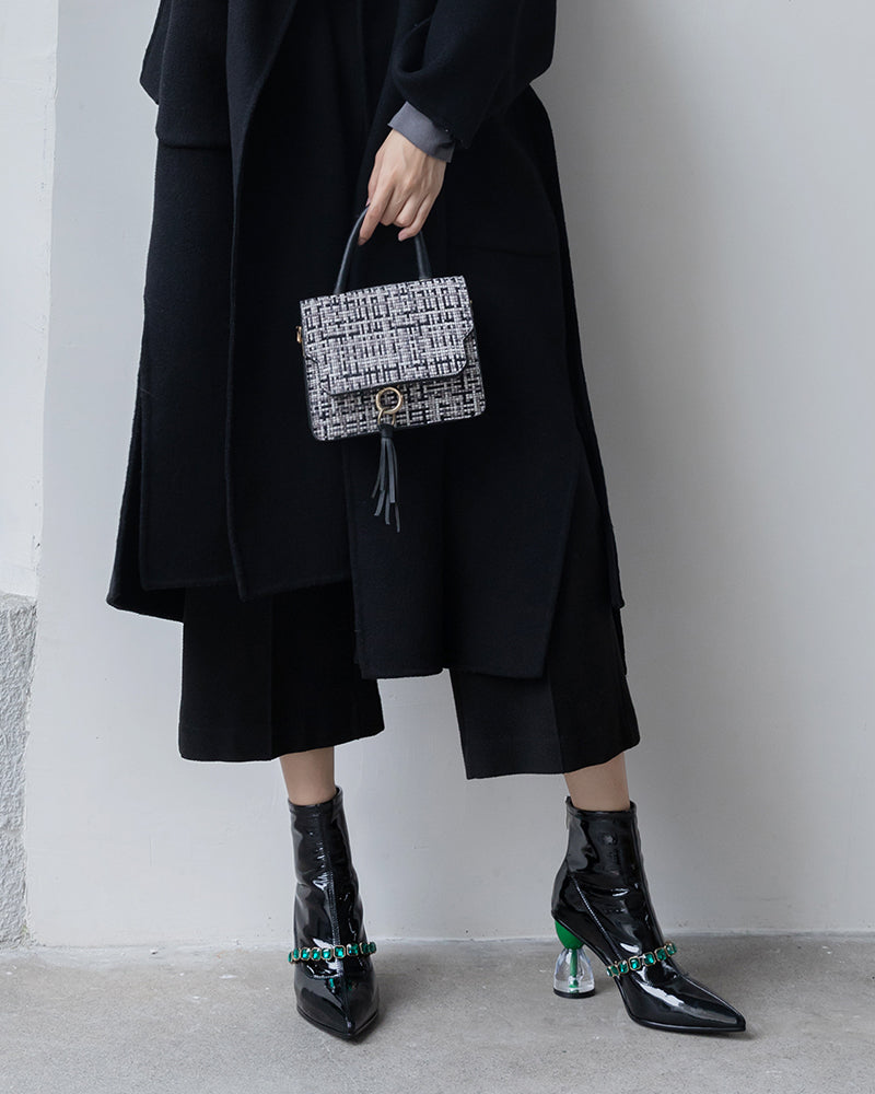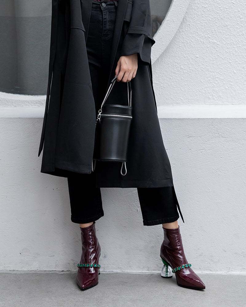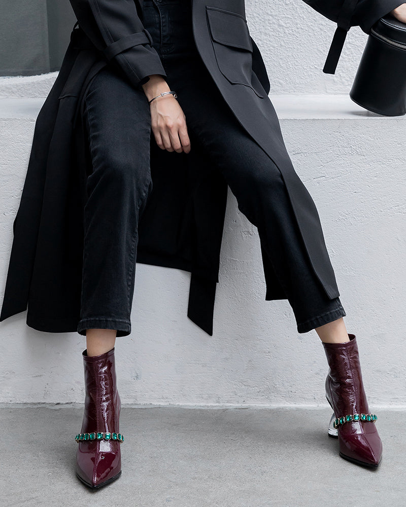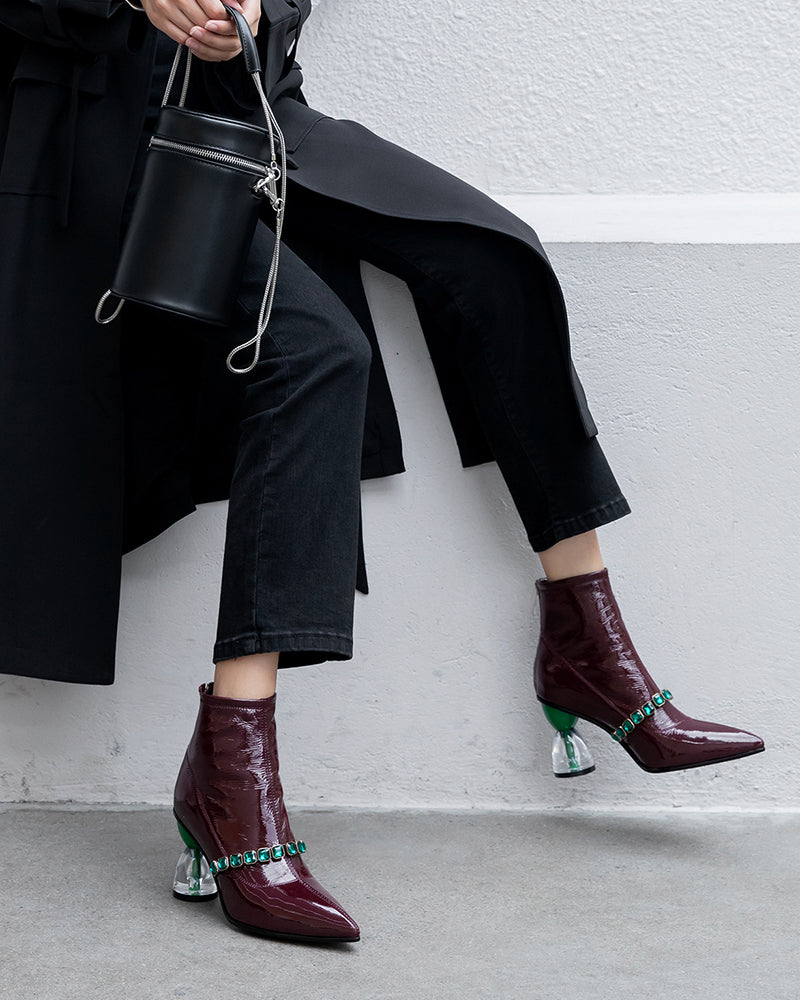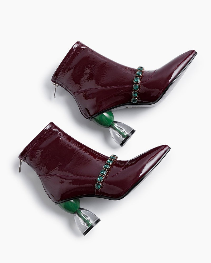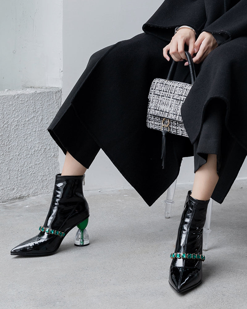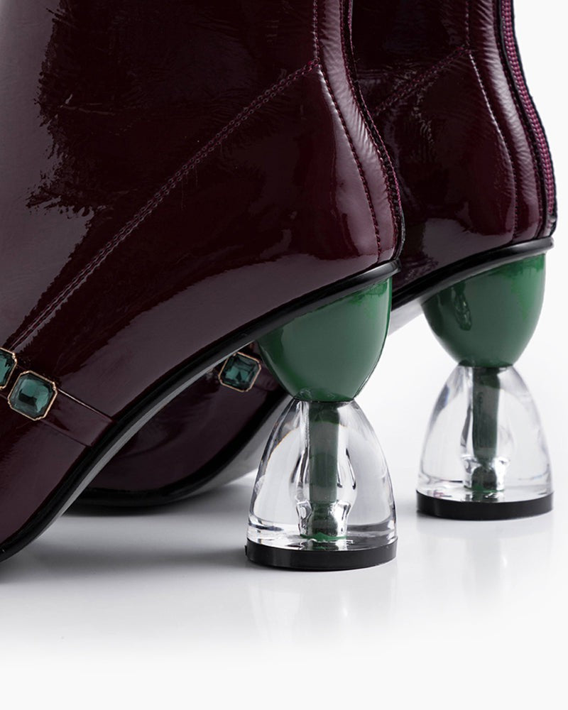 Back Zipper Lacquered Low Boots with Green Rhinestone
