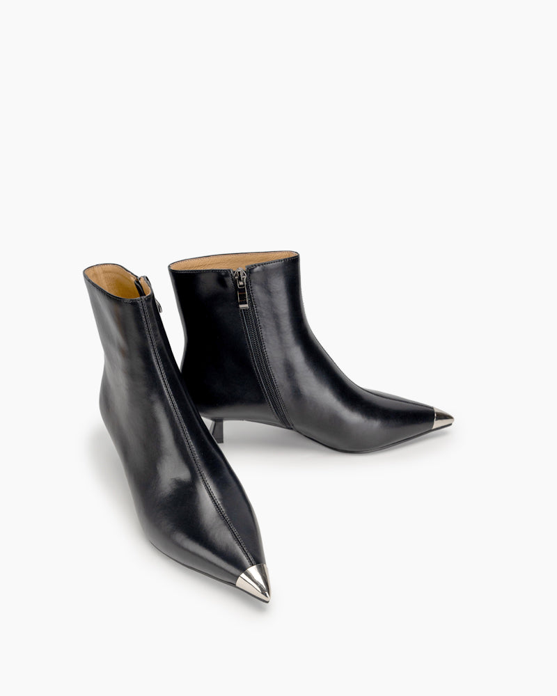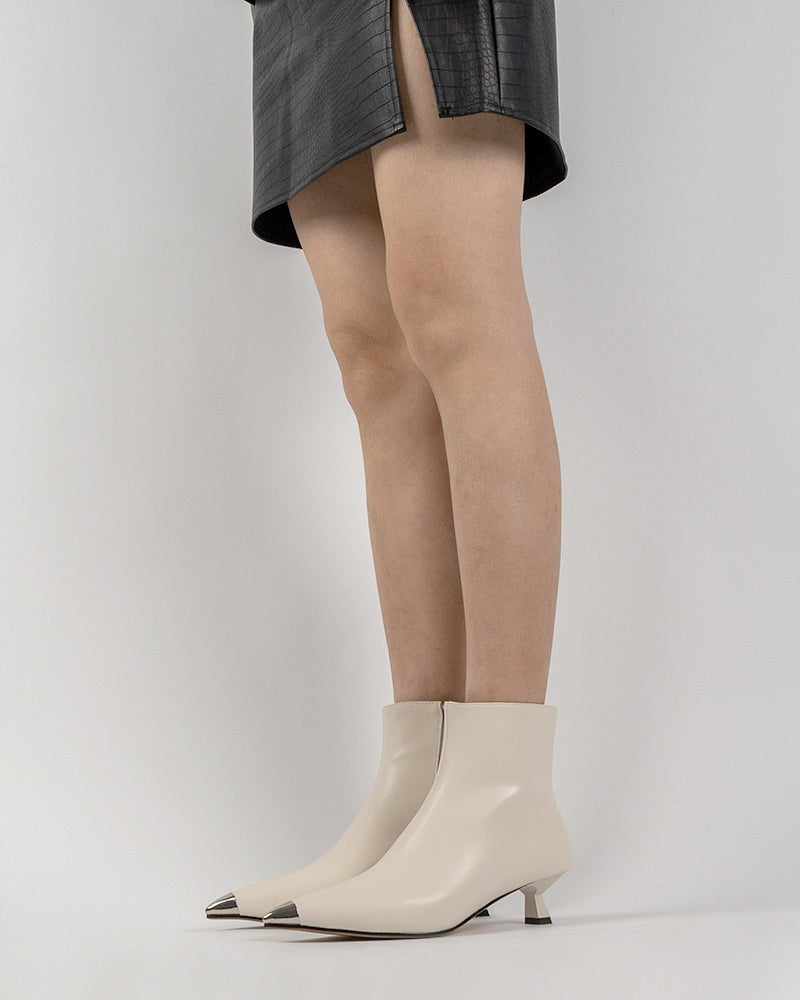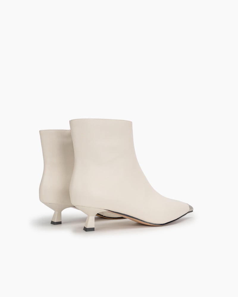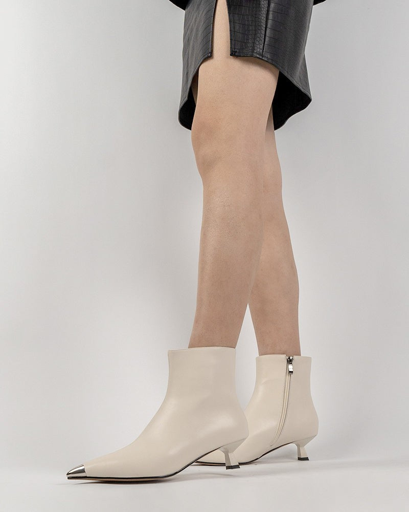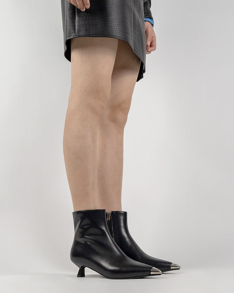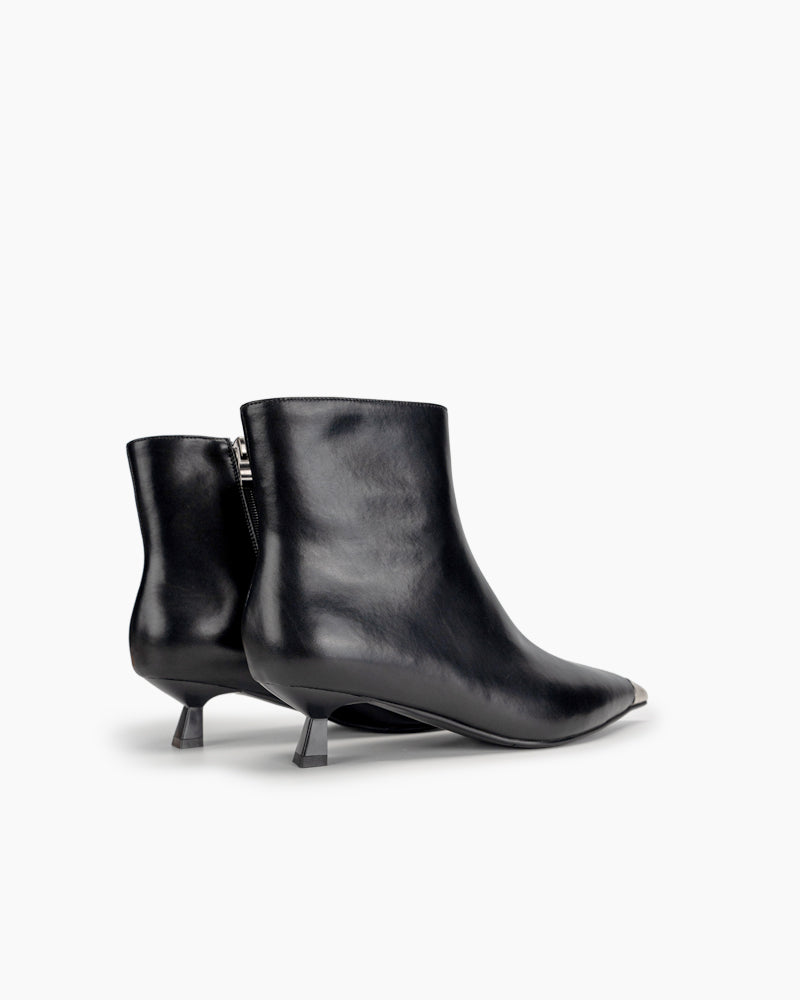 Metal Decoration Leather Kitten Heel Ankle Zipper Boots
