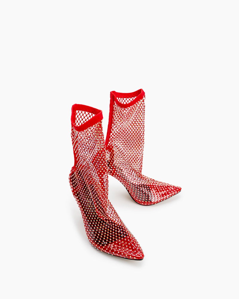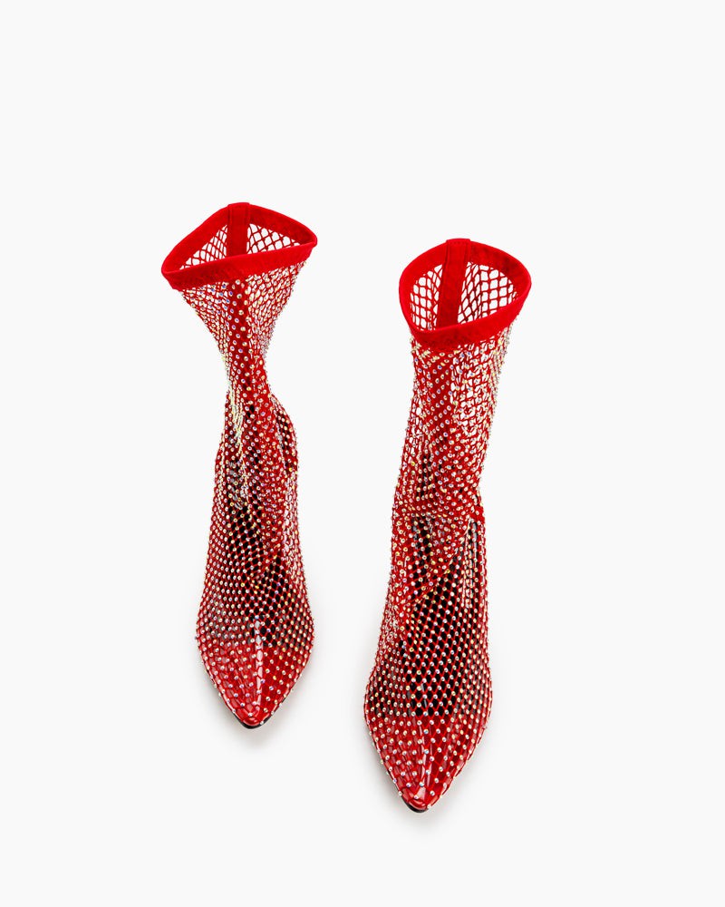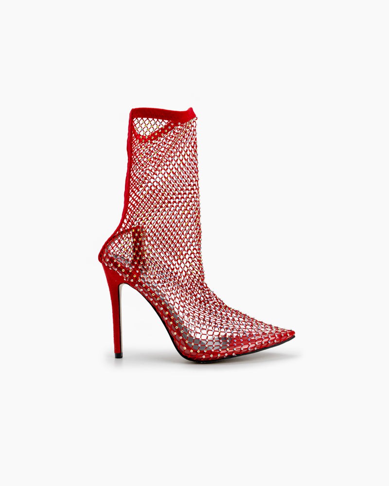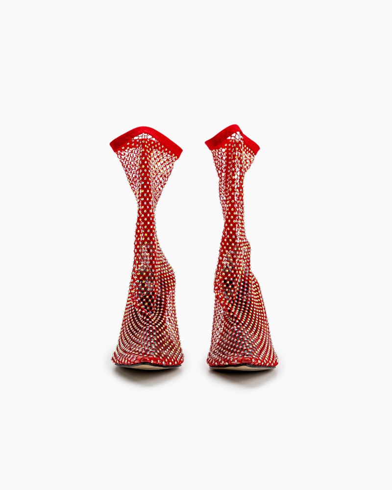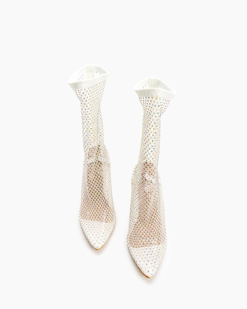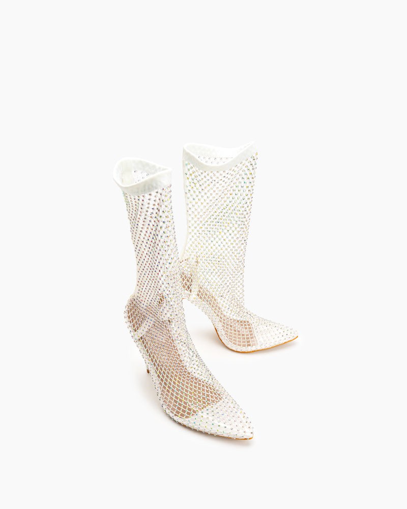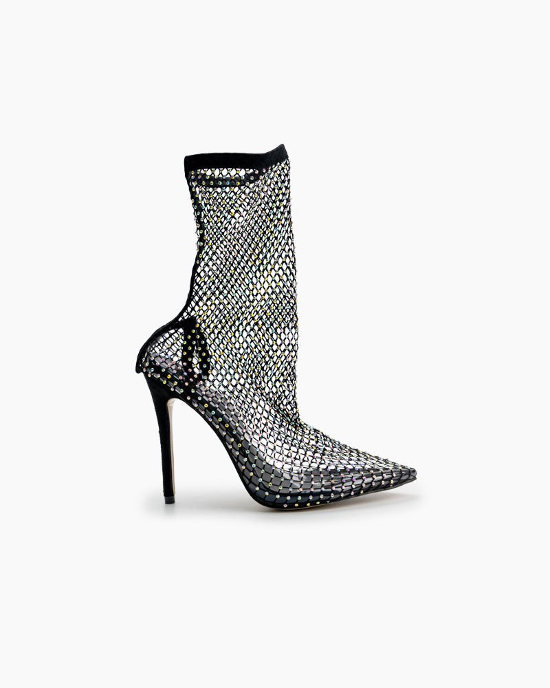 Pointed Toe Rhinestone Fishnet Stiletto Sock Boots