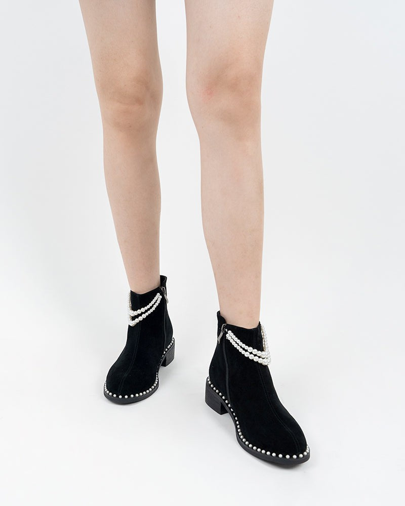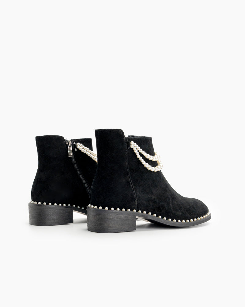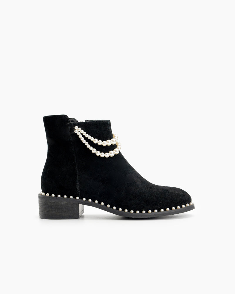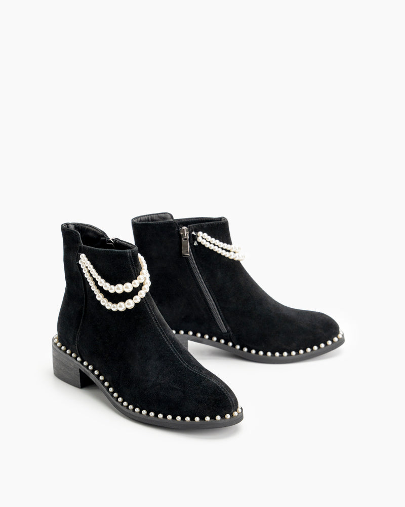 Suede Pearls Chain Round Toe Chunky Heel Ankle Boots