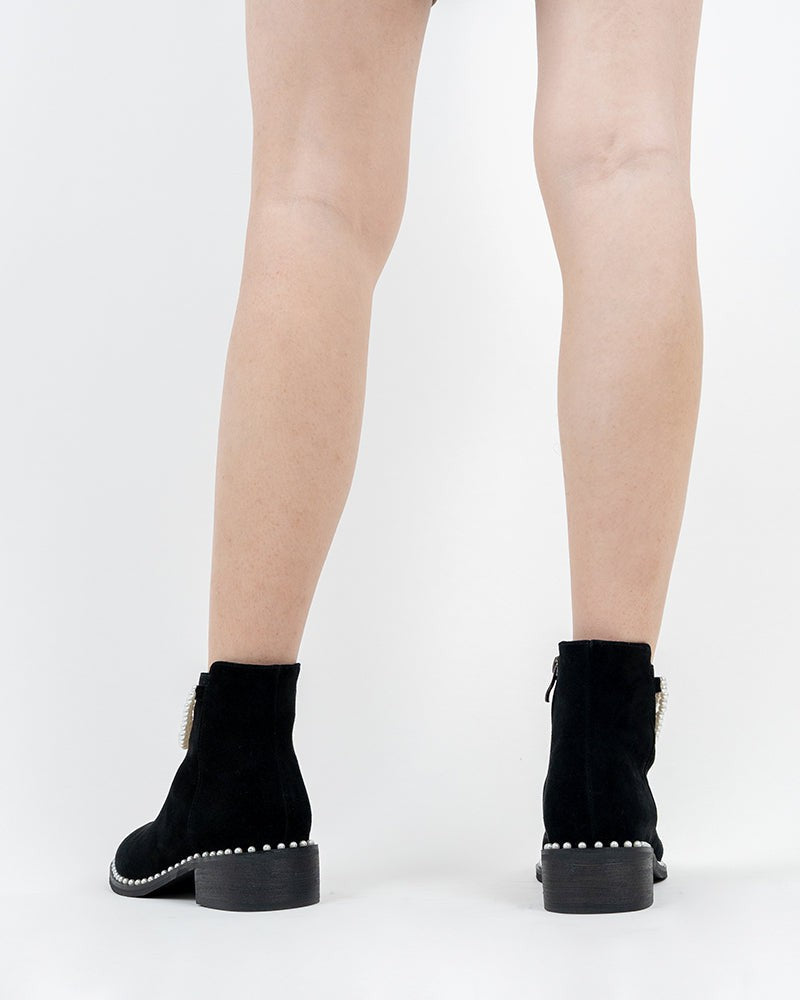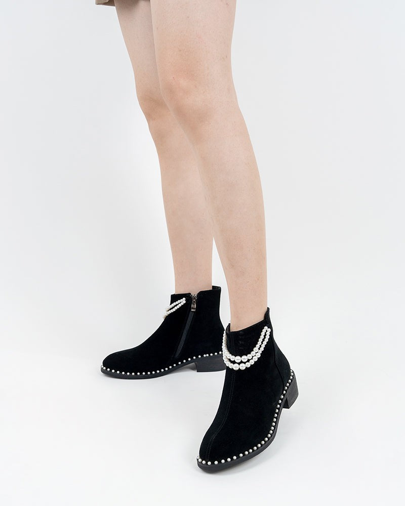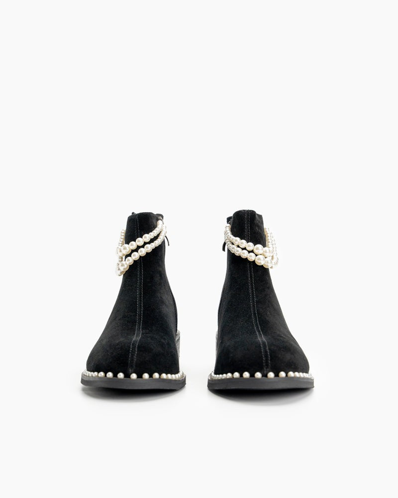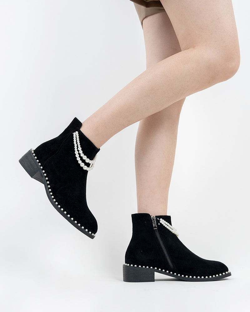 Suede Pearls Chain Round Toe Chunky Heel Ankle Boots