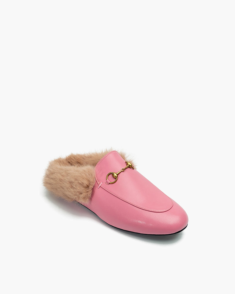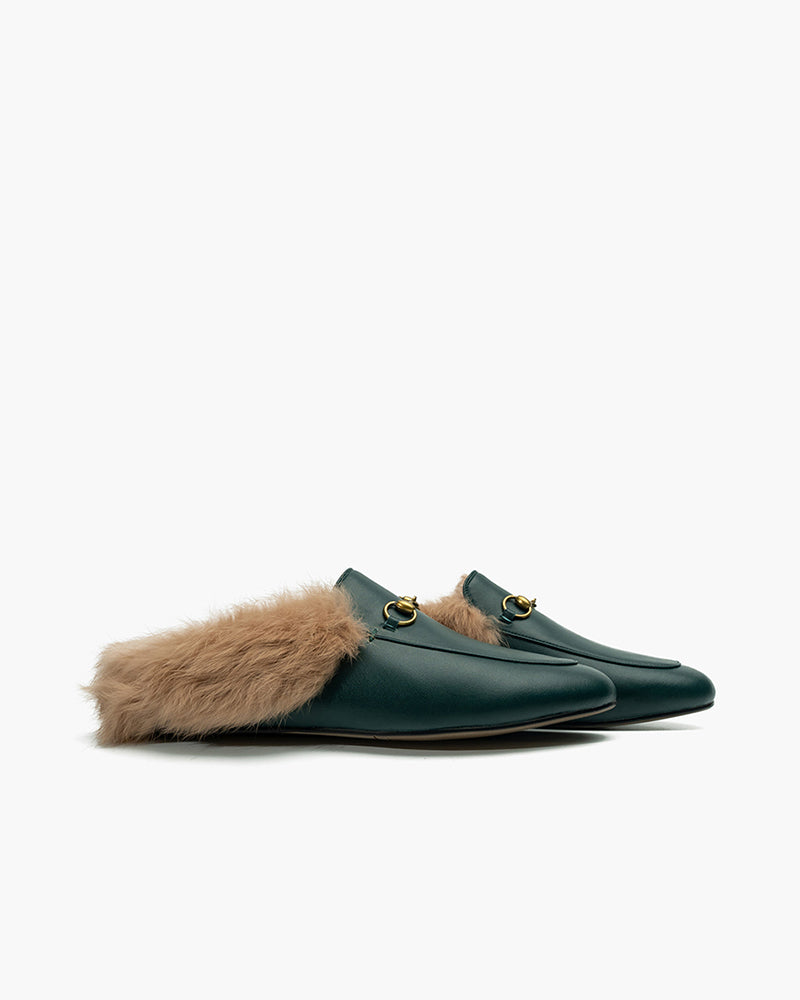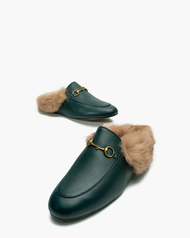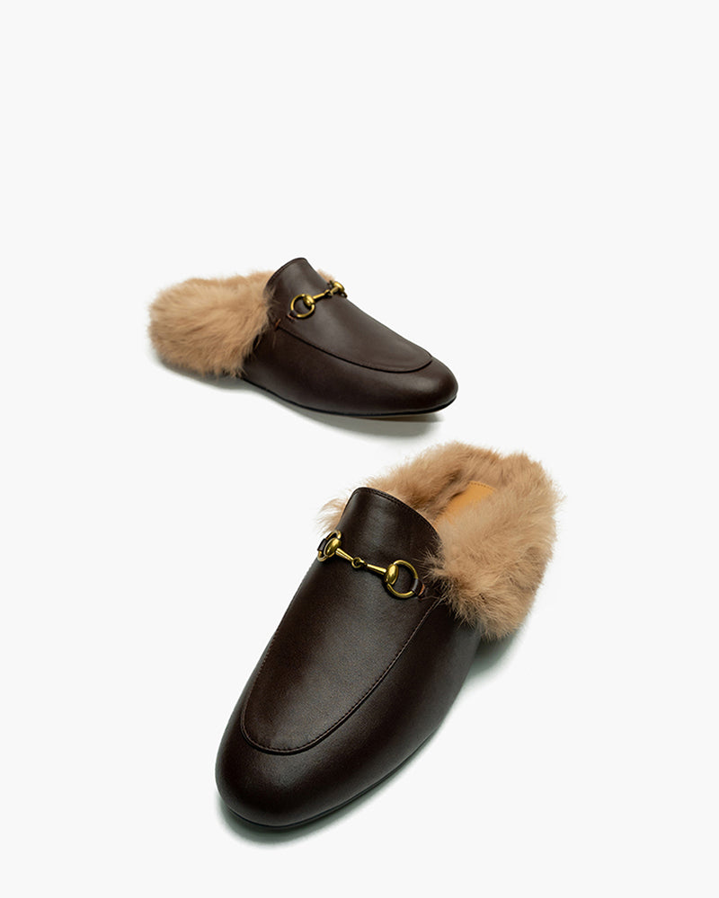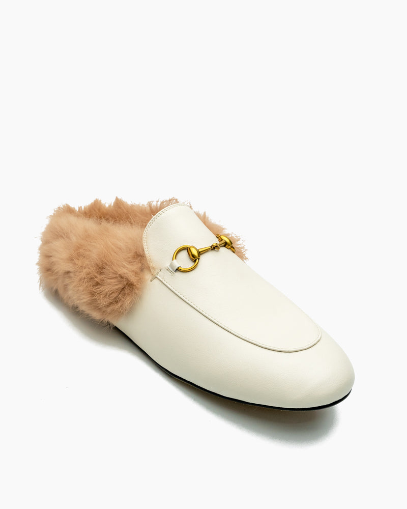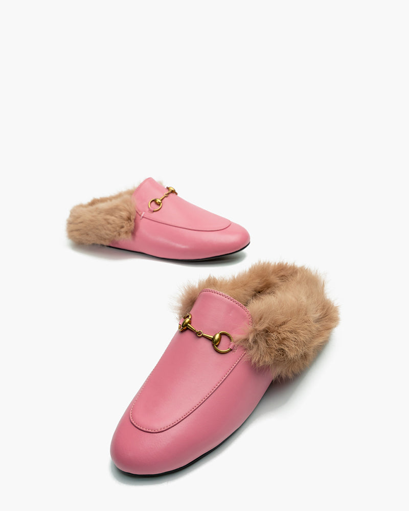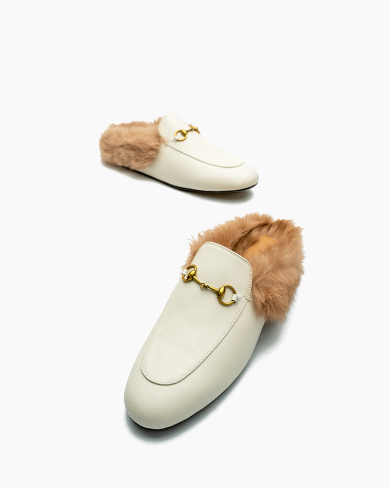 Classic Metal Buckle Backless Fur Flat Slippers Mules