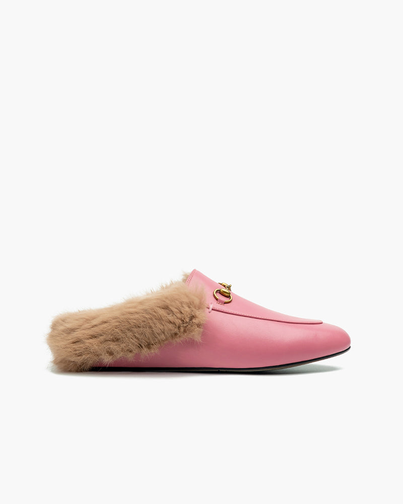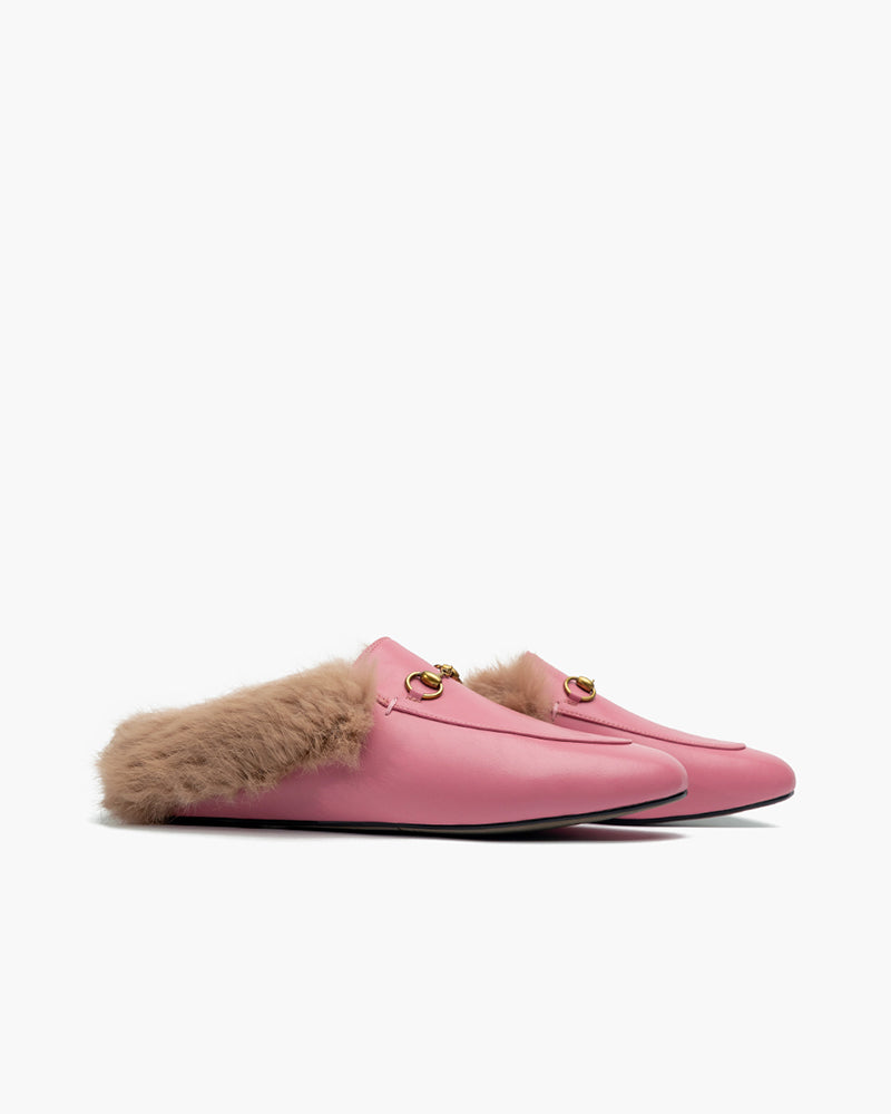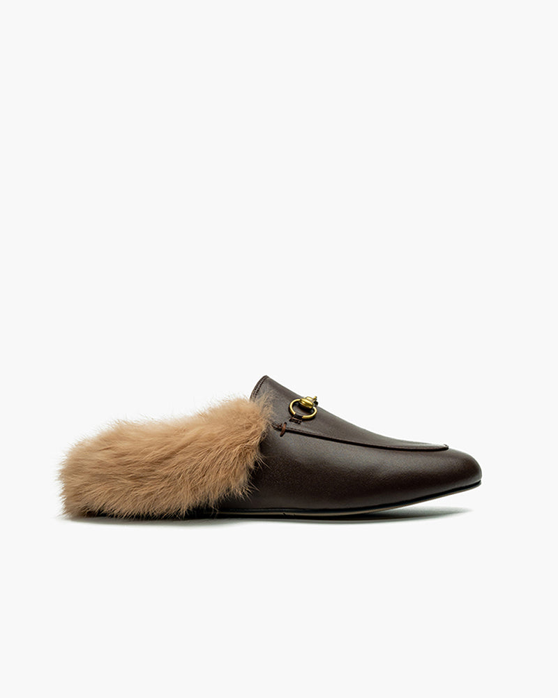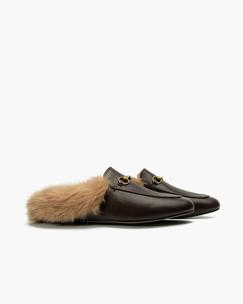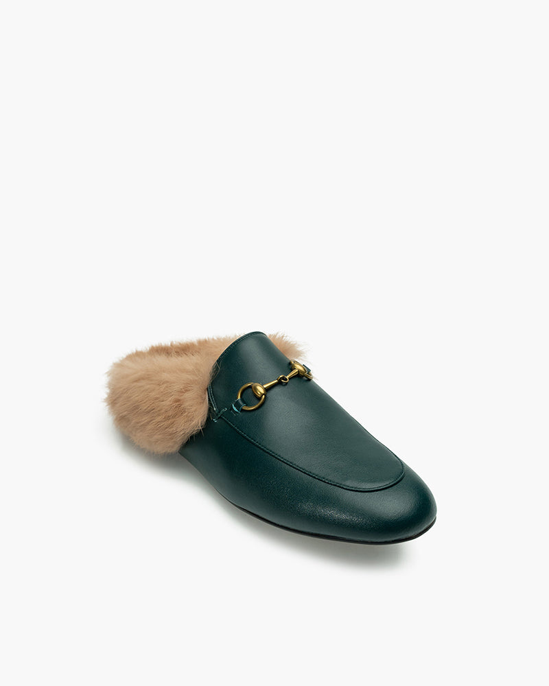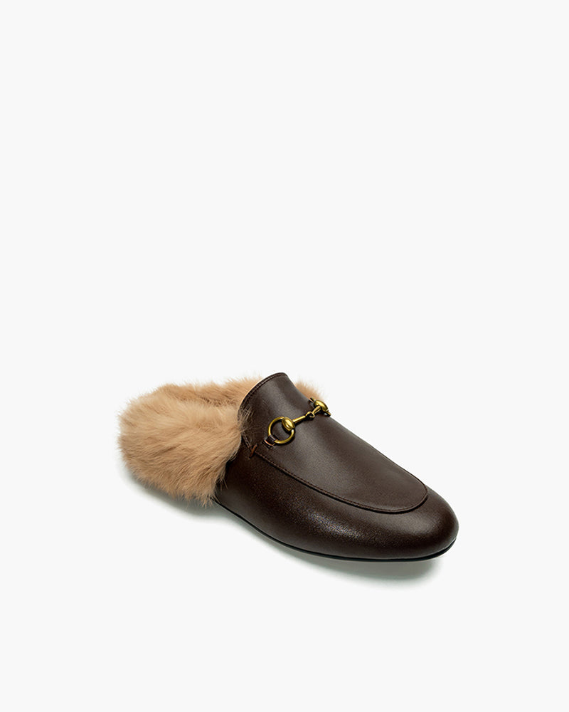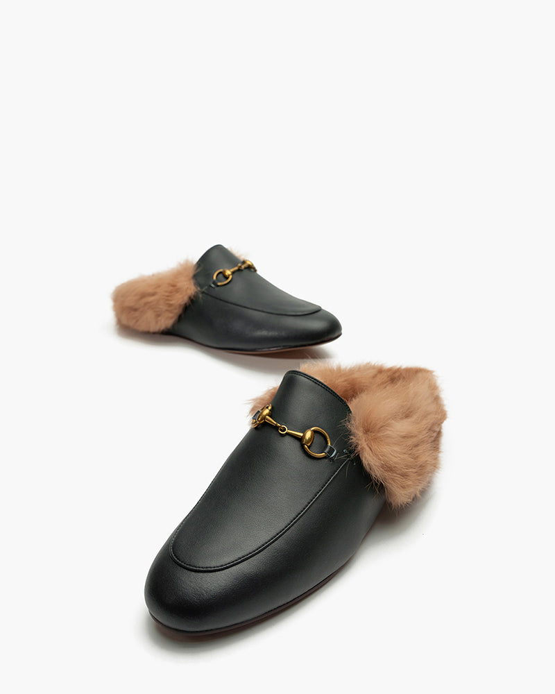 Classic Metal Buckle Backless Fur Flat Slippers Mules
