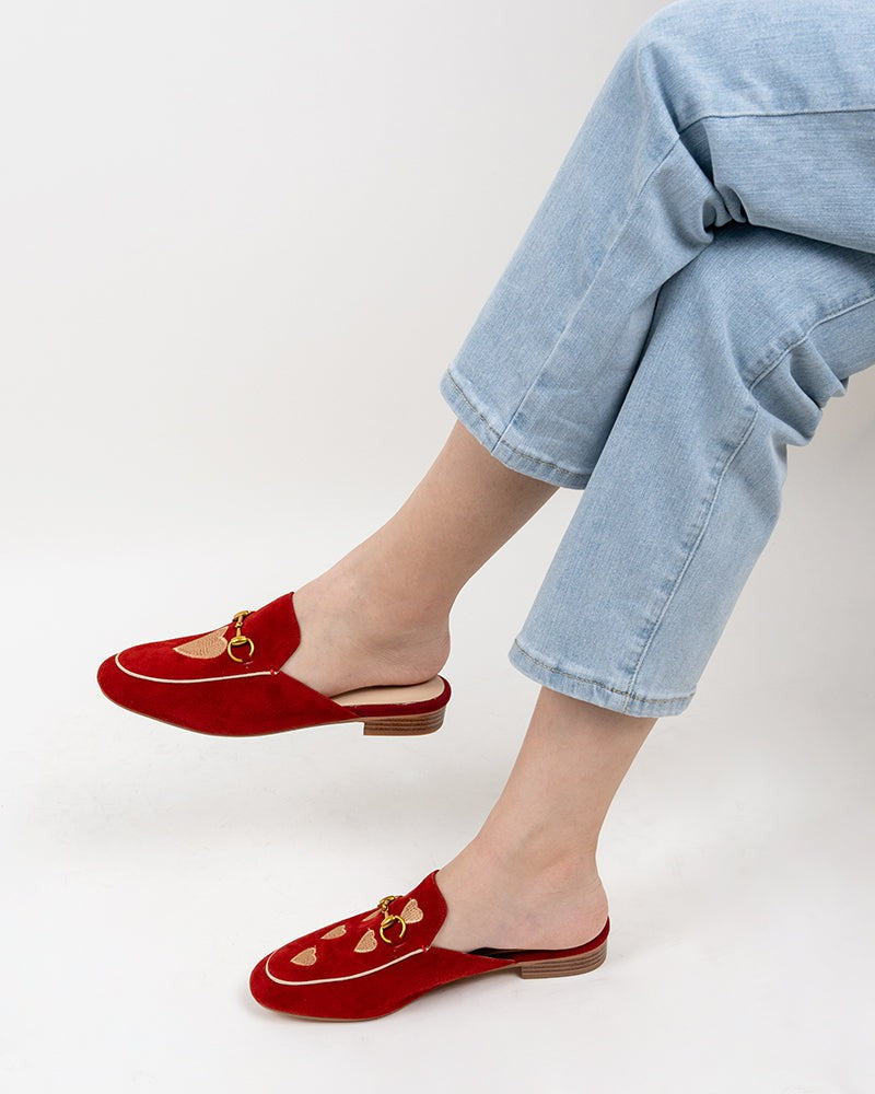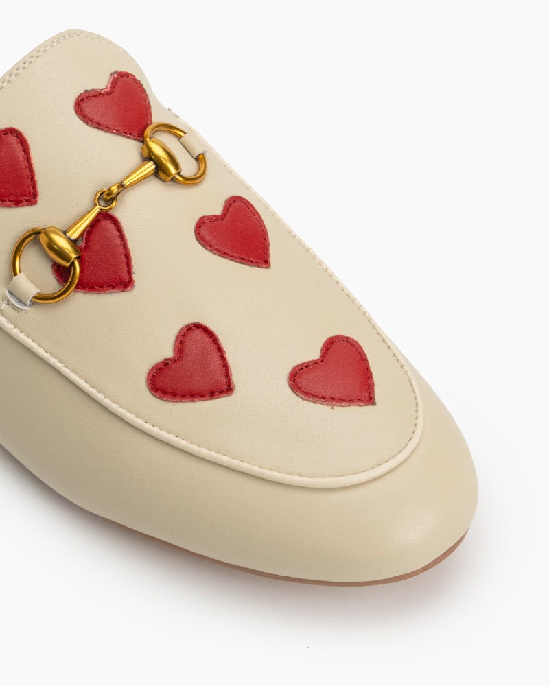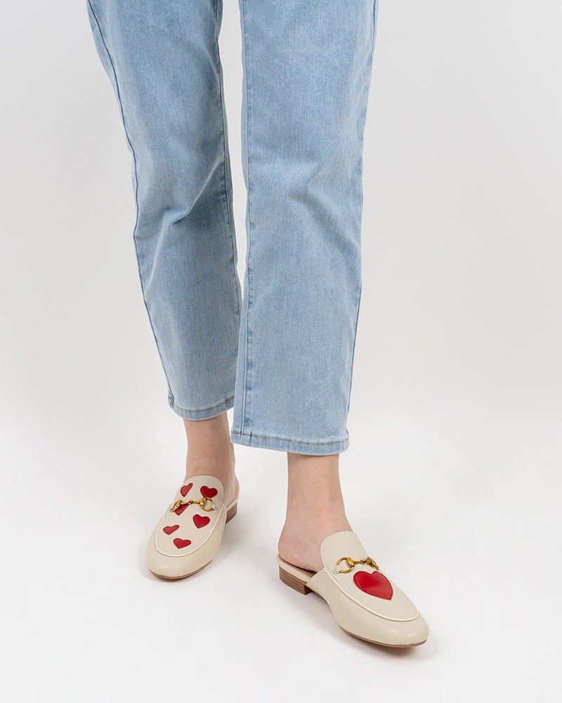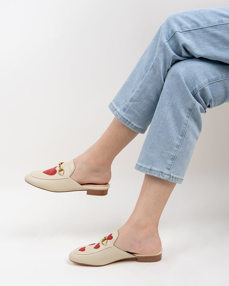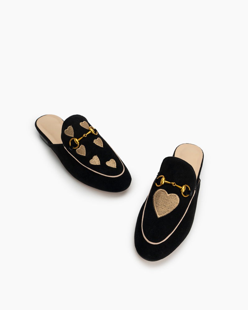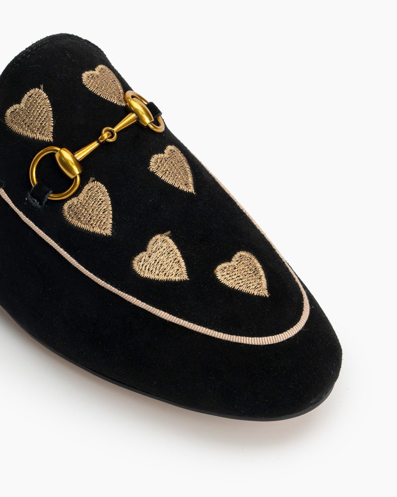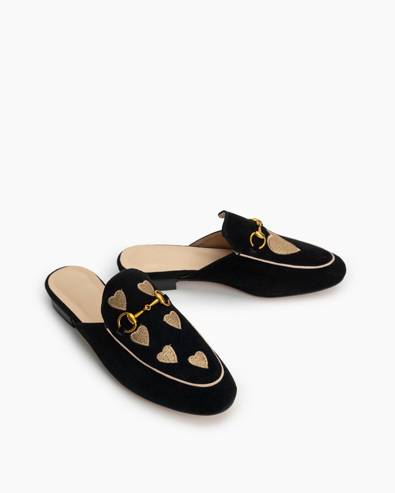 Classic Metal Buckle Heart Embroidered Slip On Backless Mules