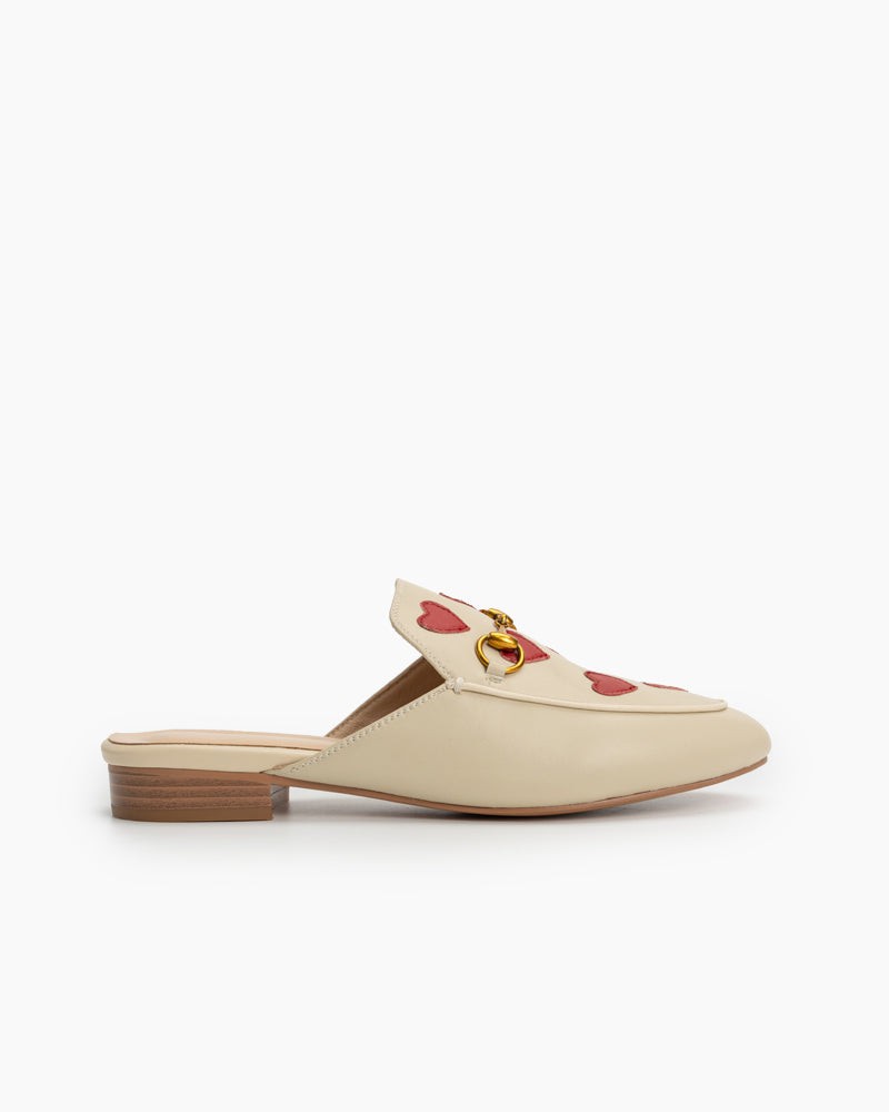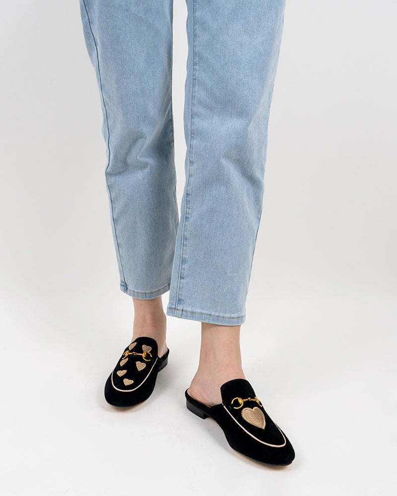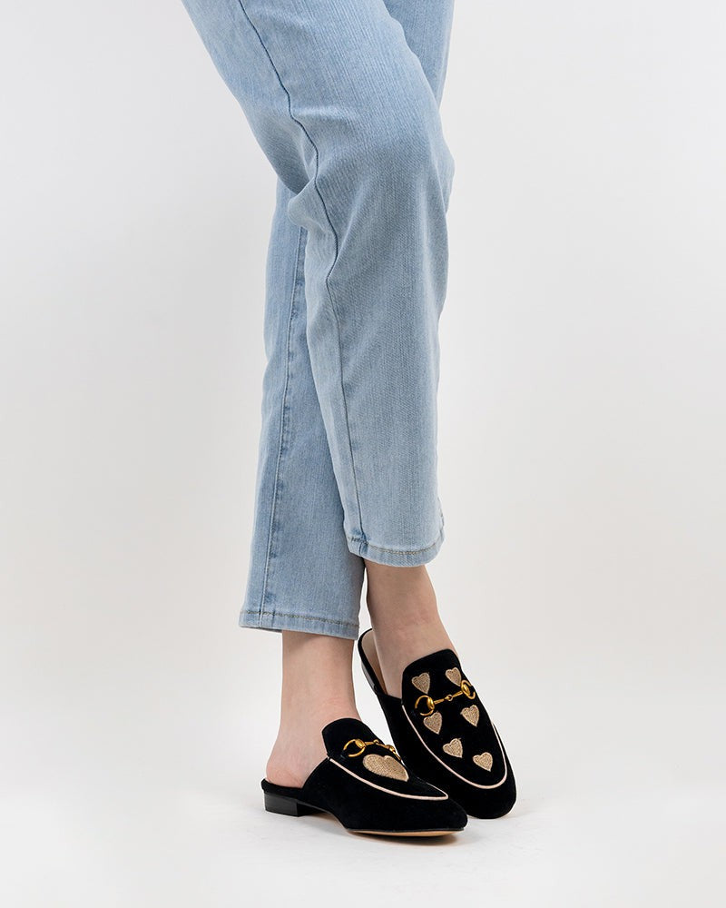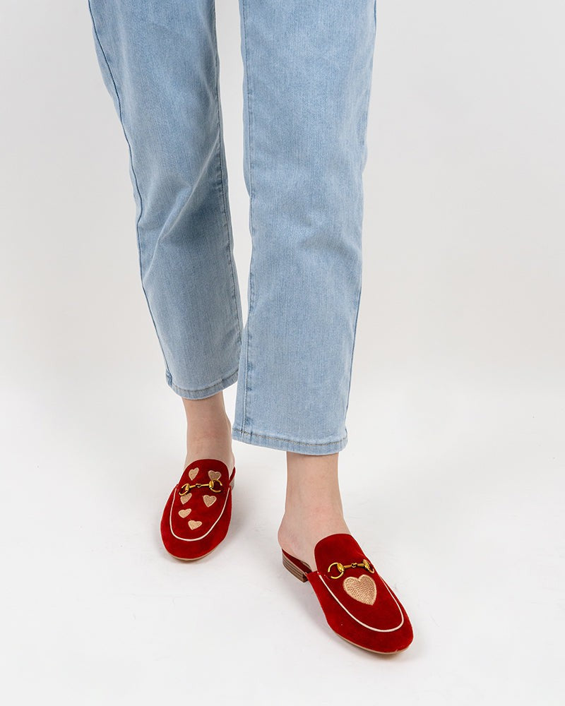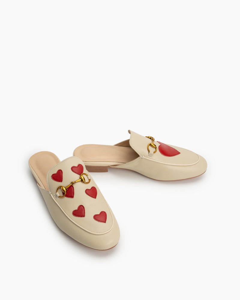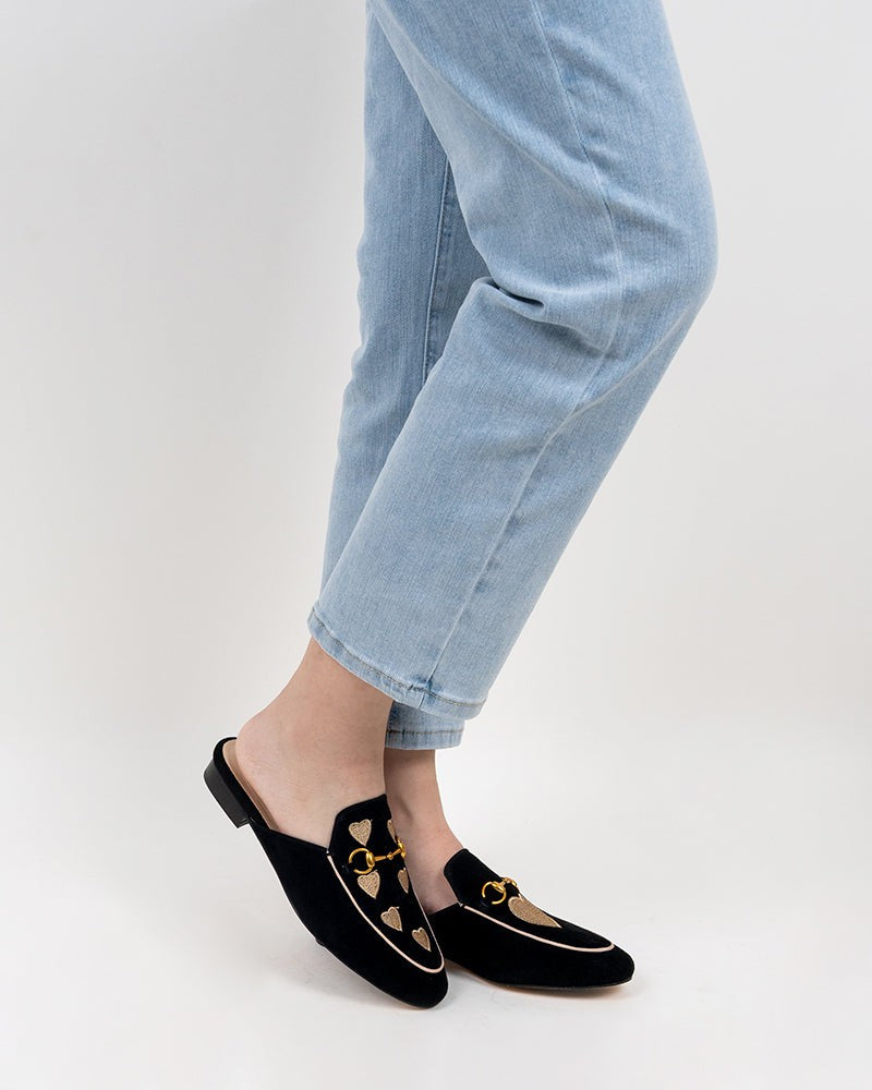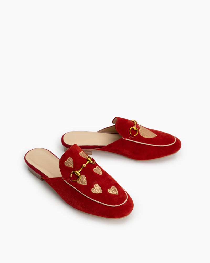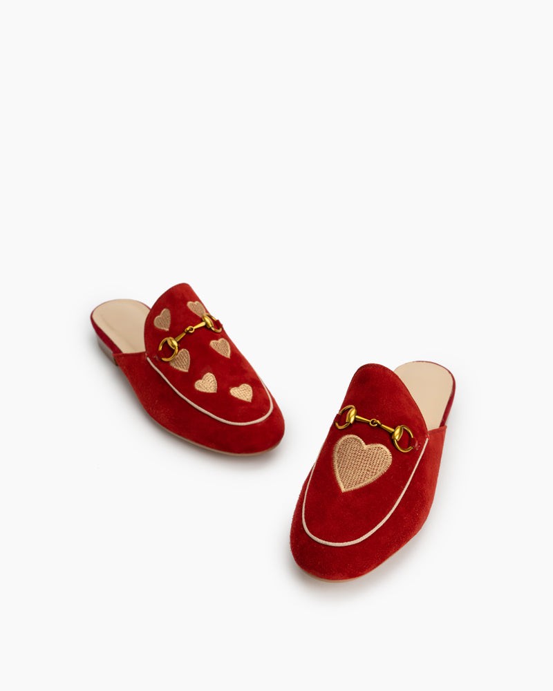 Classic Metal Buckle Heart Embroidered Slip On Backless Mules