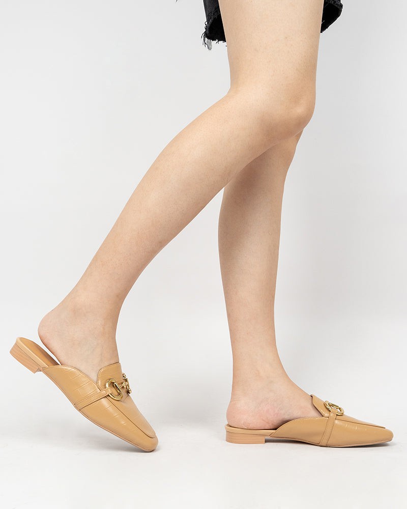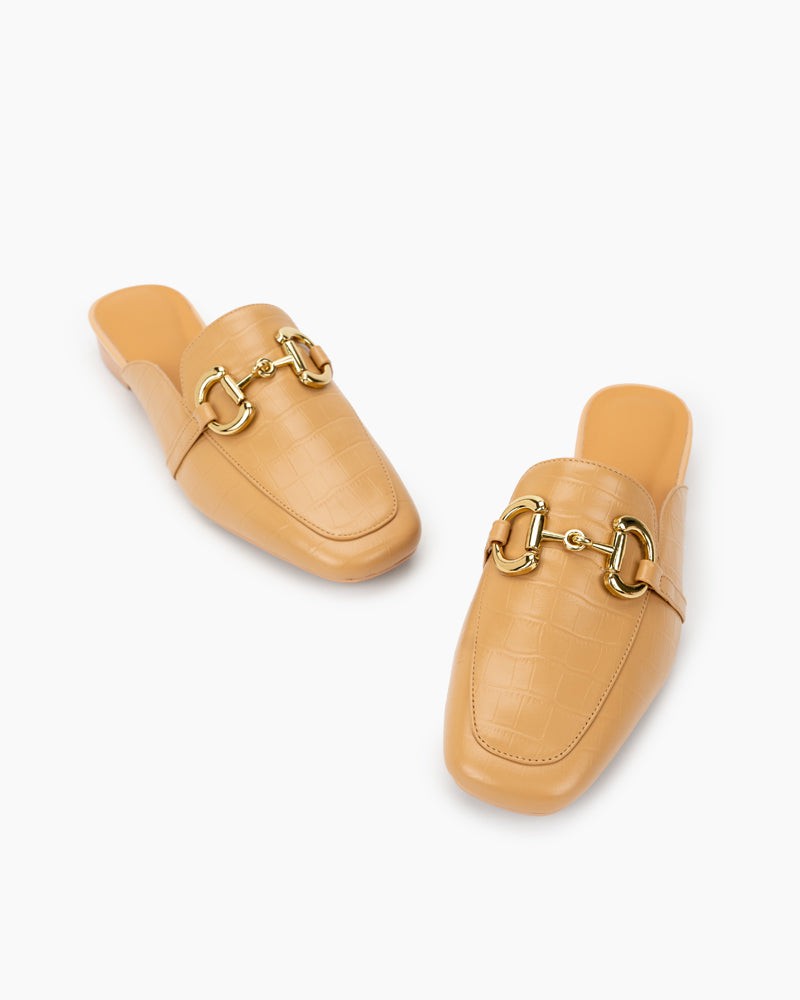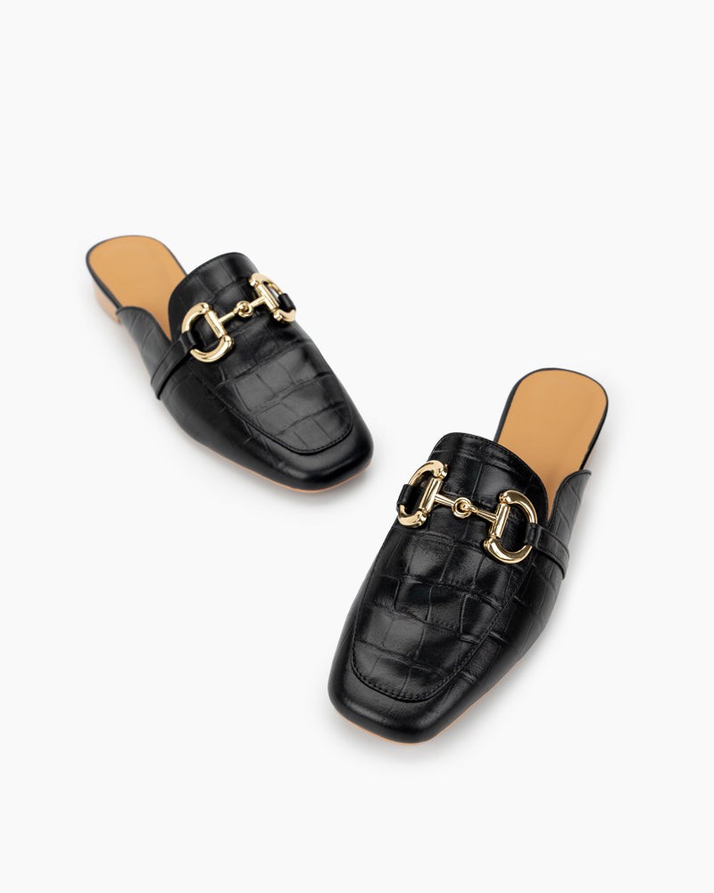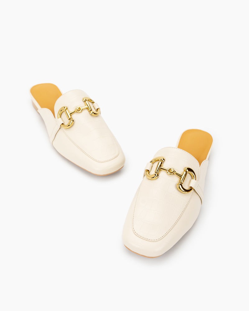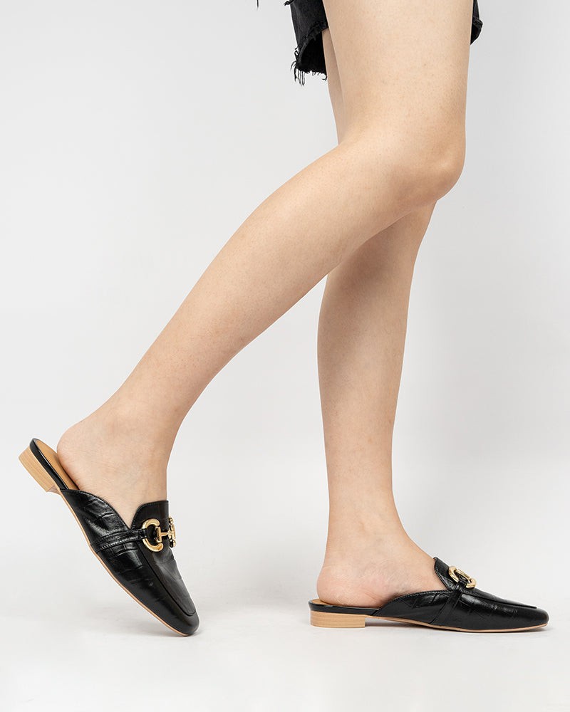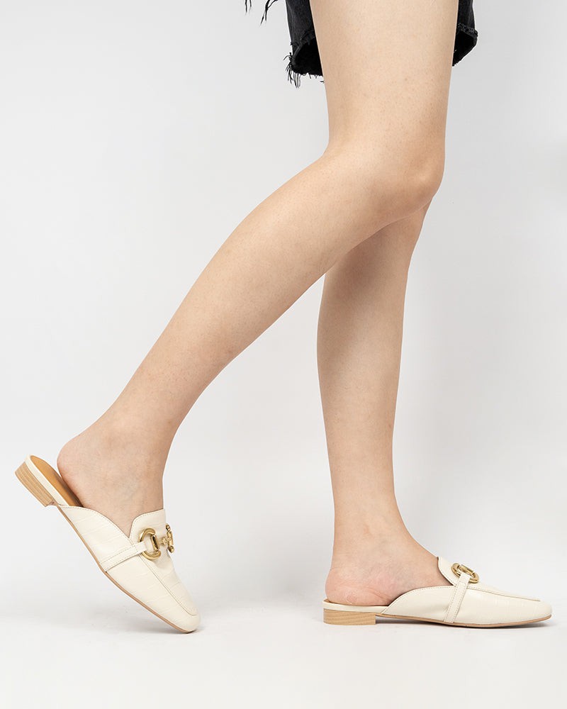 Classic Metal Buckle Square Toe Backless Slip on Slides Mules