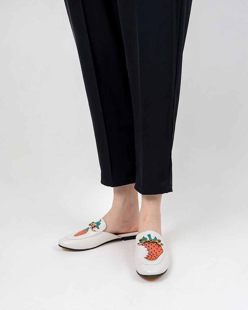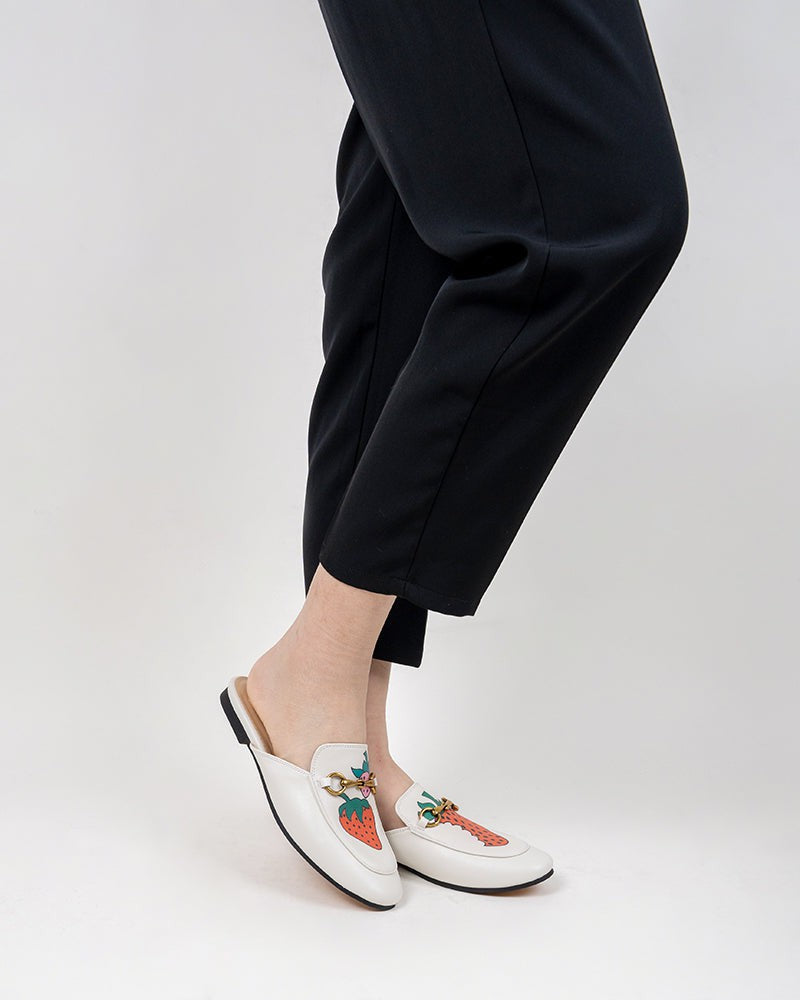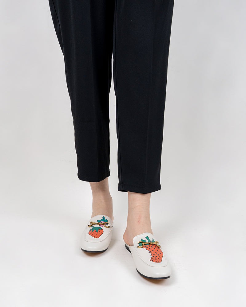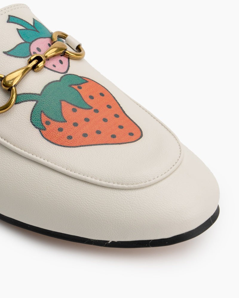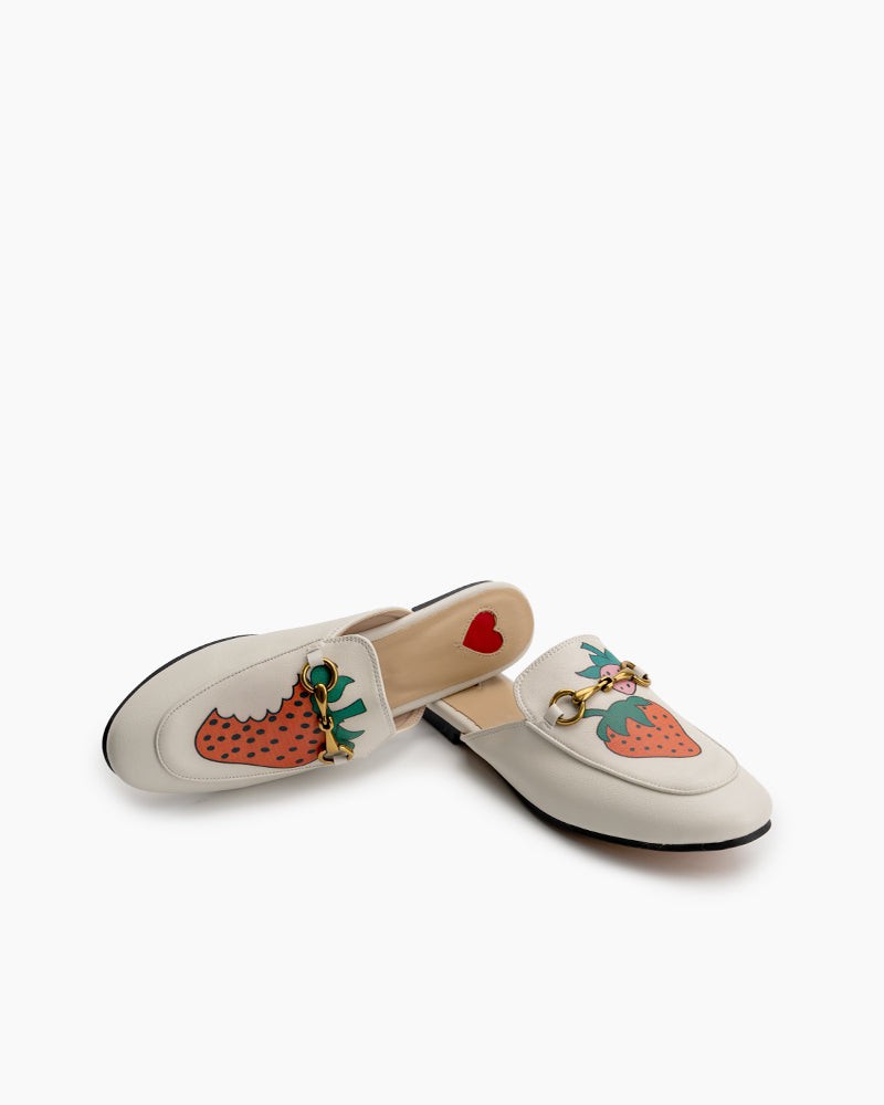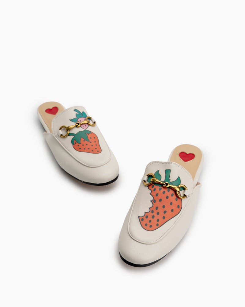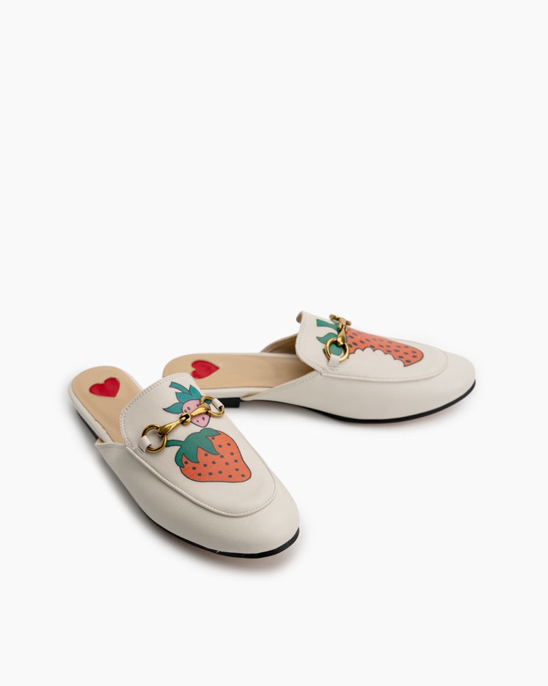 Classic Metal Buckle Strawberry Pattern Leather Slip On Backless Mules