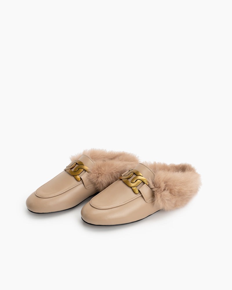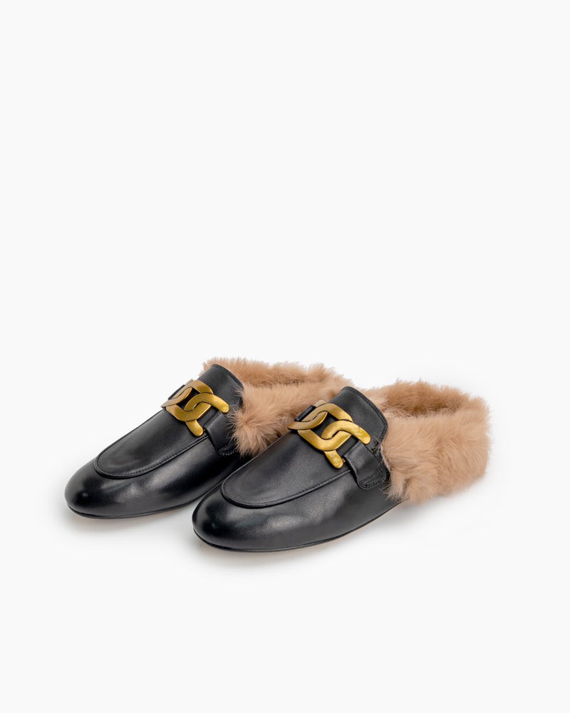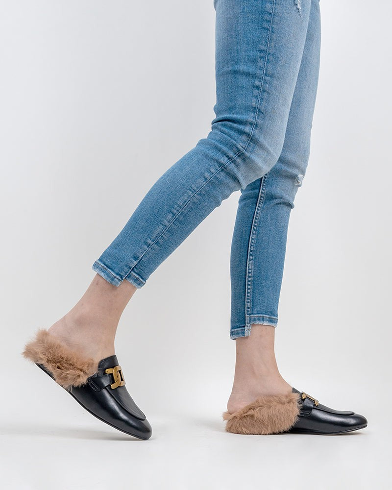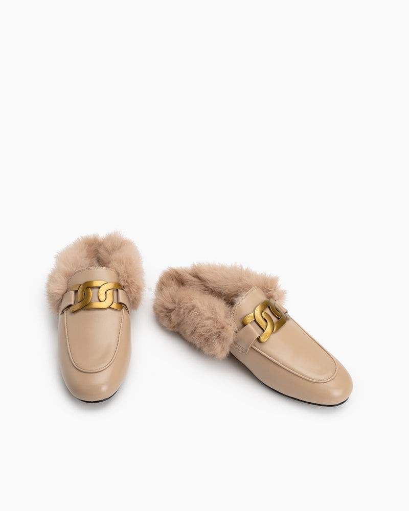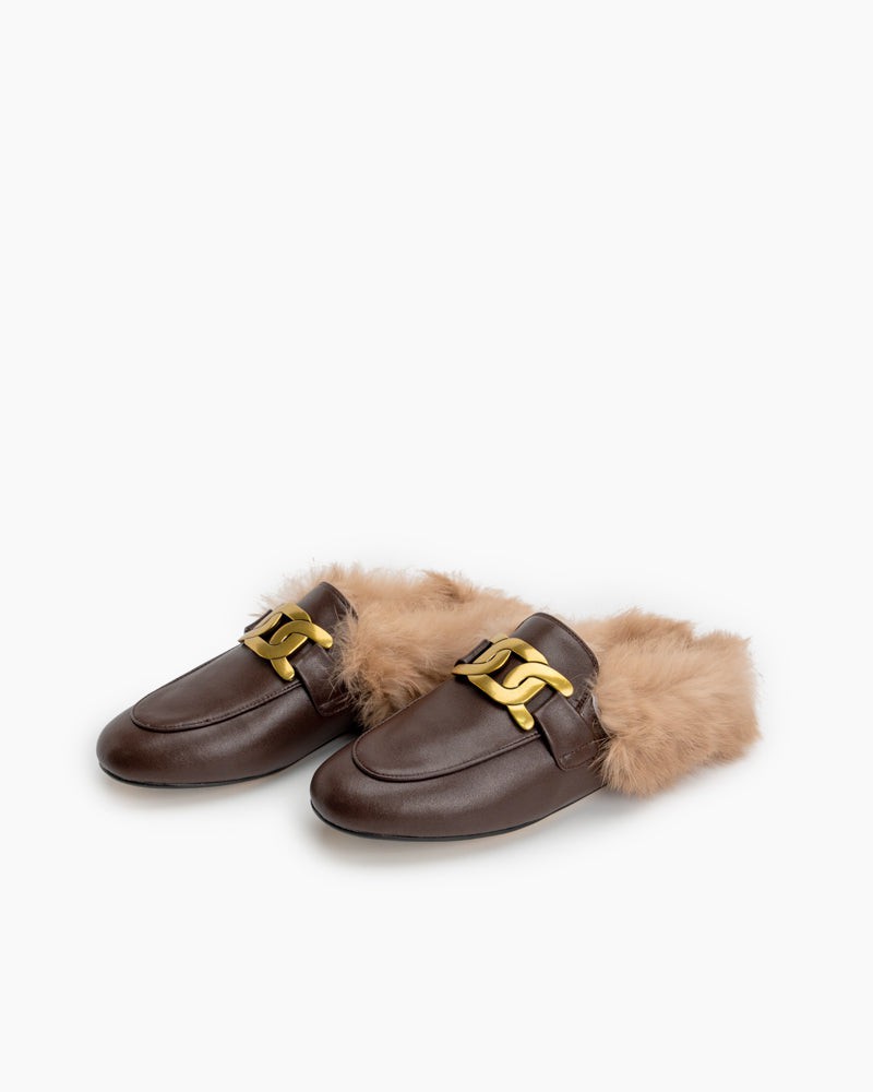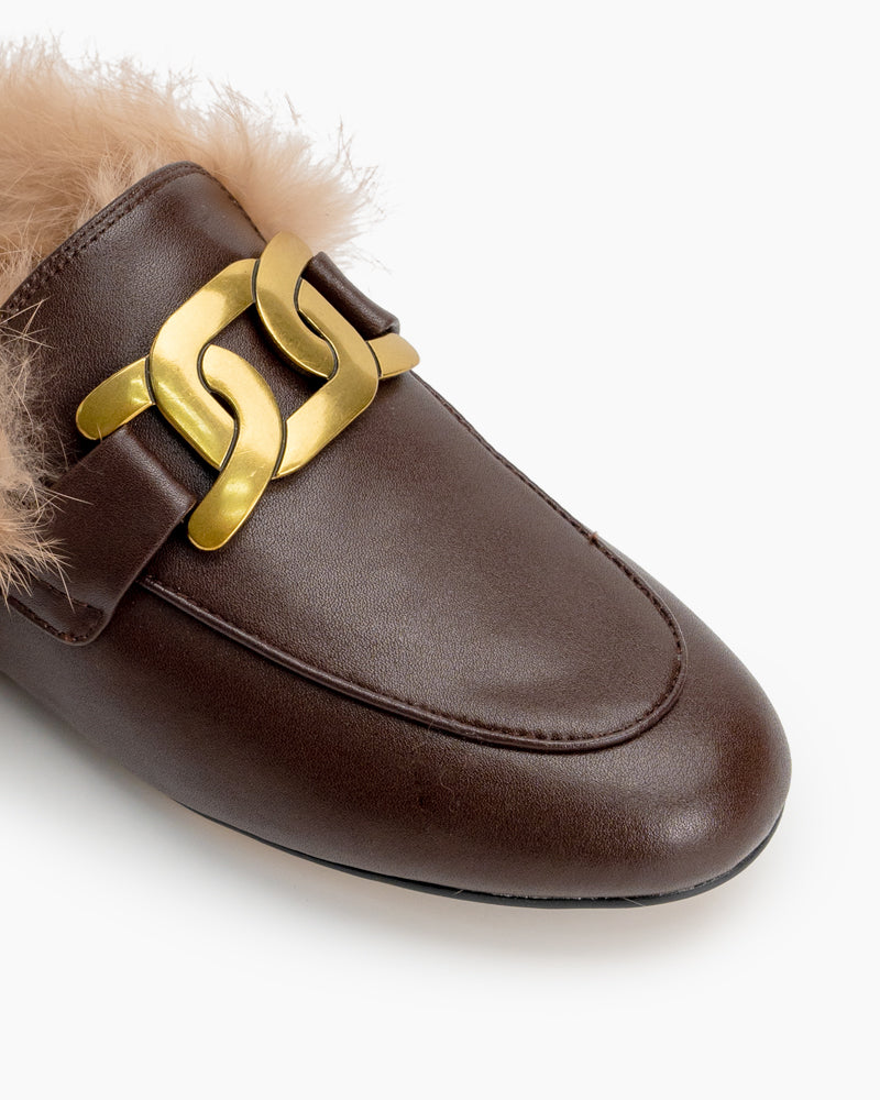 Metal Decor Backless Fluffy Round Toe Slippers Mule