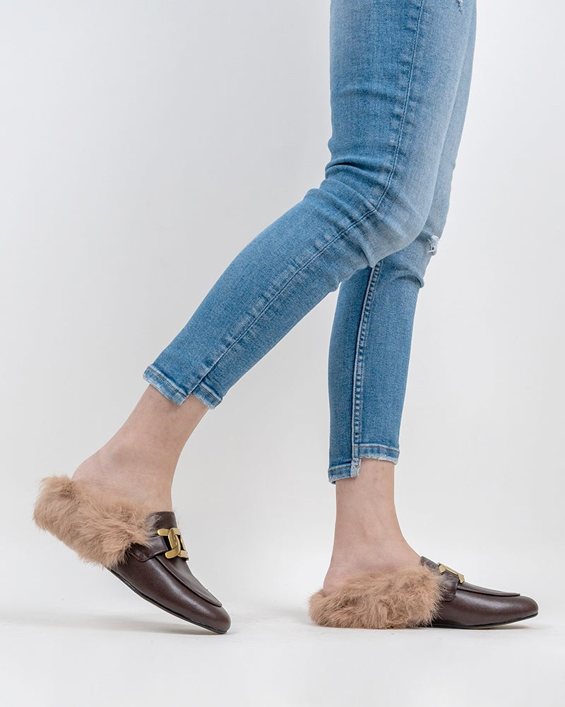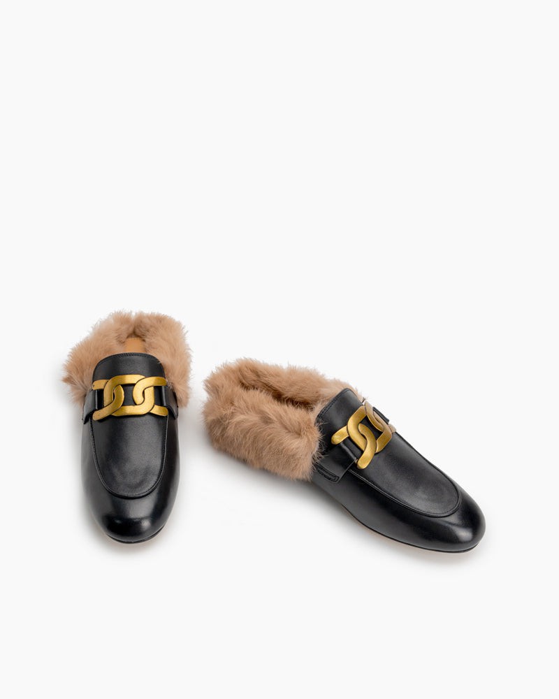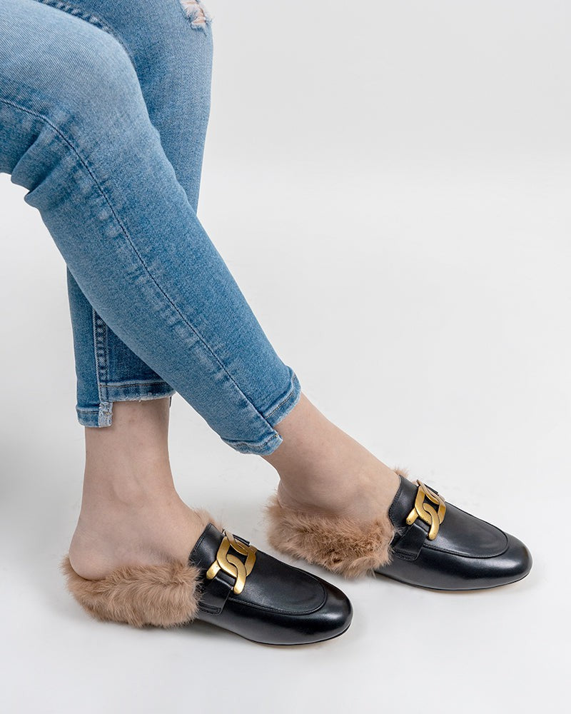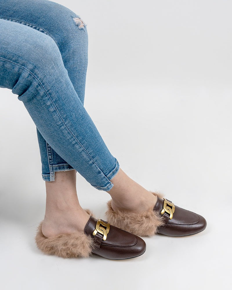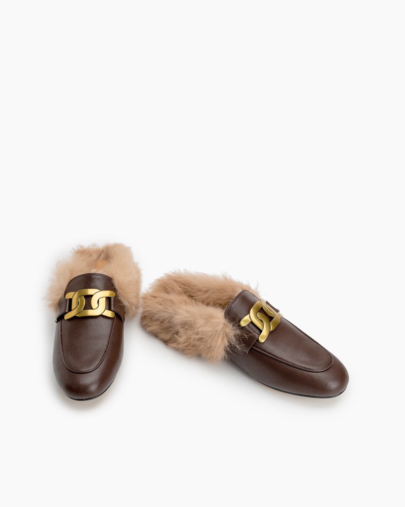 Metal Decor Backless Fluffy Round Toe Slippers Mule