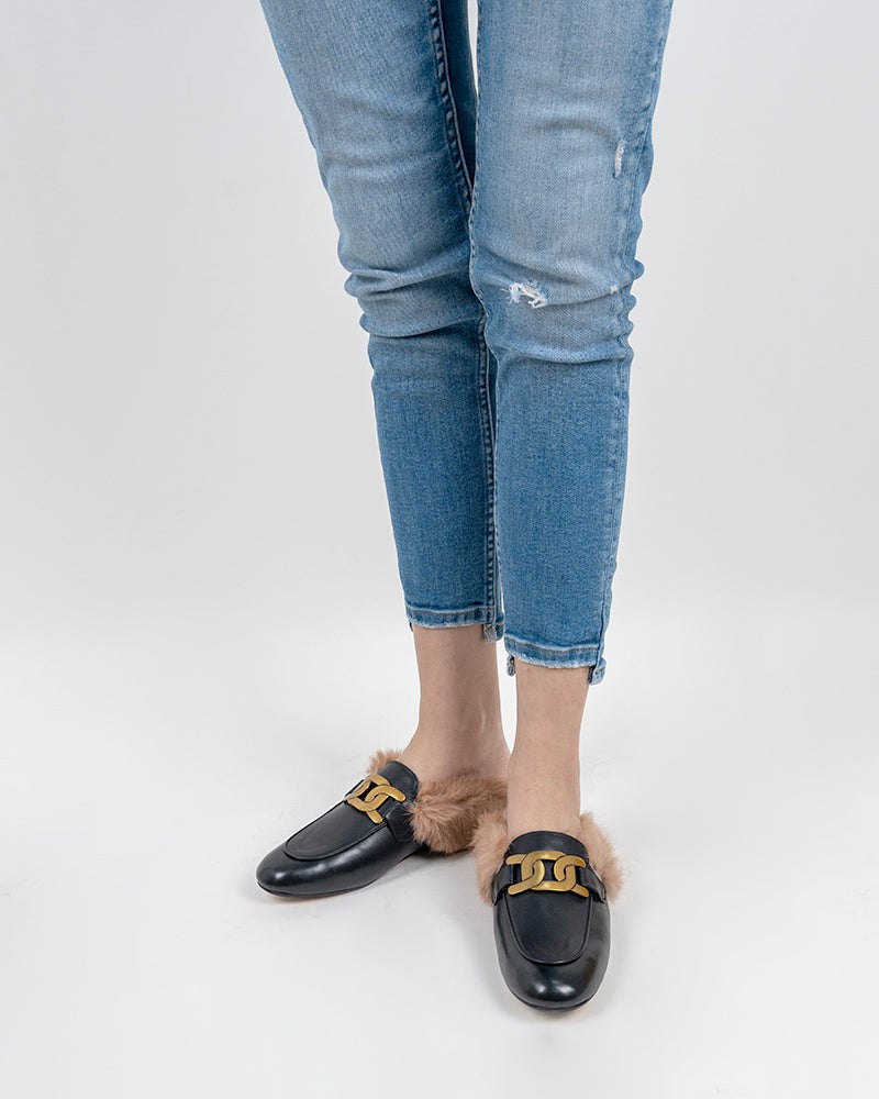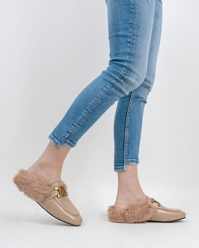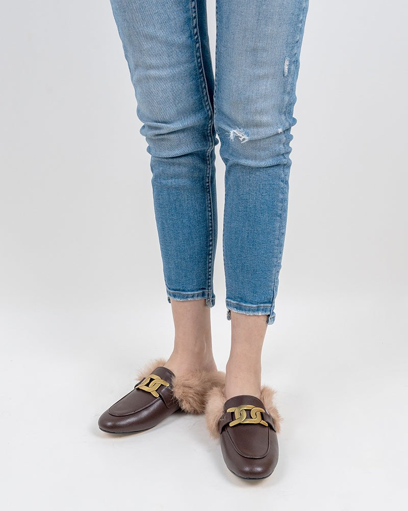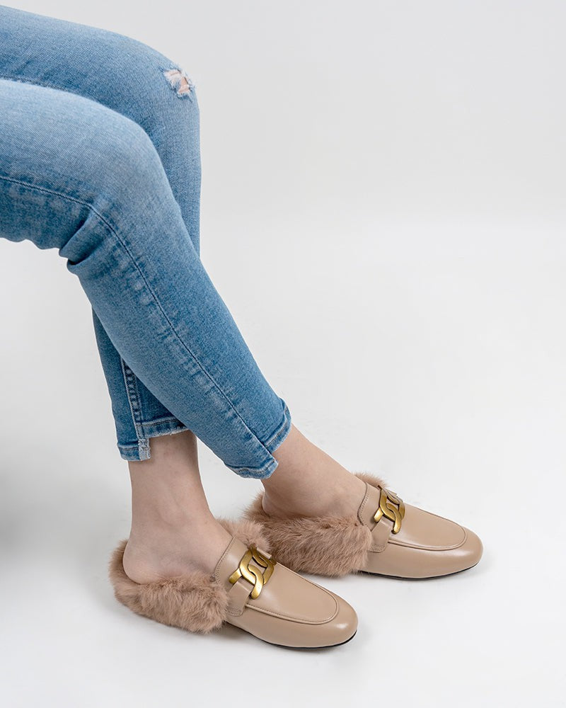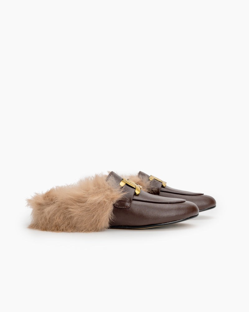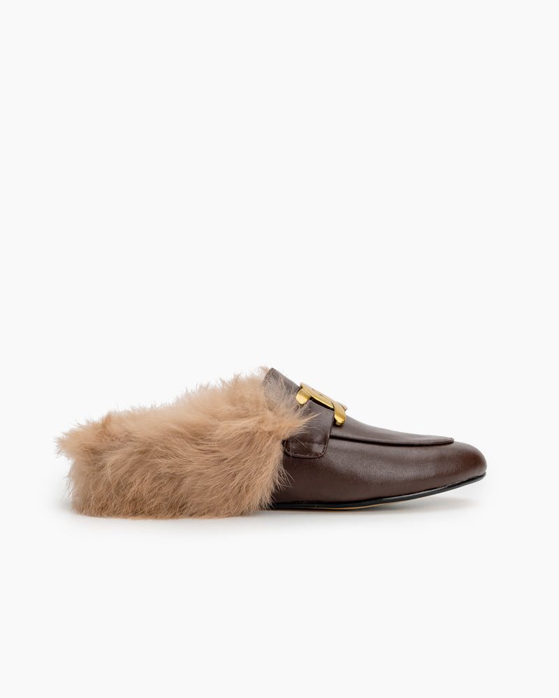 Metal Decor Backless Fluffy Round Toe Slippers Mule
