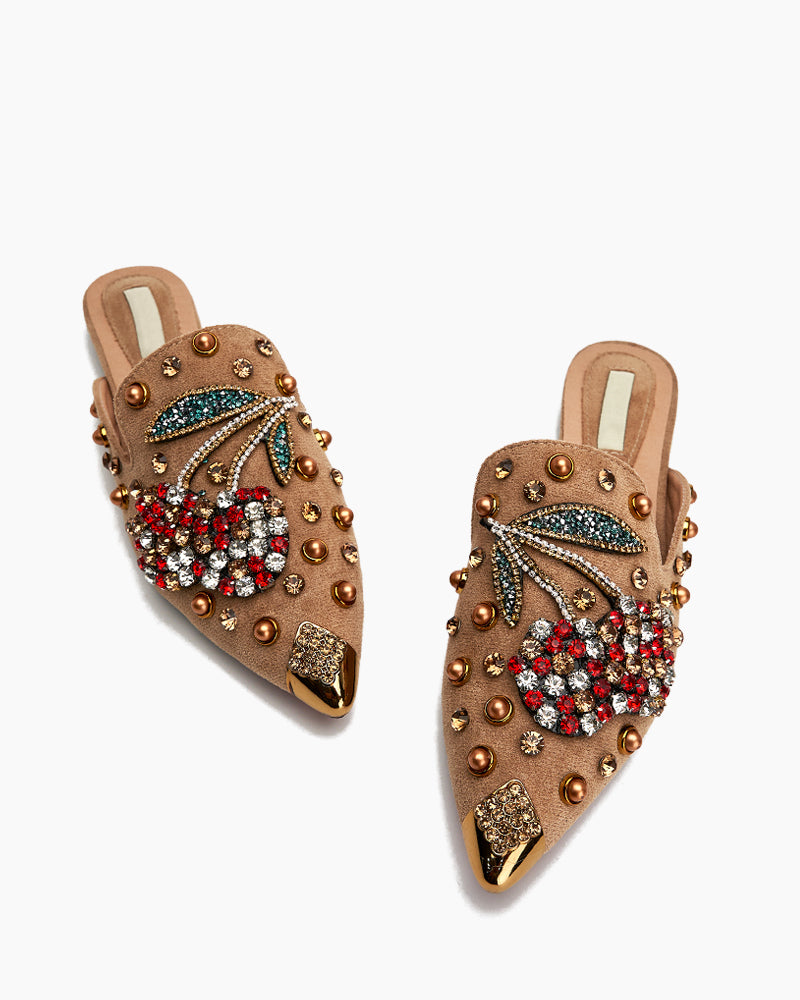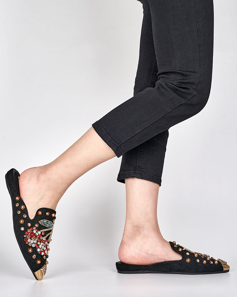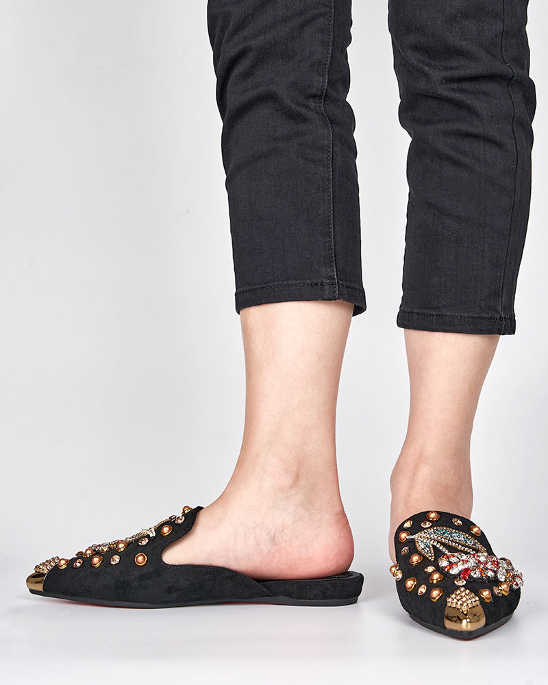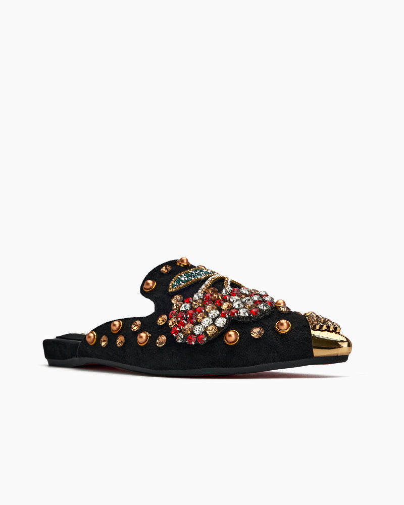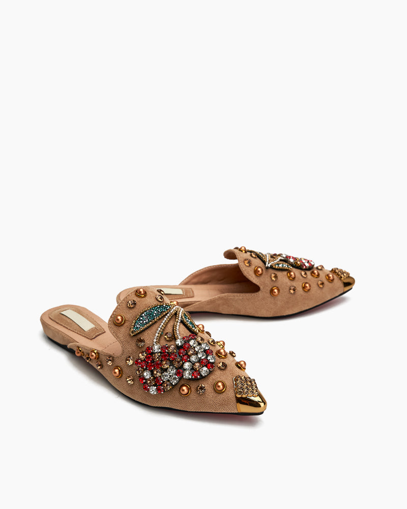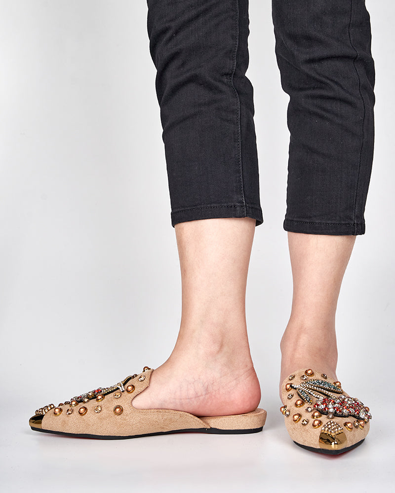 Pointed Toe Rhinestone Suede Slip-on Mules