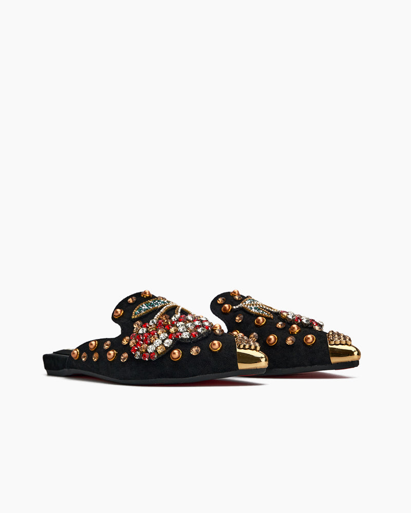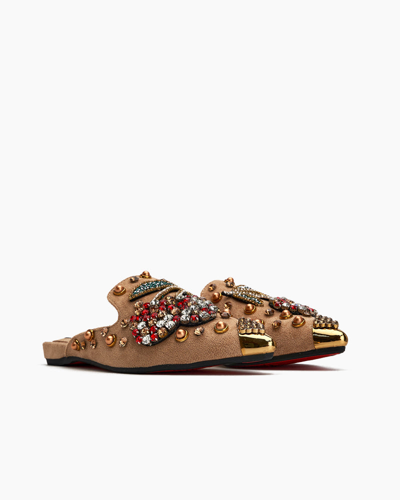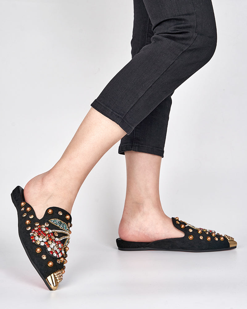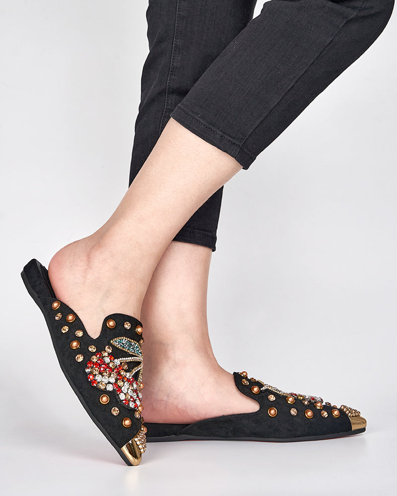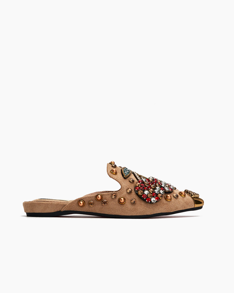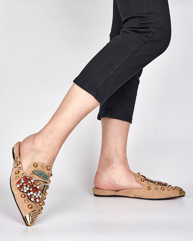 Pointed Toe Rhinestone Suede Slip-on Mules