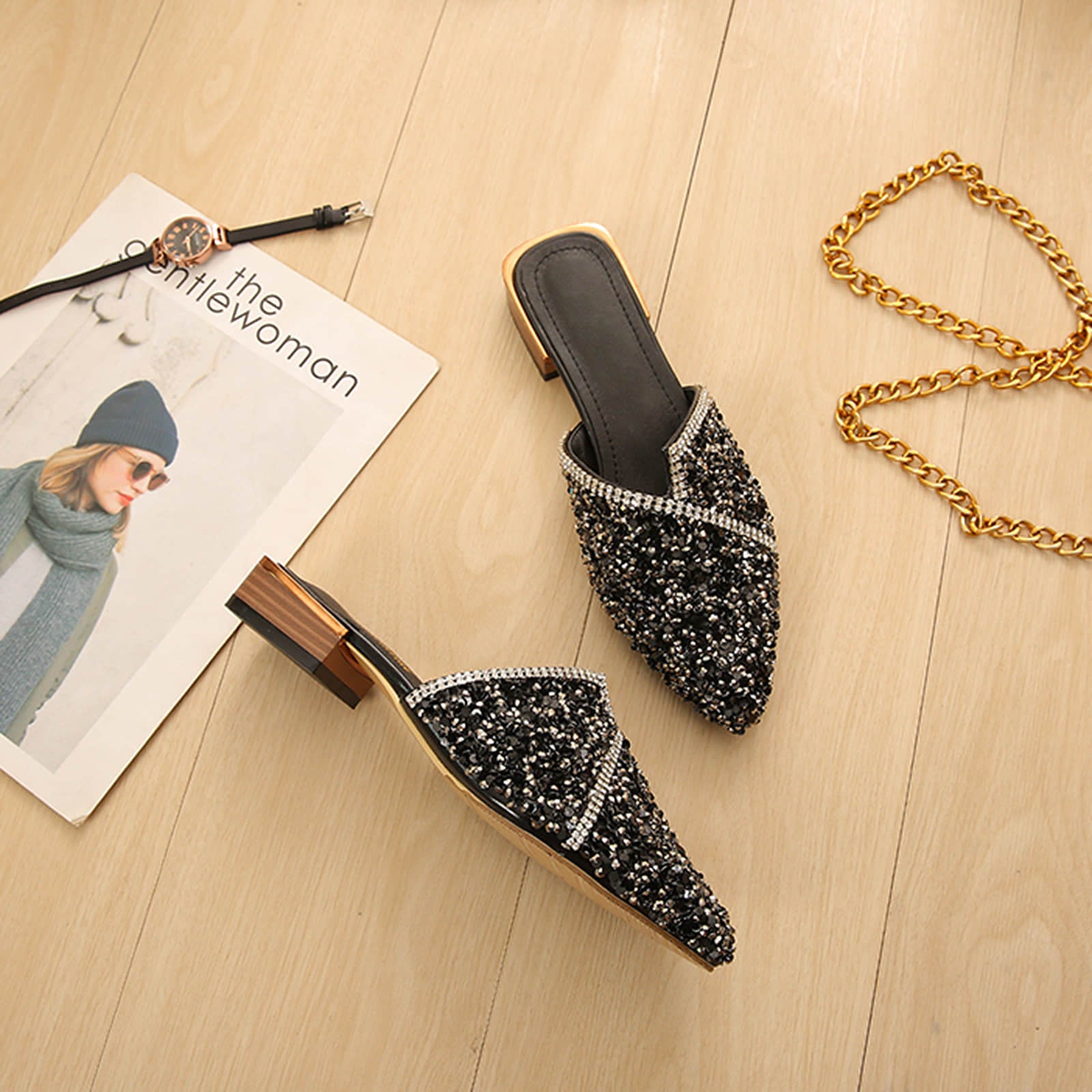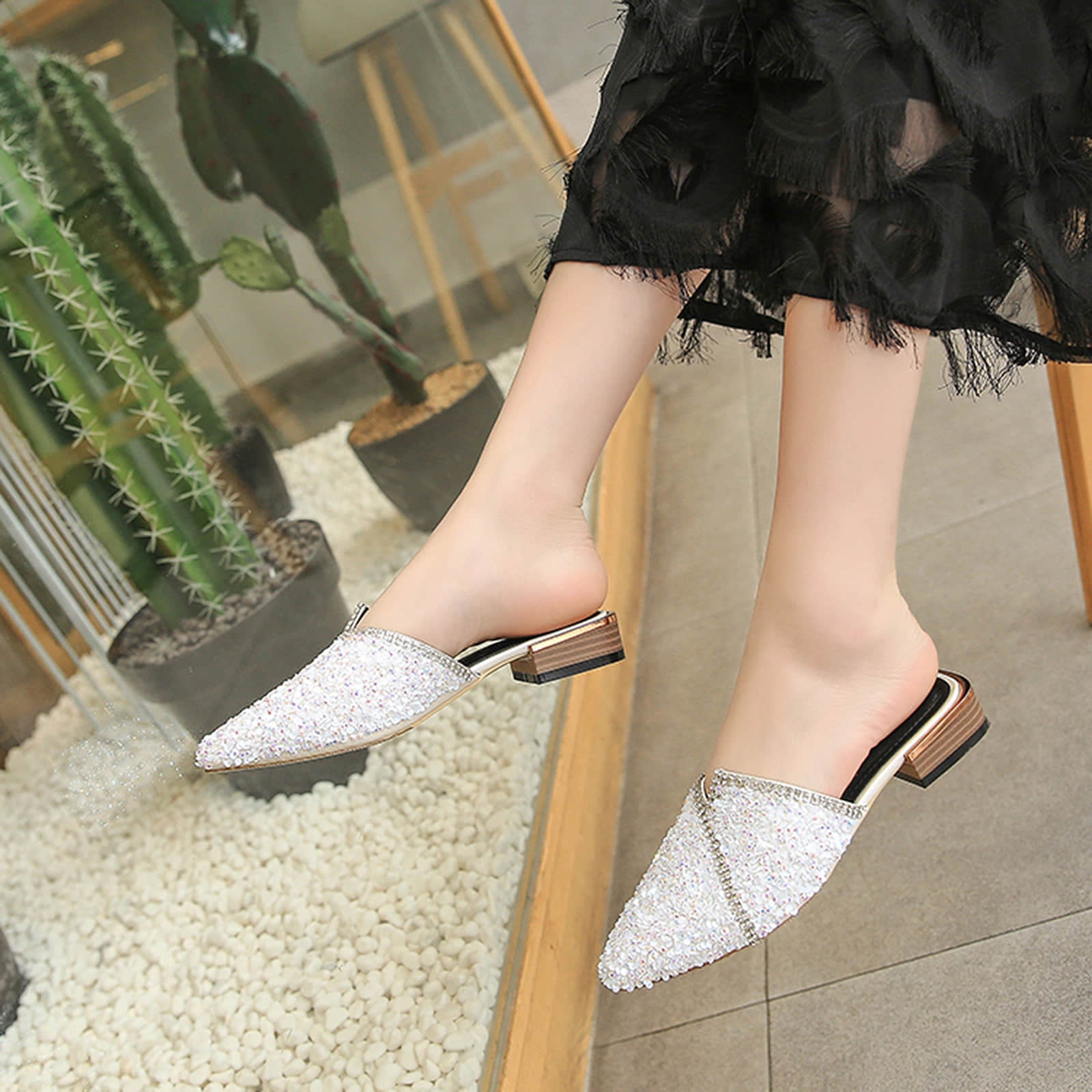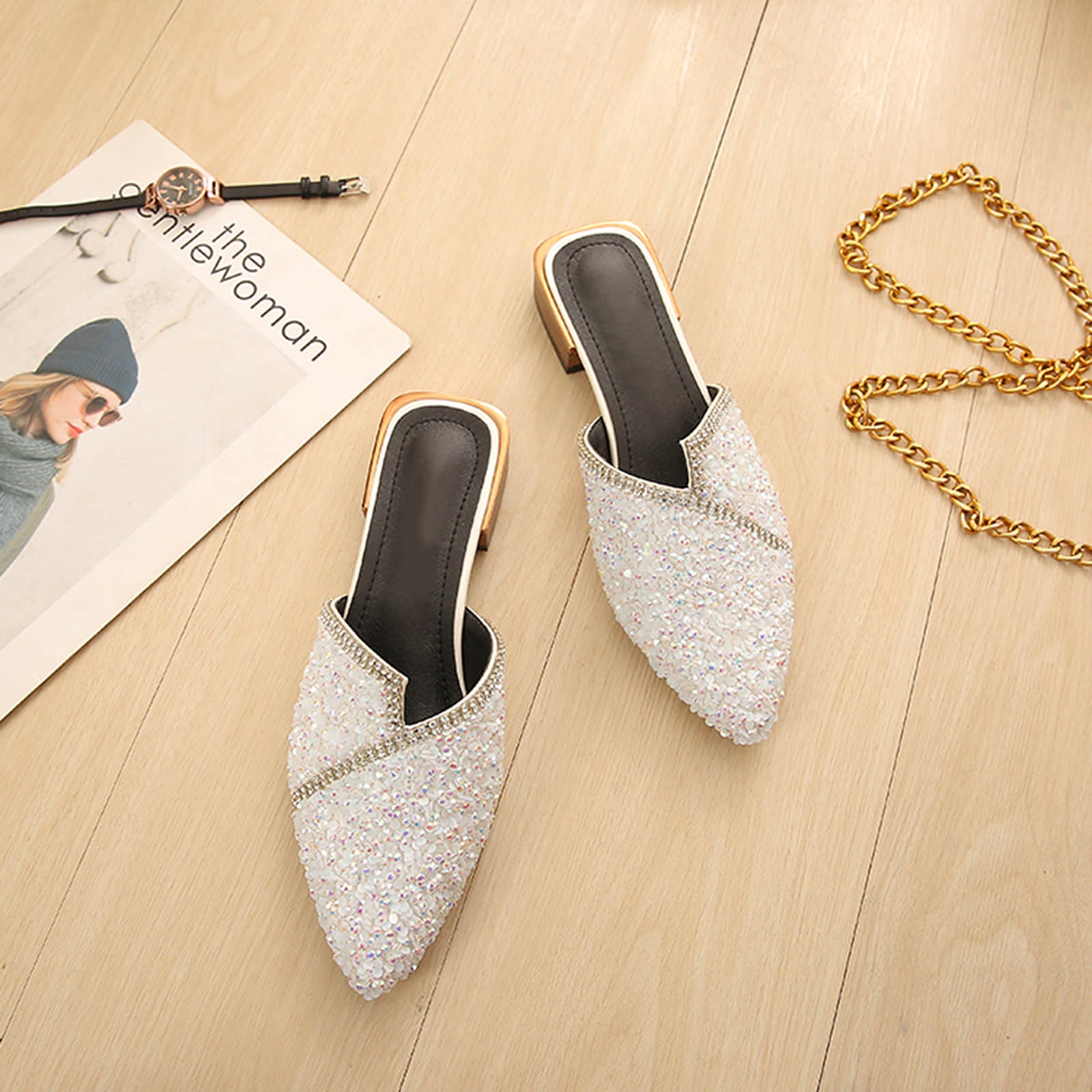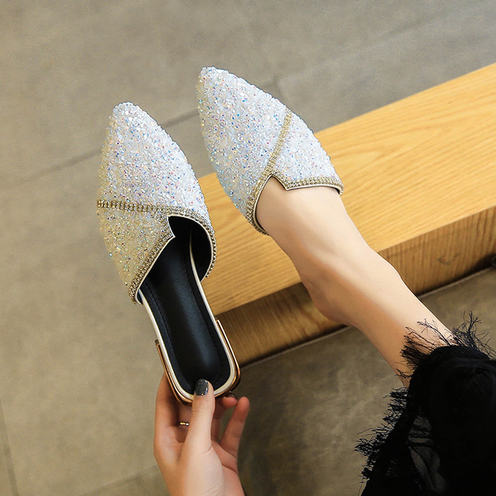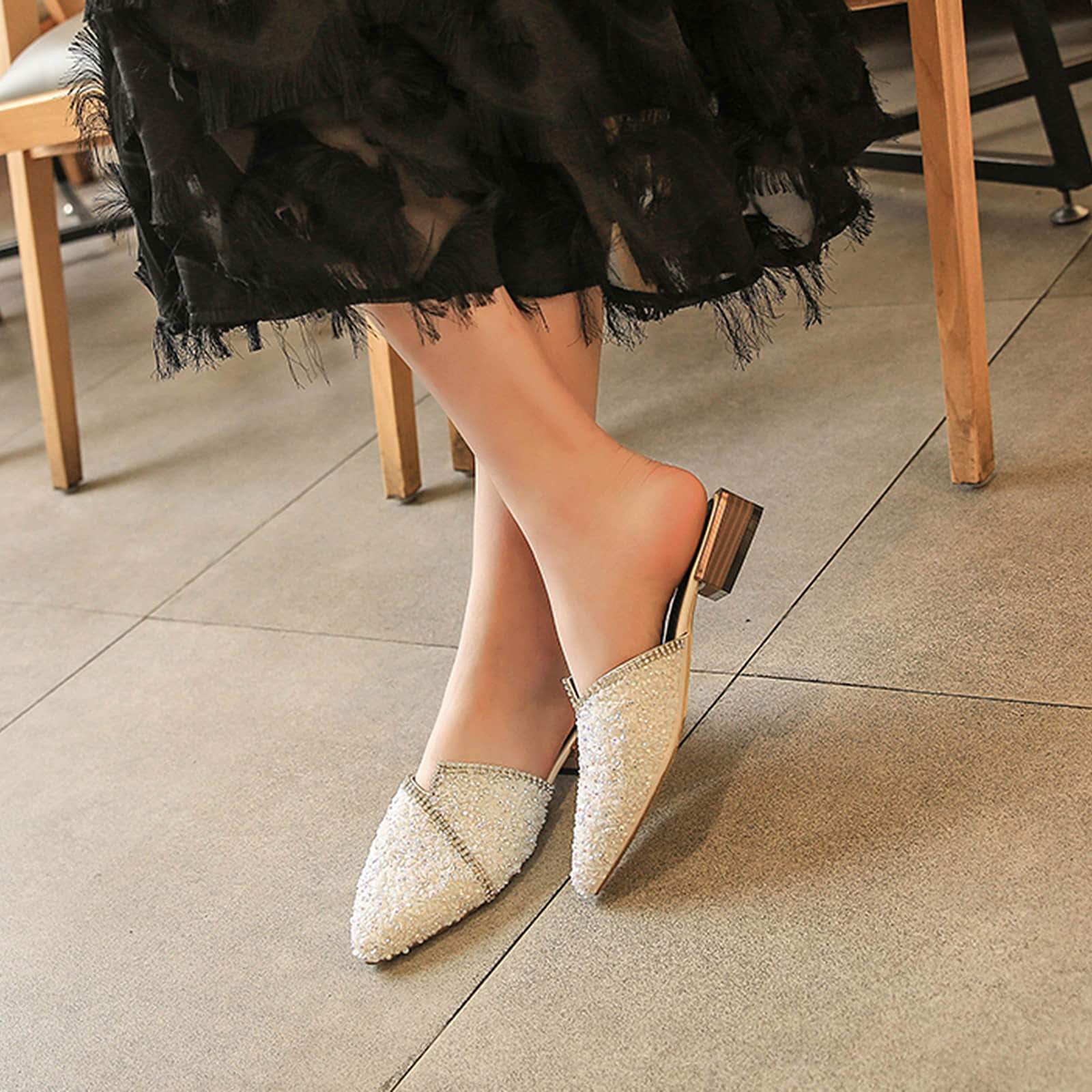 Pointed Toe Sequins Rhinestones Flat Mules