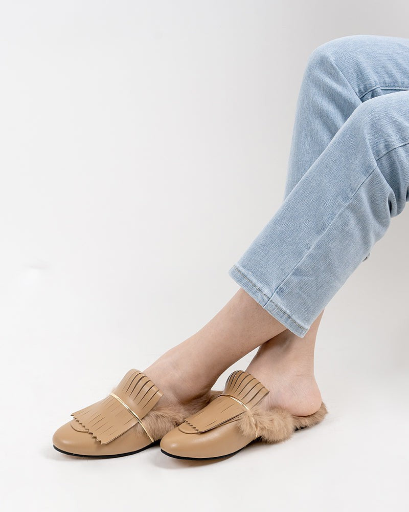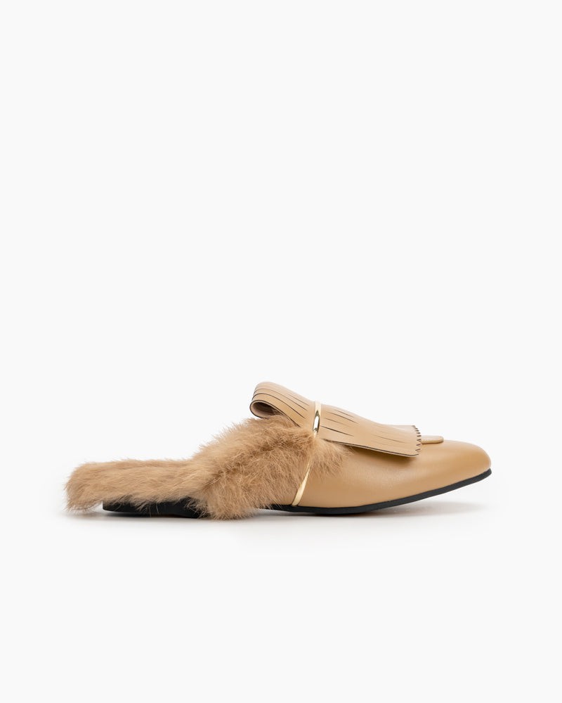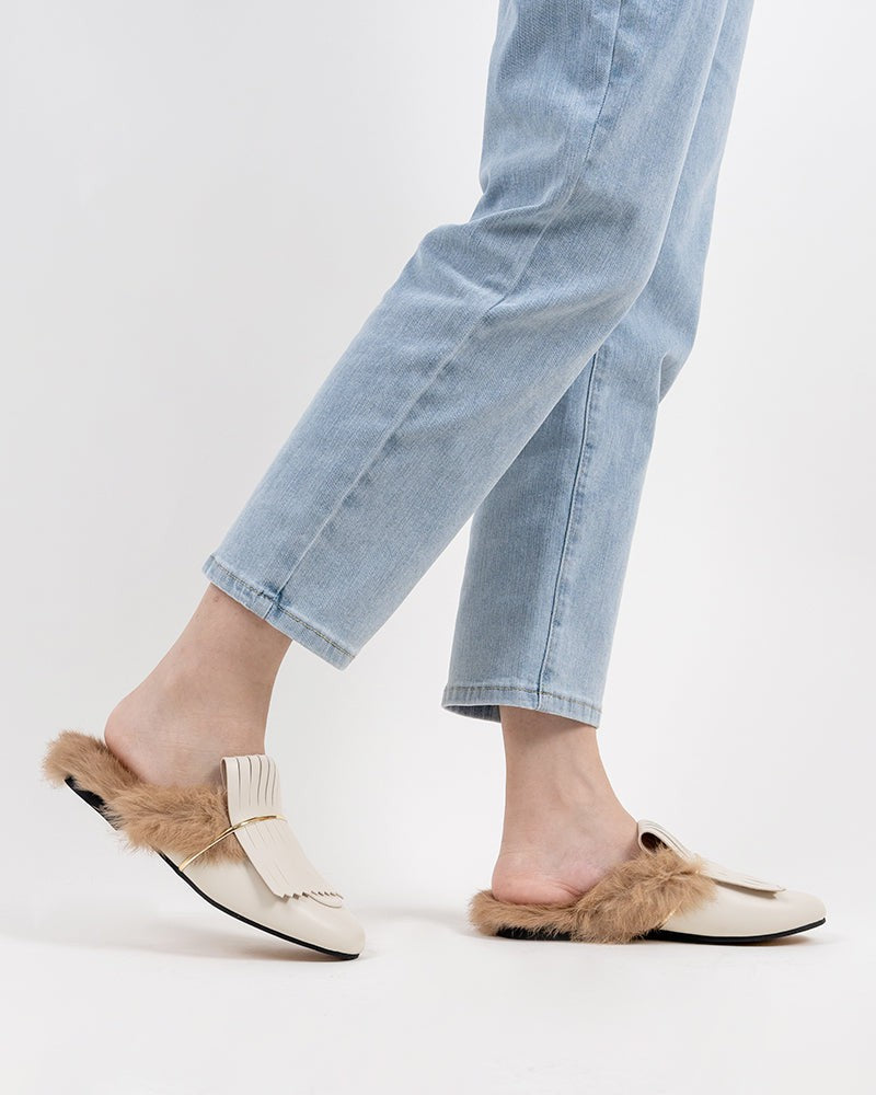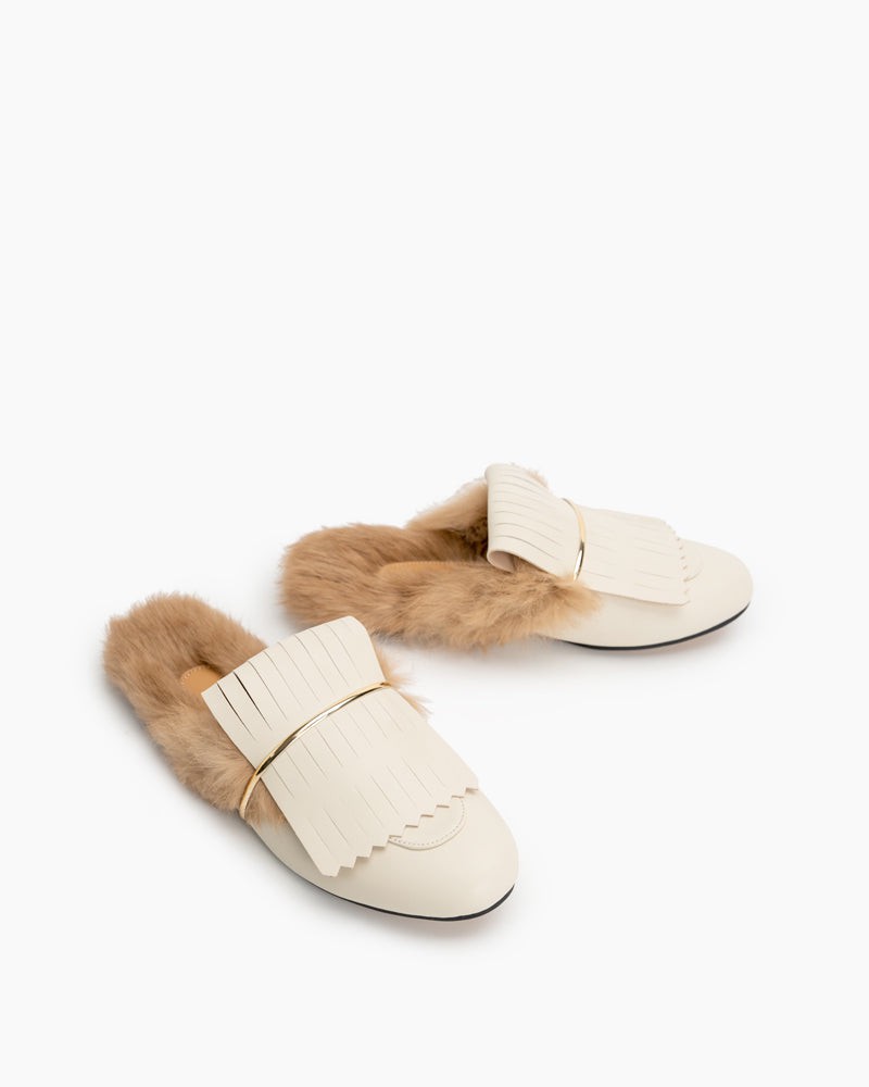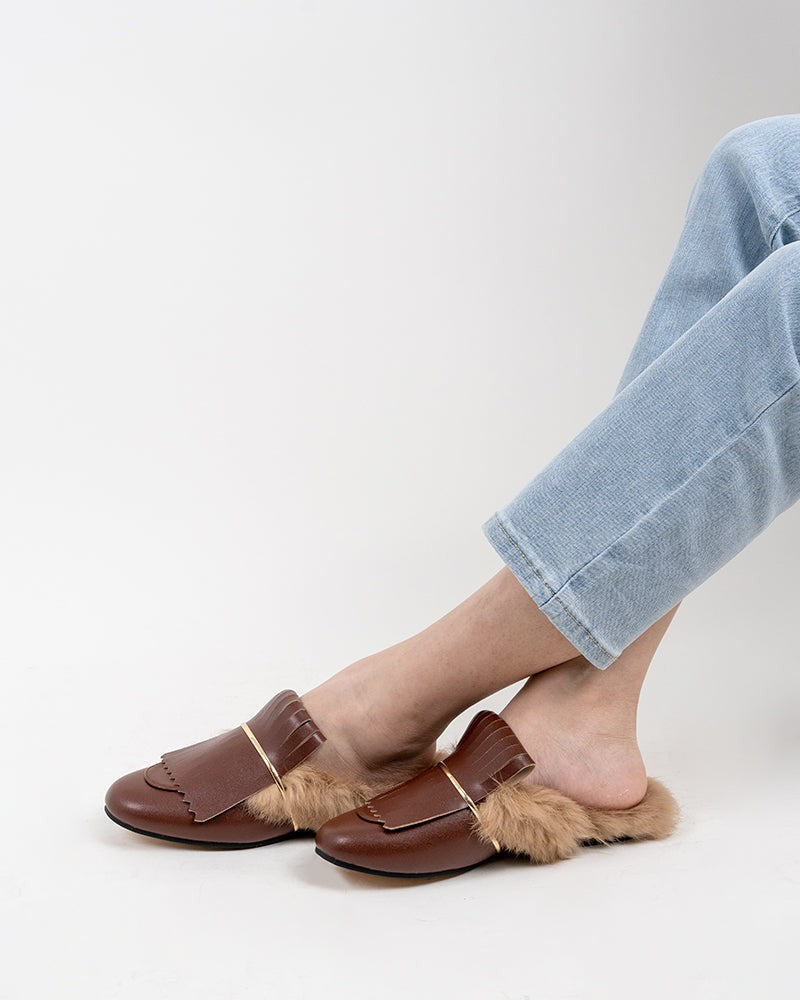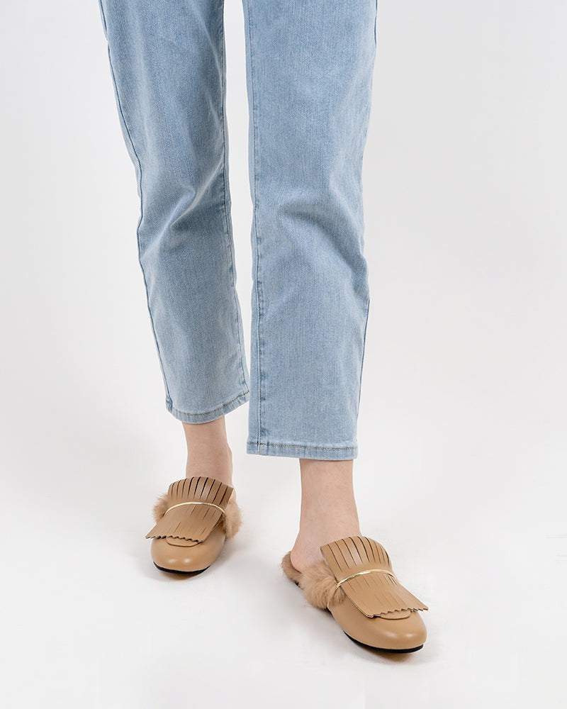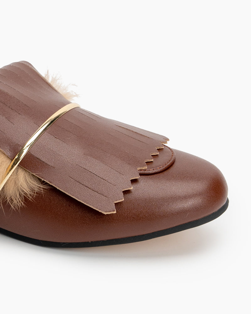 Tassel Fur Backless Slip On Buckle Flat Mules