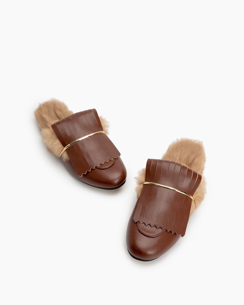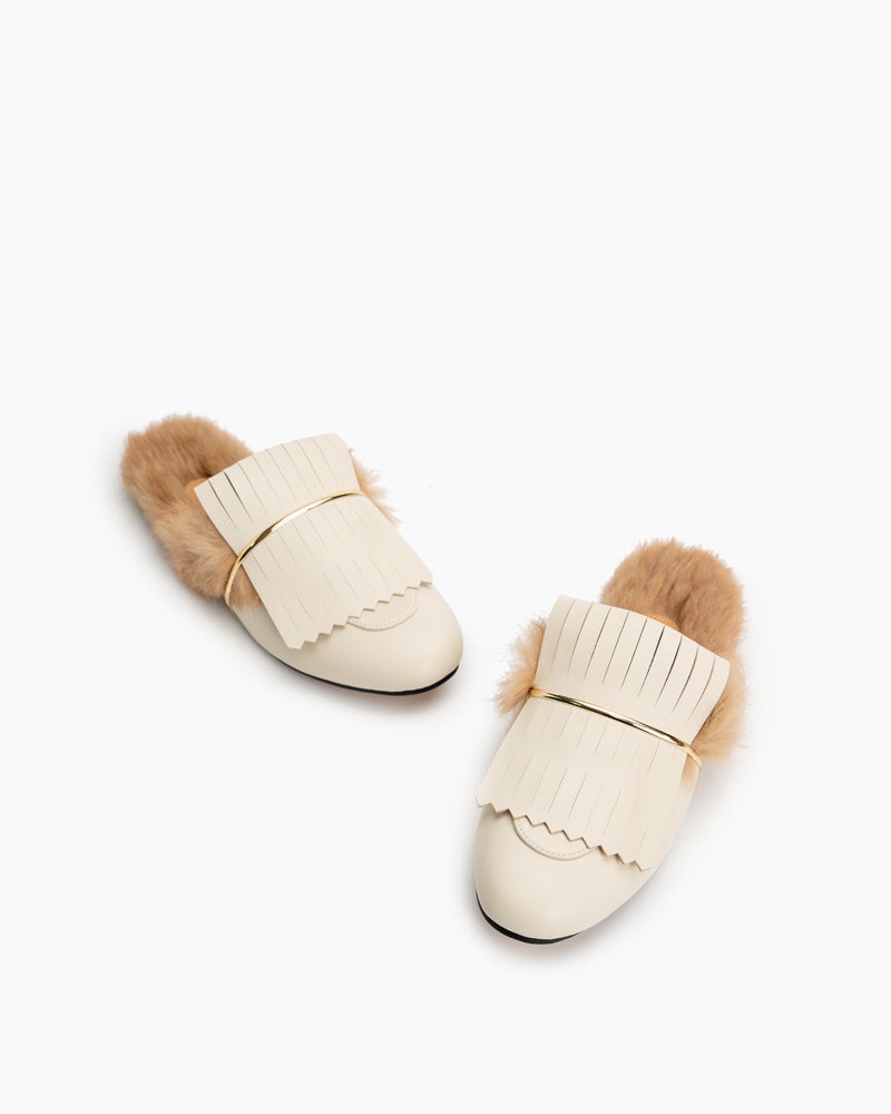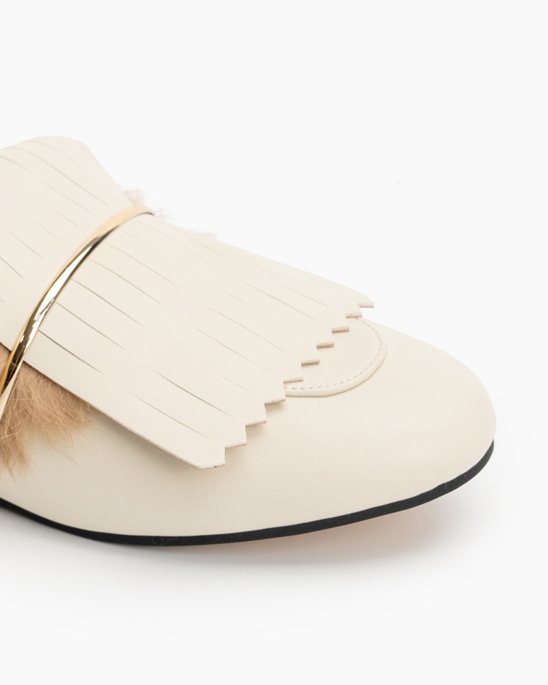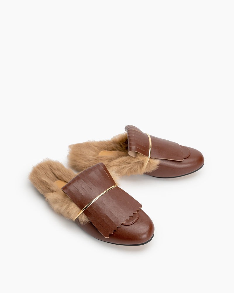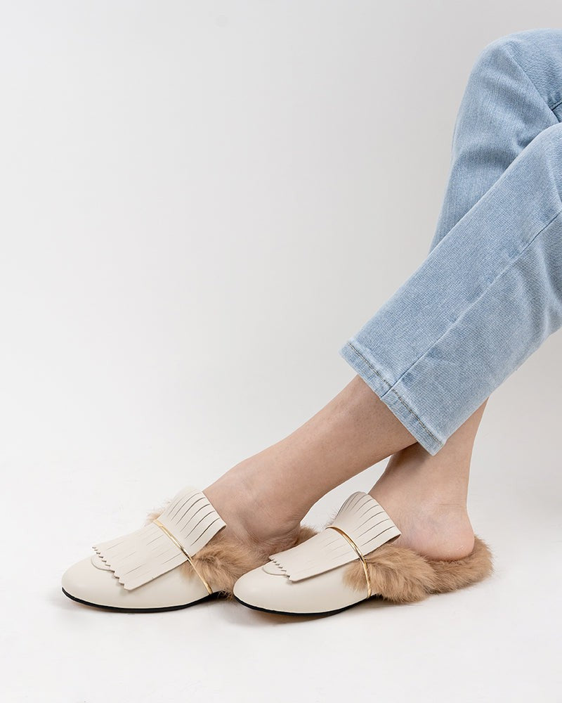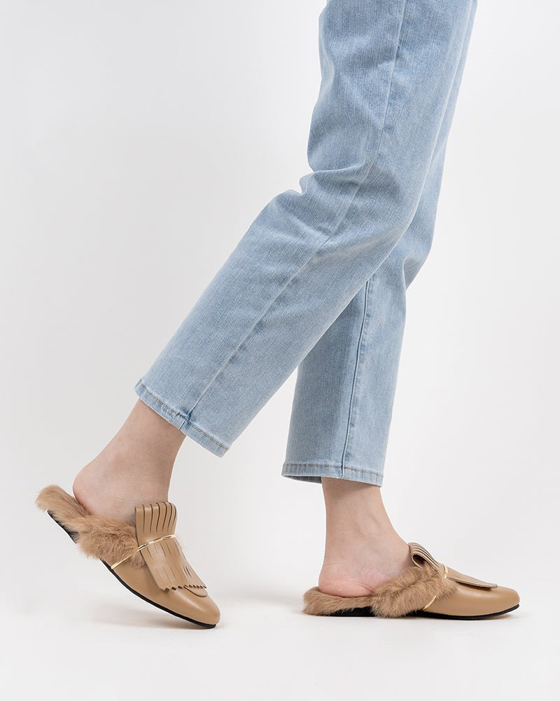 Tassel Fur Backless Slip On Buckle Flat Mules