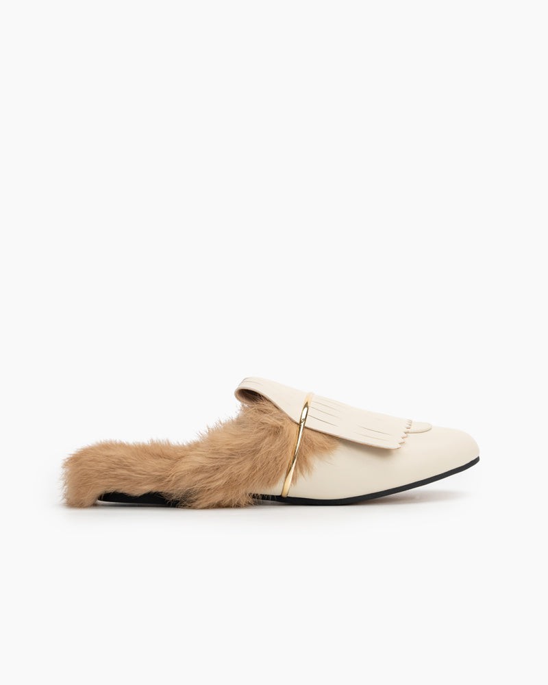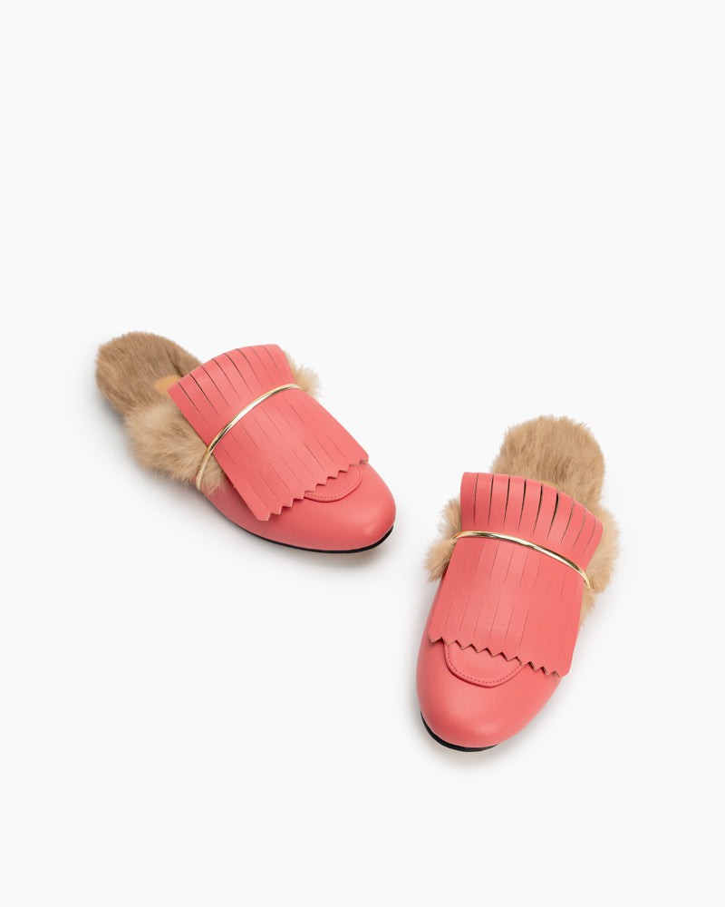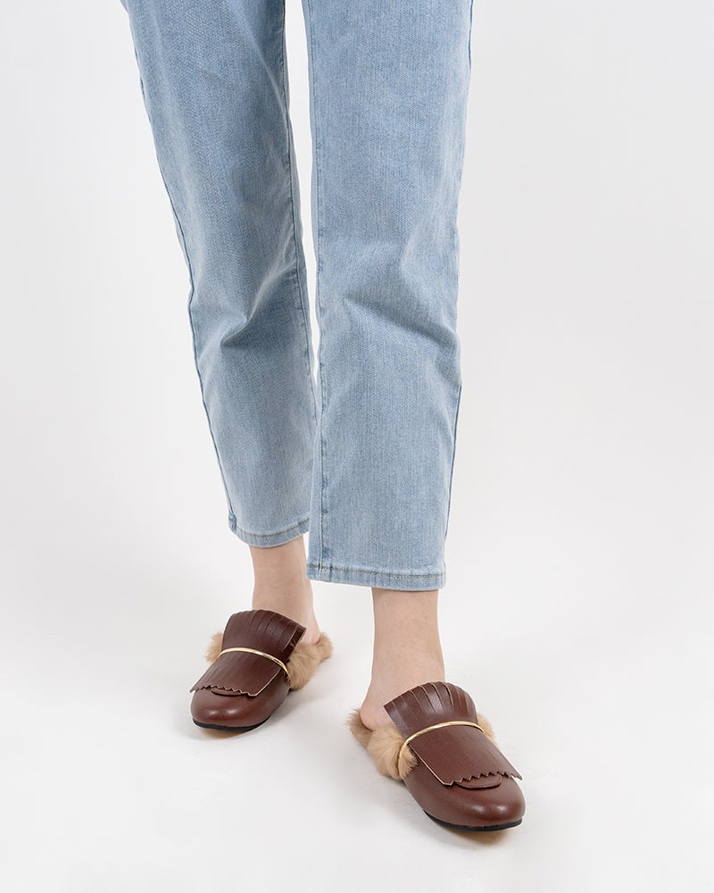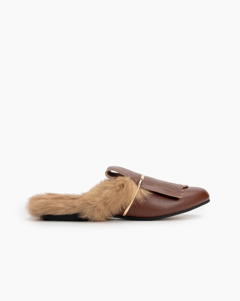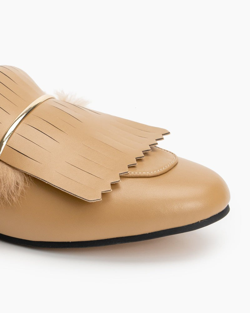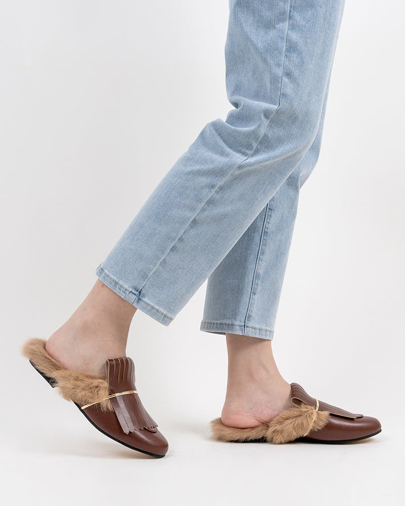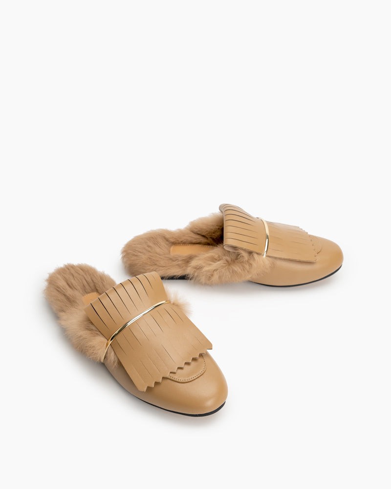 Tassel Fur Backless Slip On Buckle Flat Mules