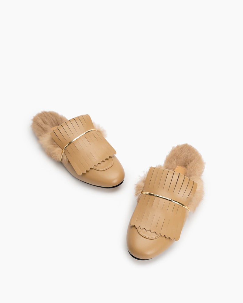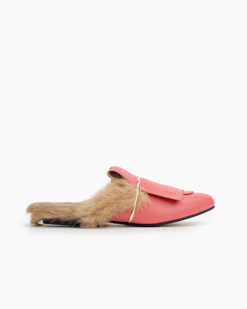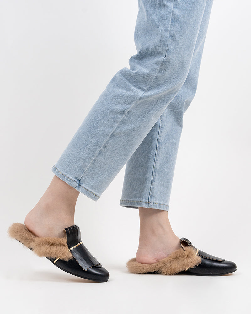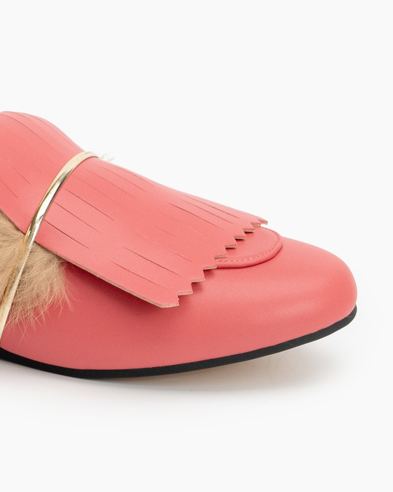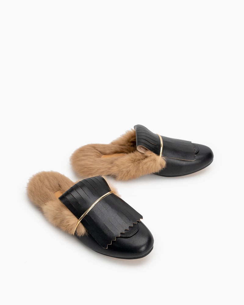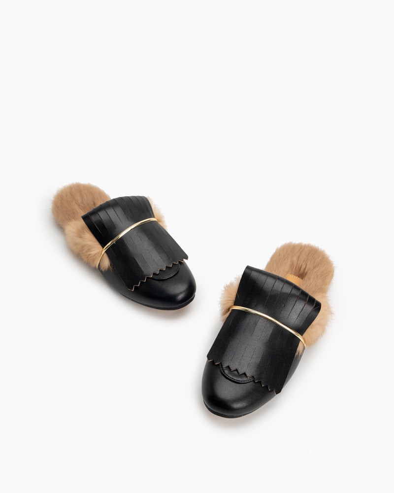 Tassel Fur Backless Slip On Buckle Flat Mules