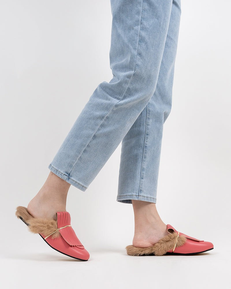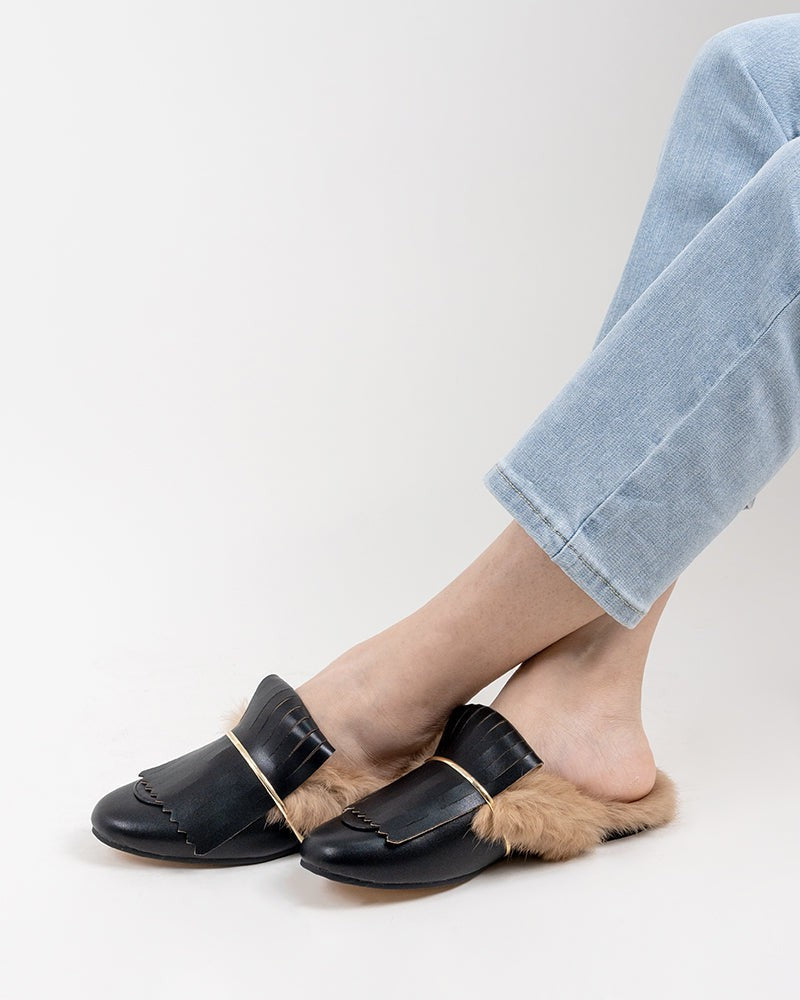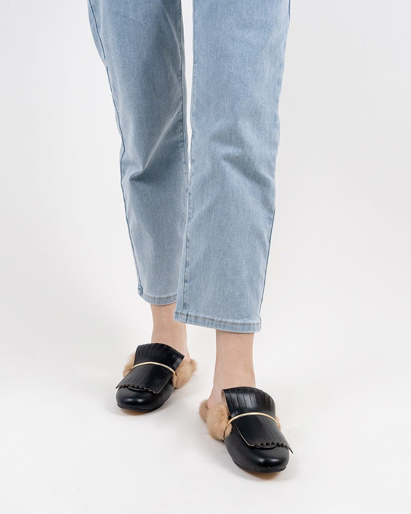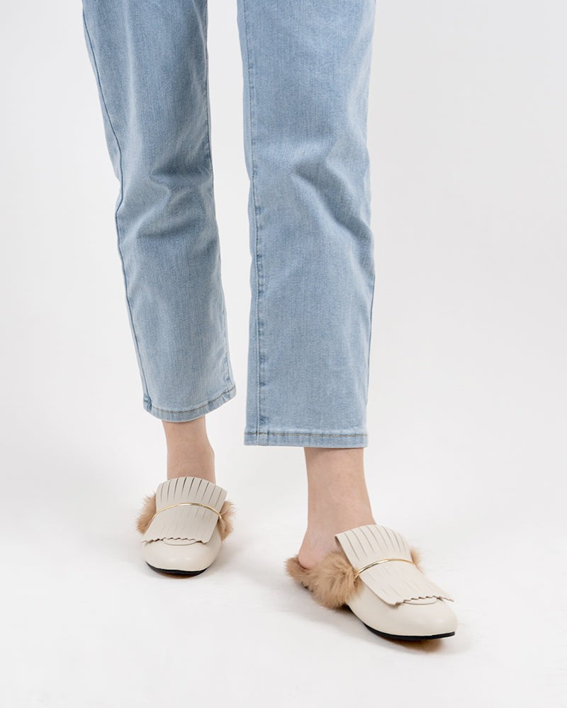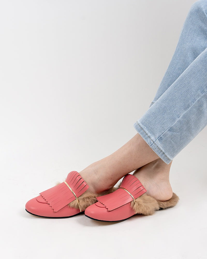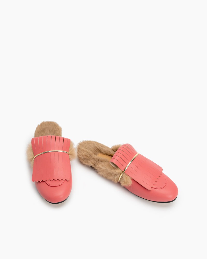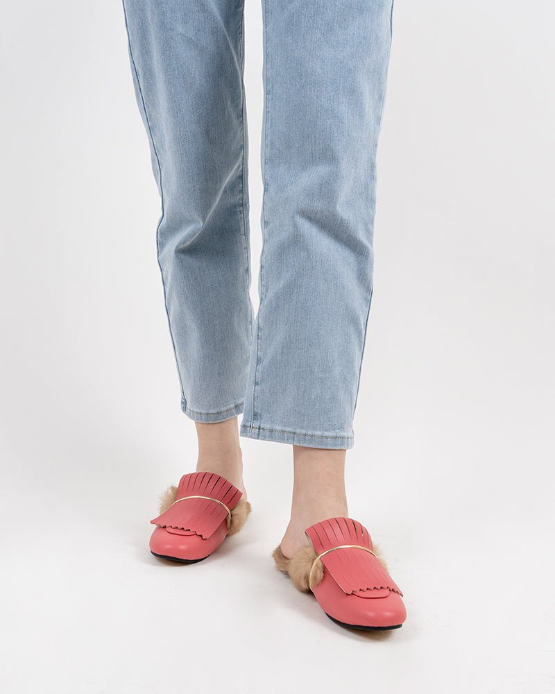 Tassel Fur Backless Slip On Buckle Flat Mules