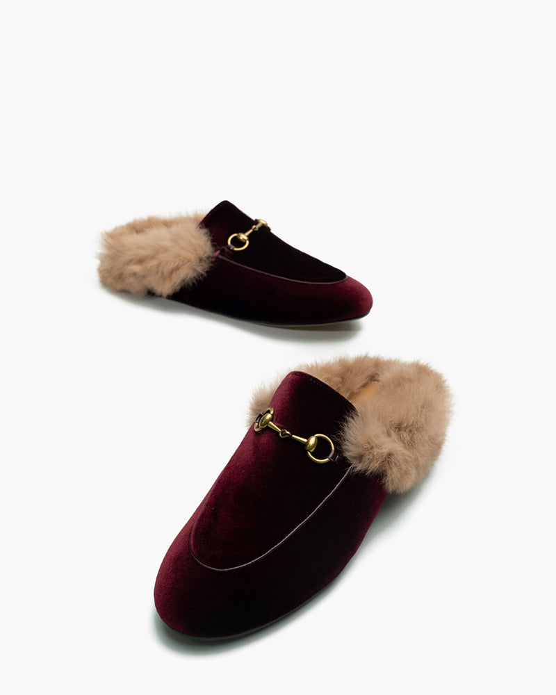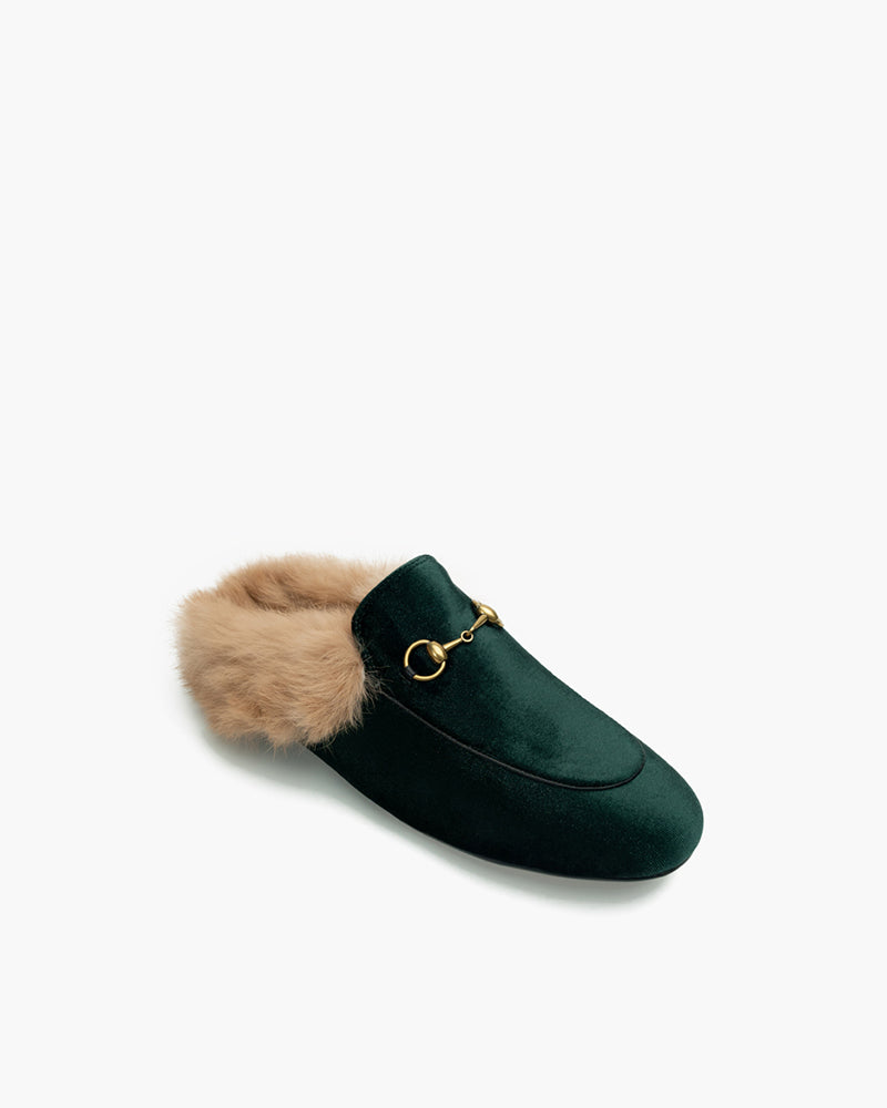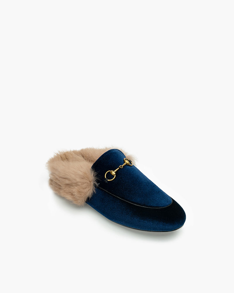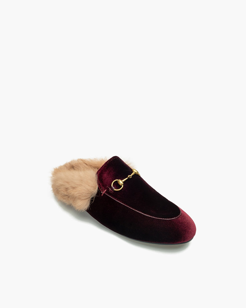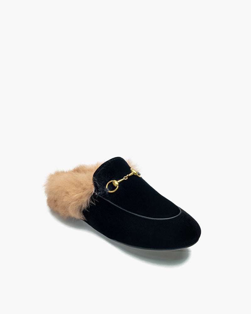 Velvet Backless Fur Horsebit Metal Slip-on Mules