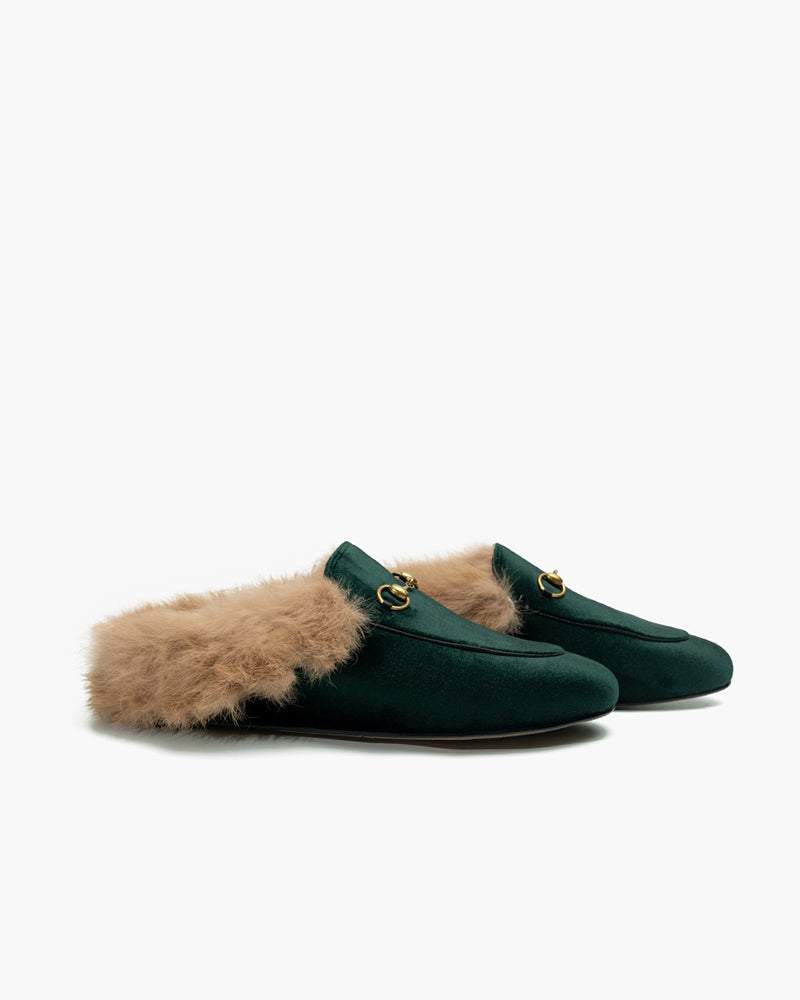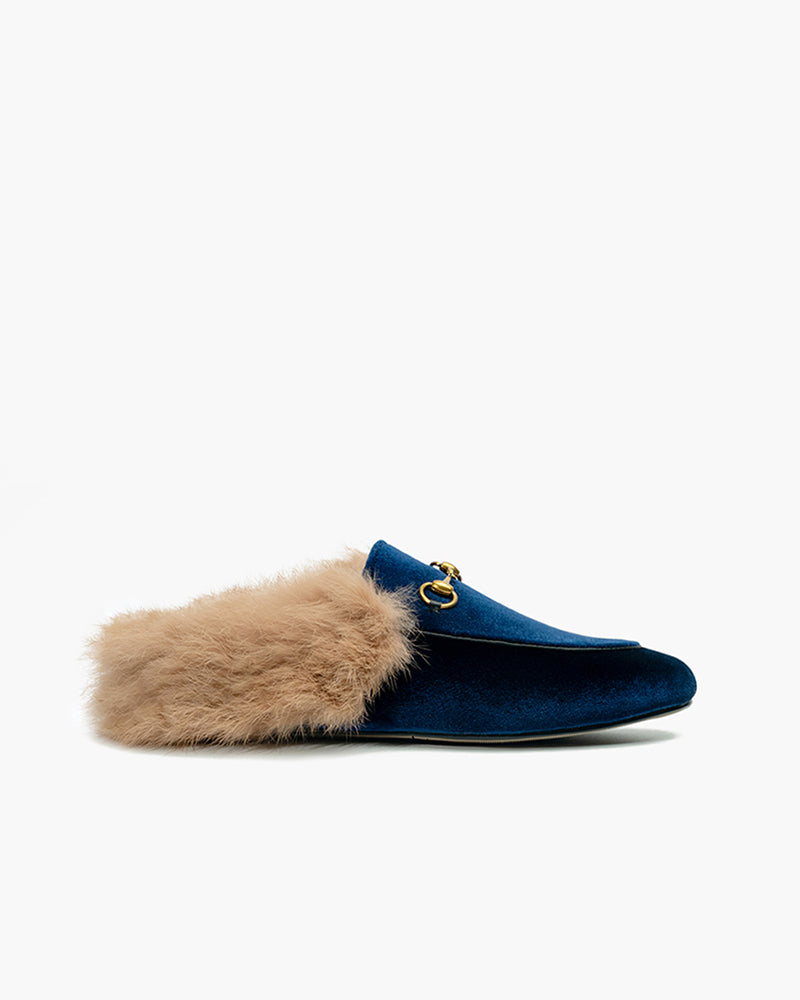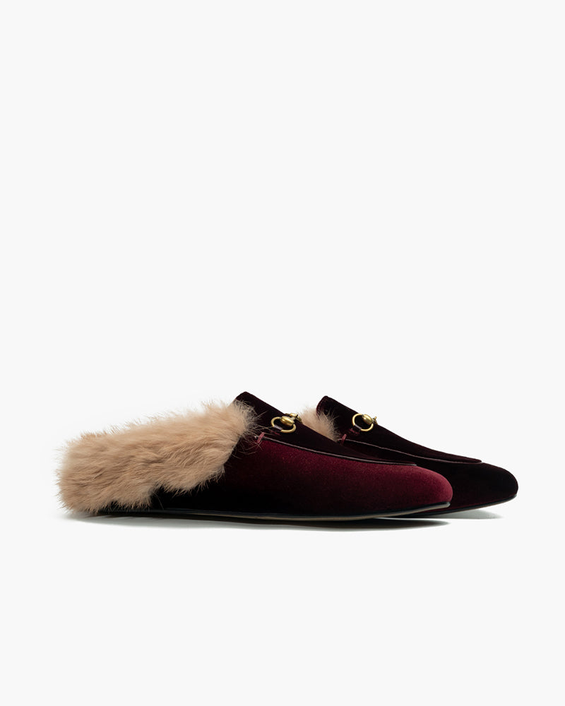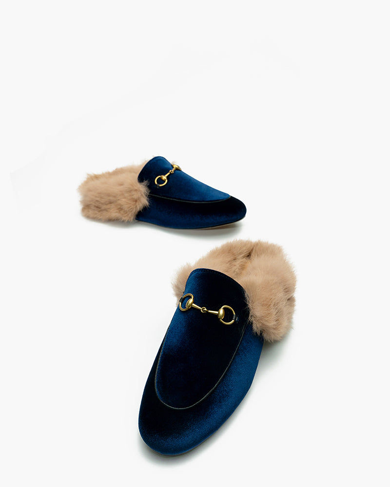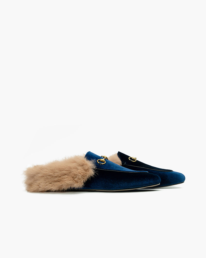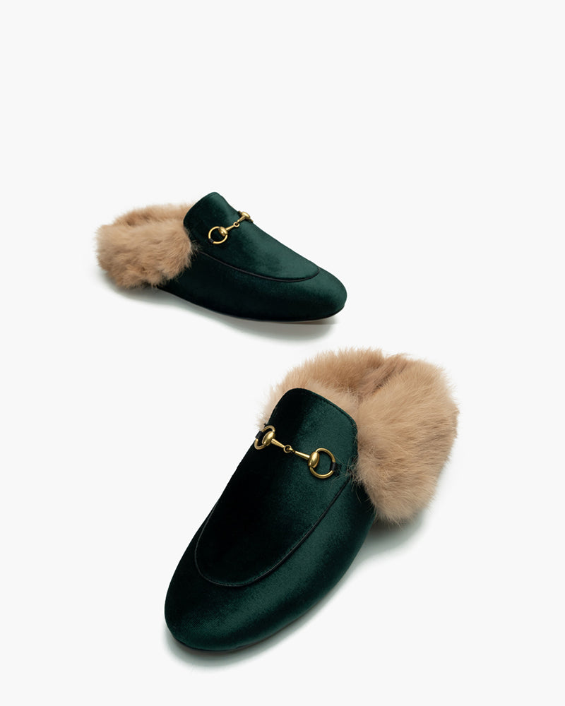 Velvet Backless Fur Horsebit Metal Slip-on Mules