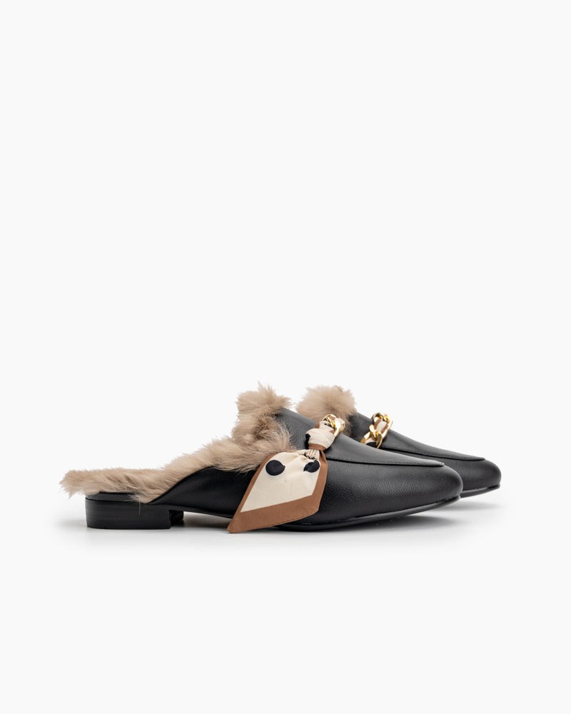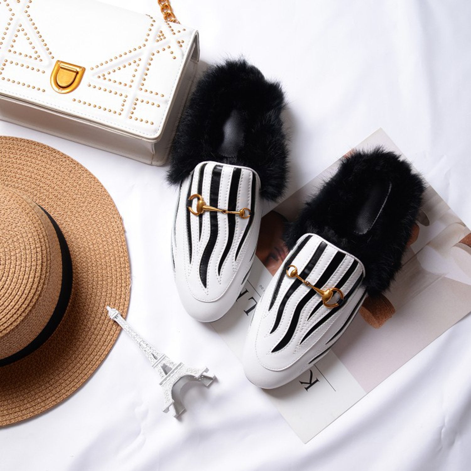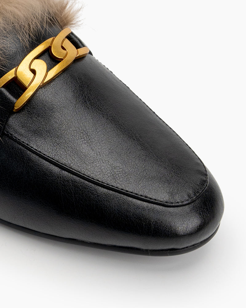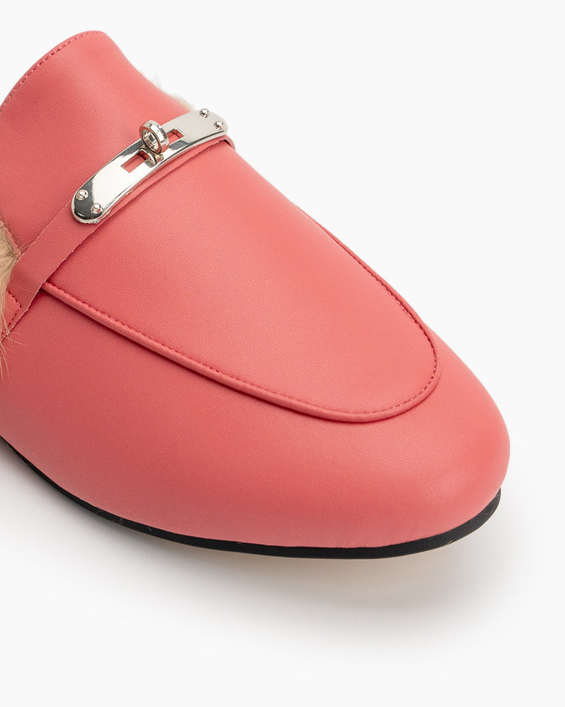 Classic Metal Buckle Backless Fur Flat Slippers Mules