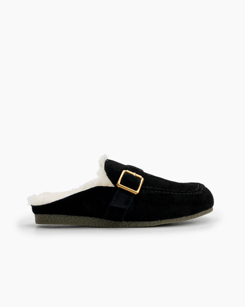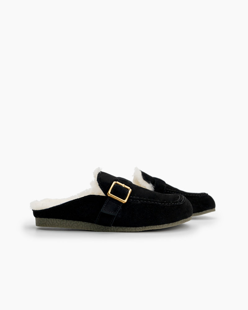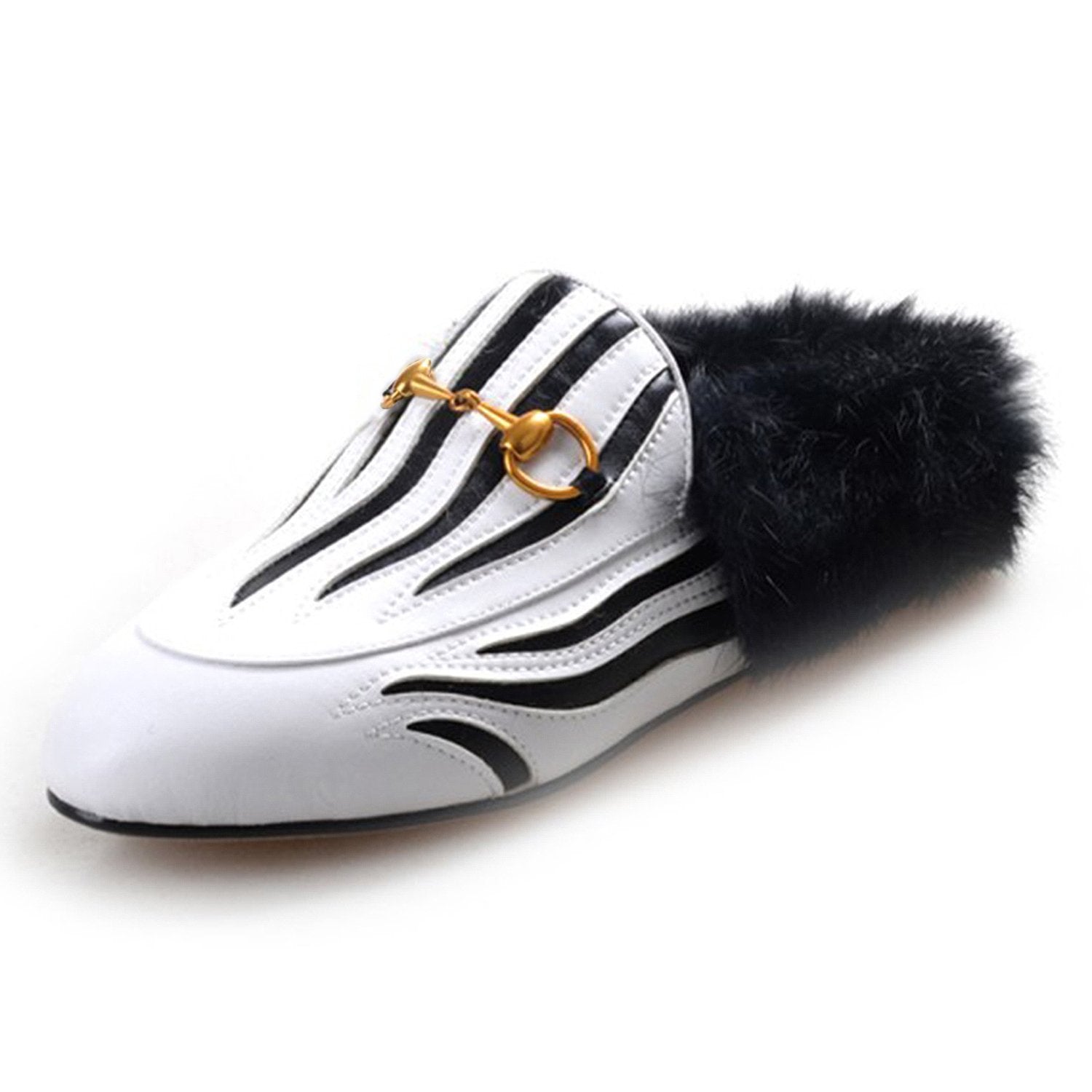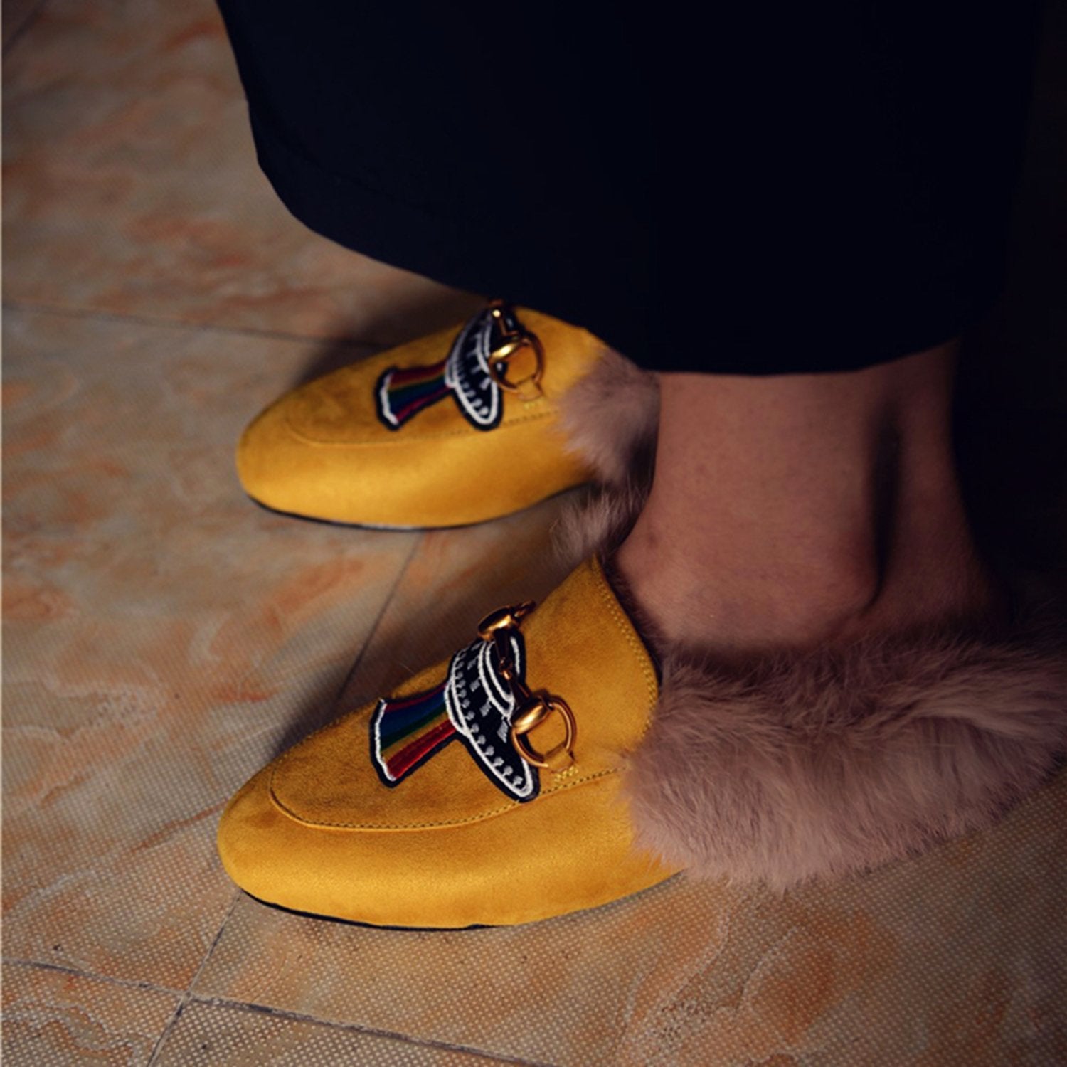 Classic Metal Buckle Backless Fur Flat Slippers Mules