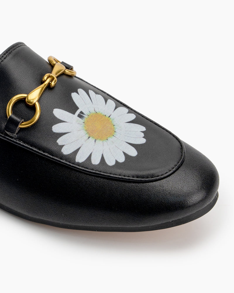 Classic Metal Buckle Flower Pattern Leather Slip On Backless Mules