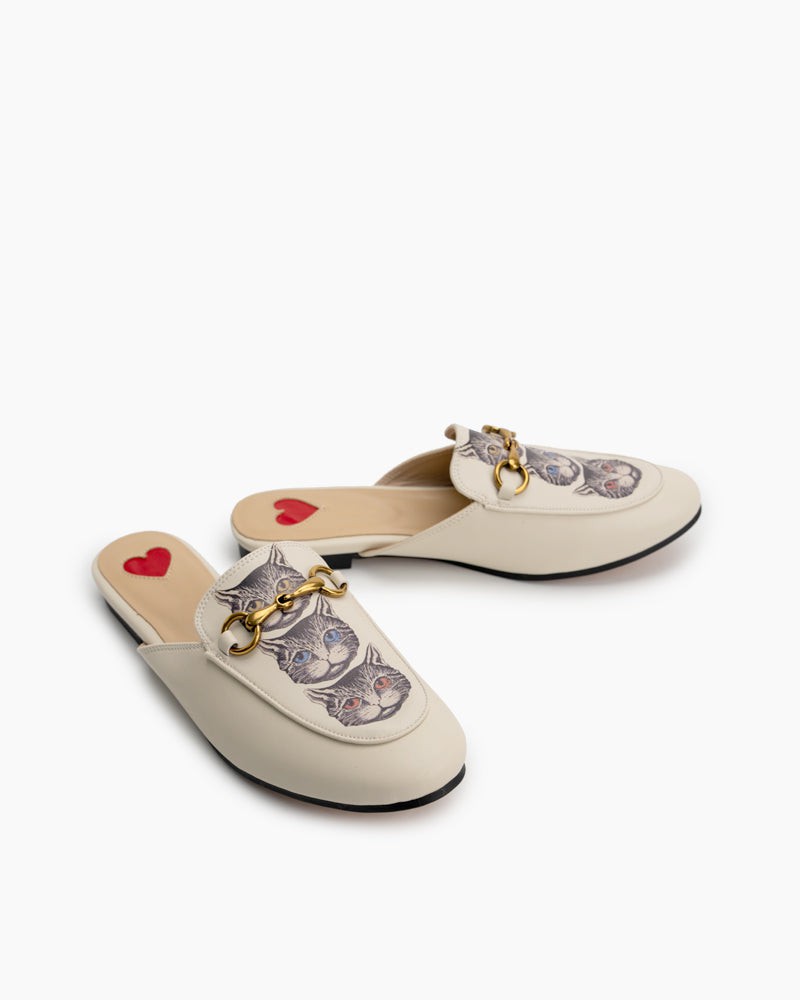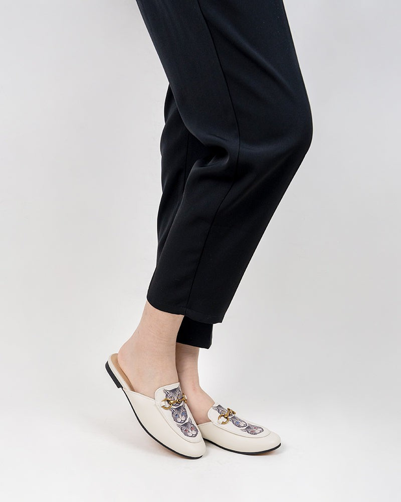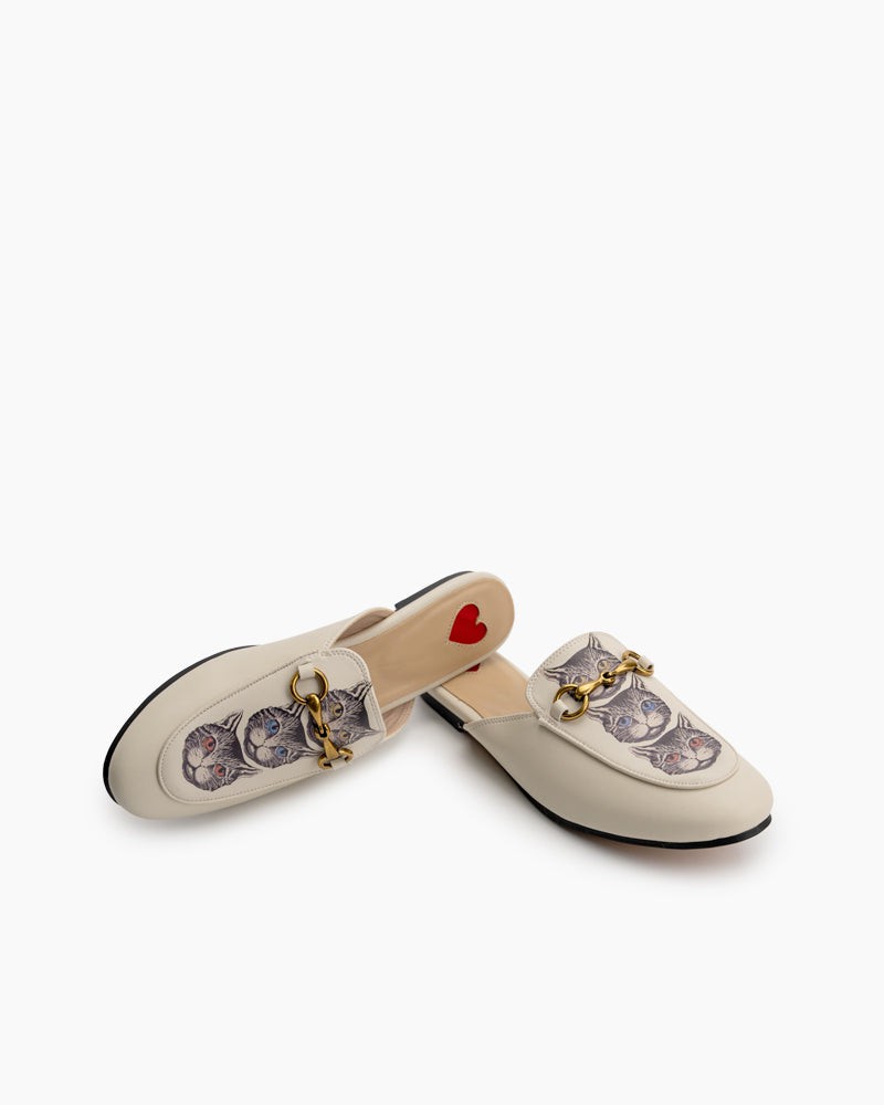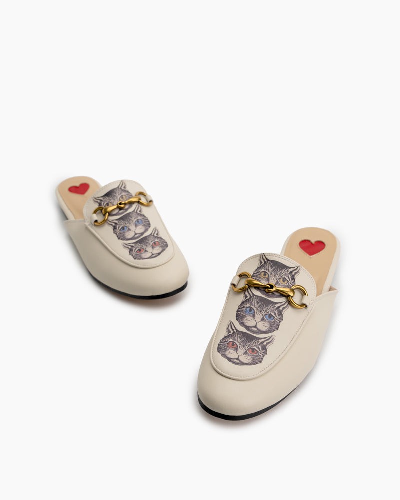 Classic Metal Buckle Cat Pattern Leather Slip On Backless Mules