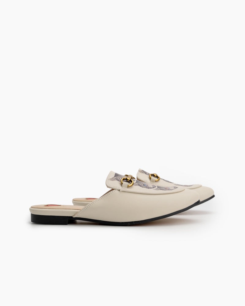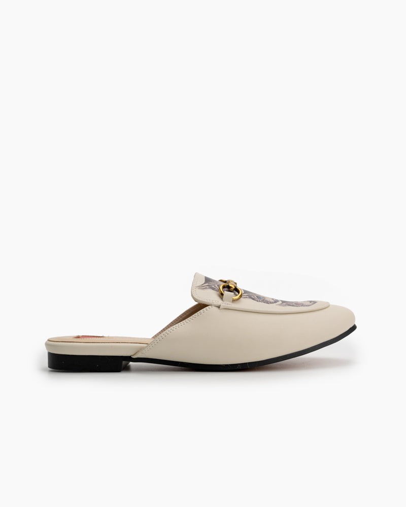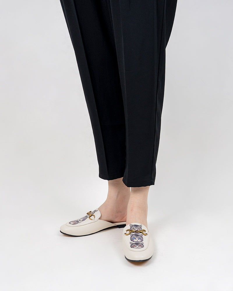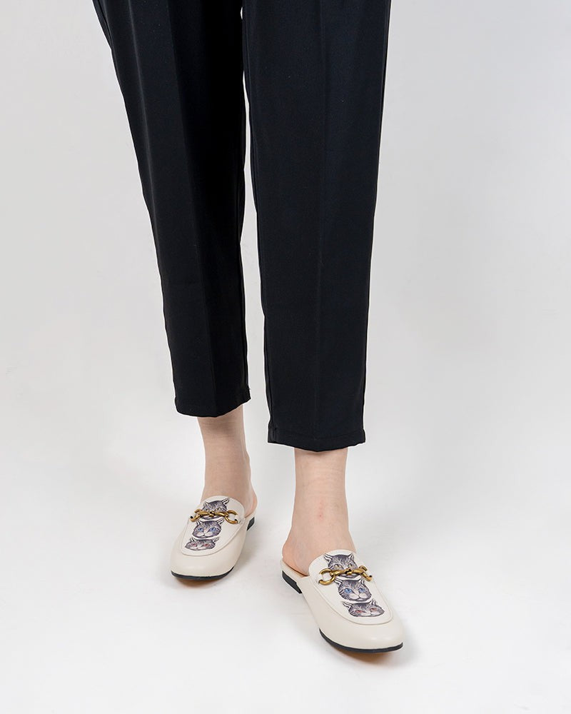Classic Metal Buckle Cat Pattern Leather Slip On Backless Mules