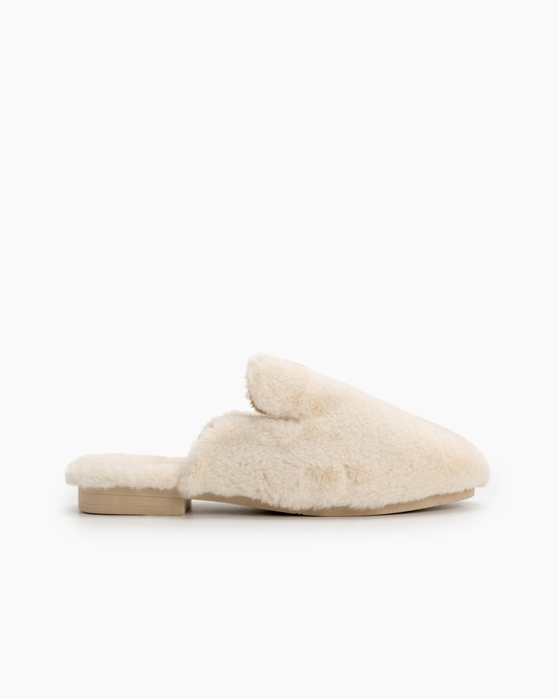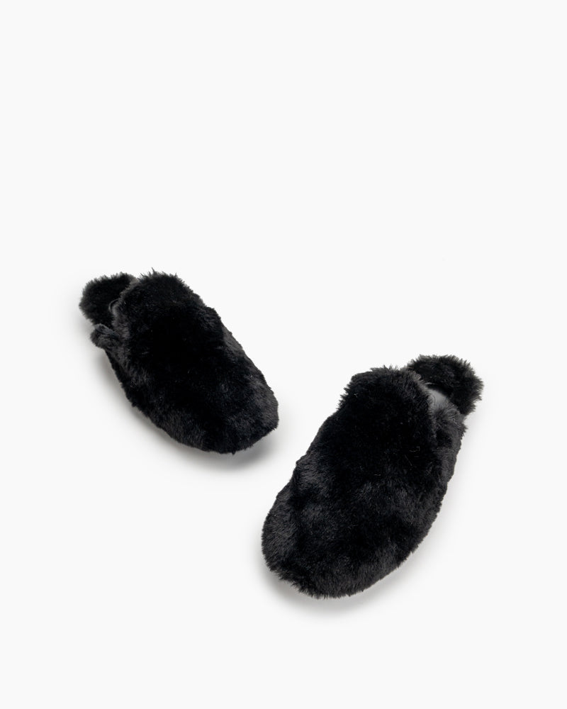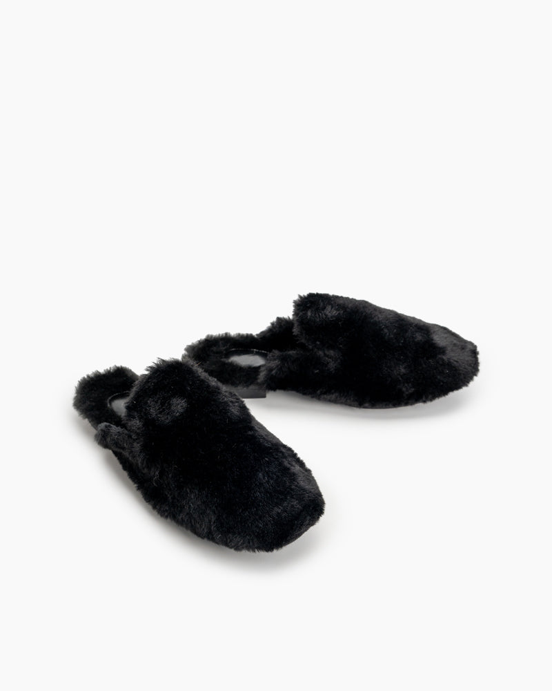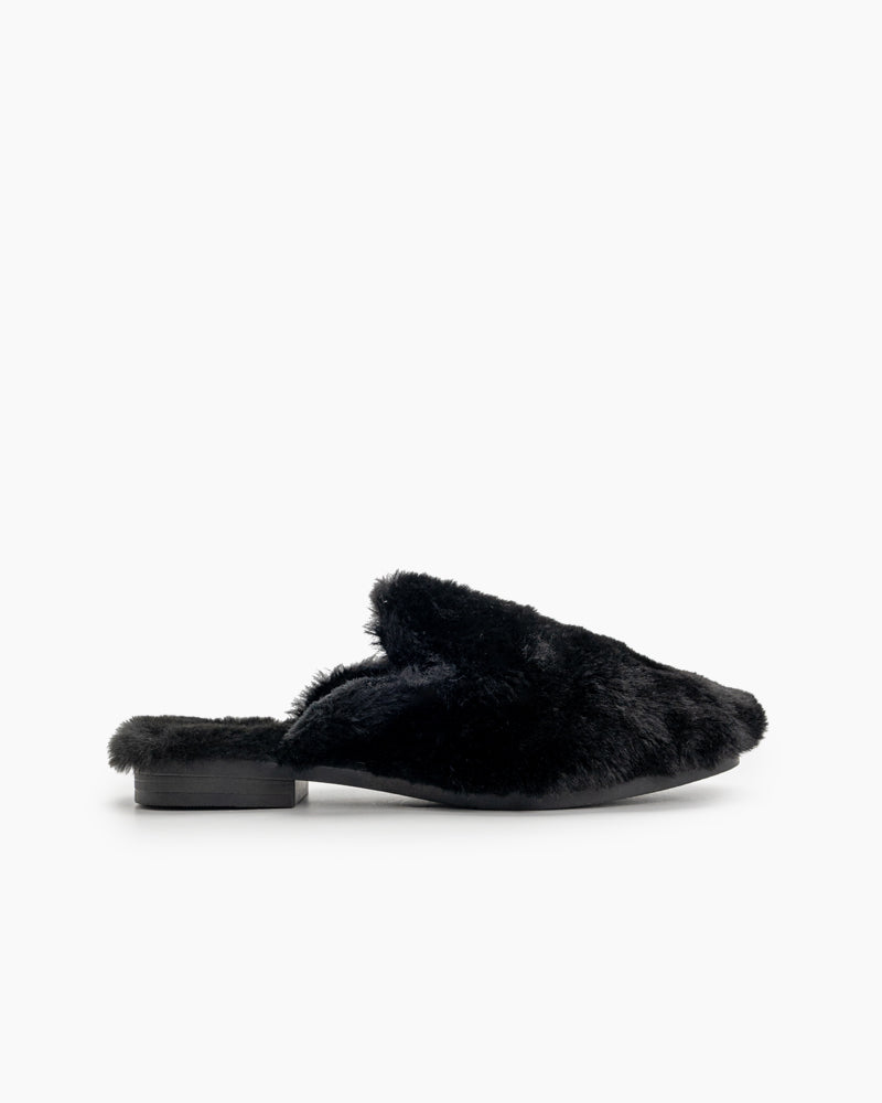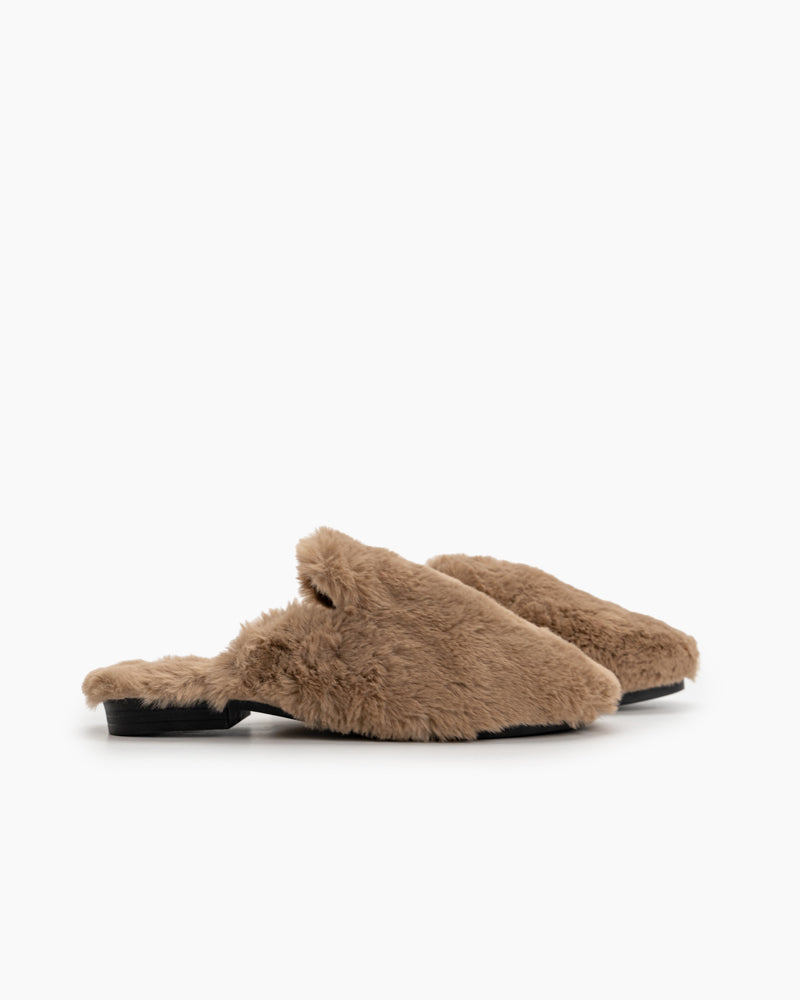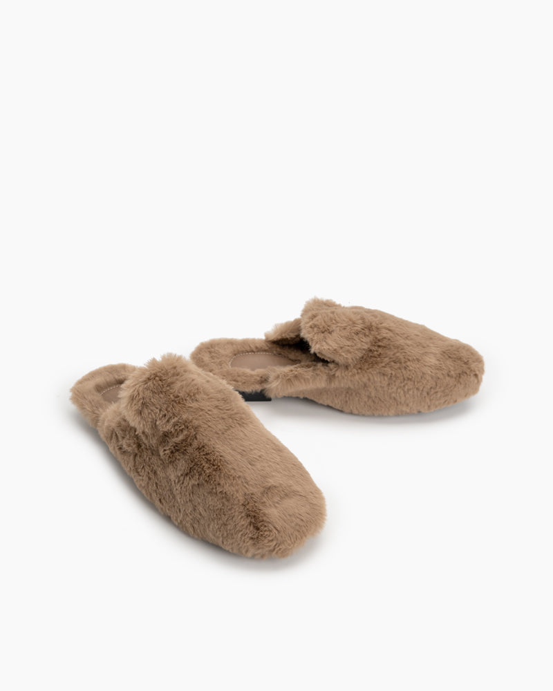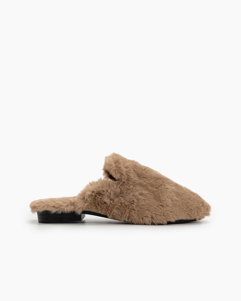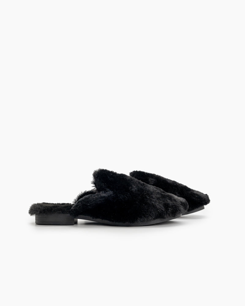 • Solid Color Round Toe Fur Backless Slip on Slides Mules